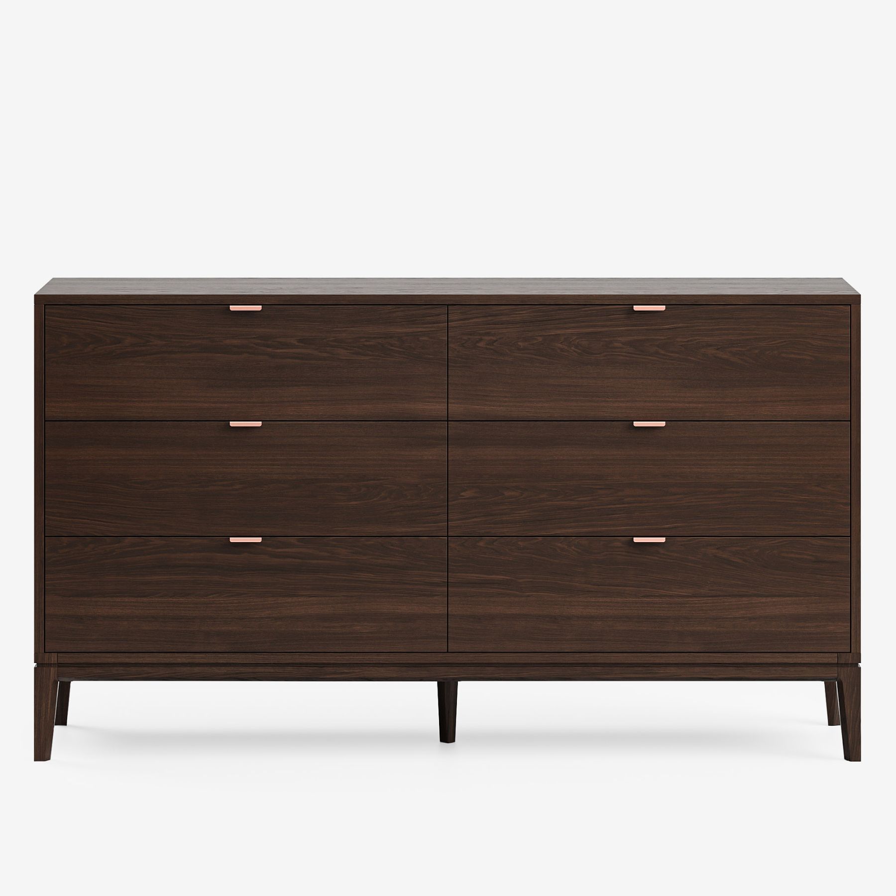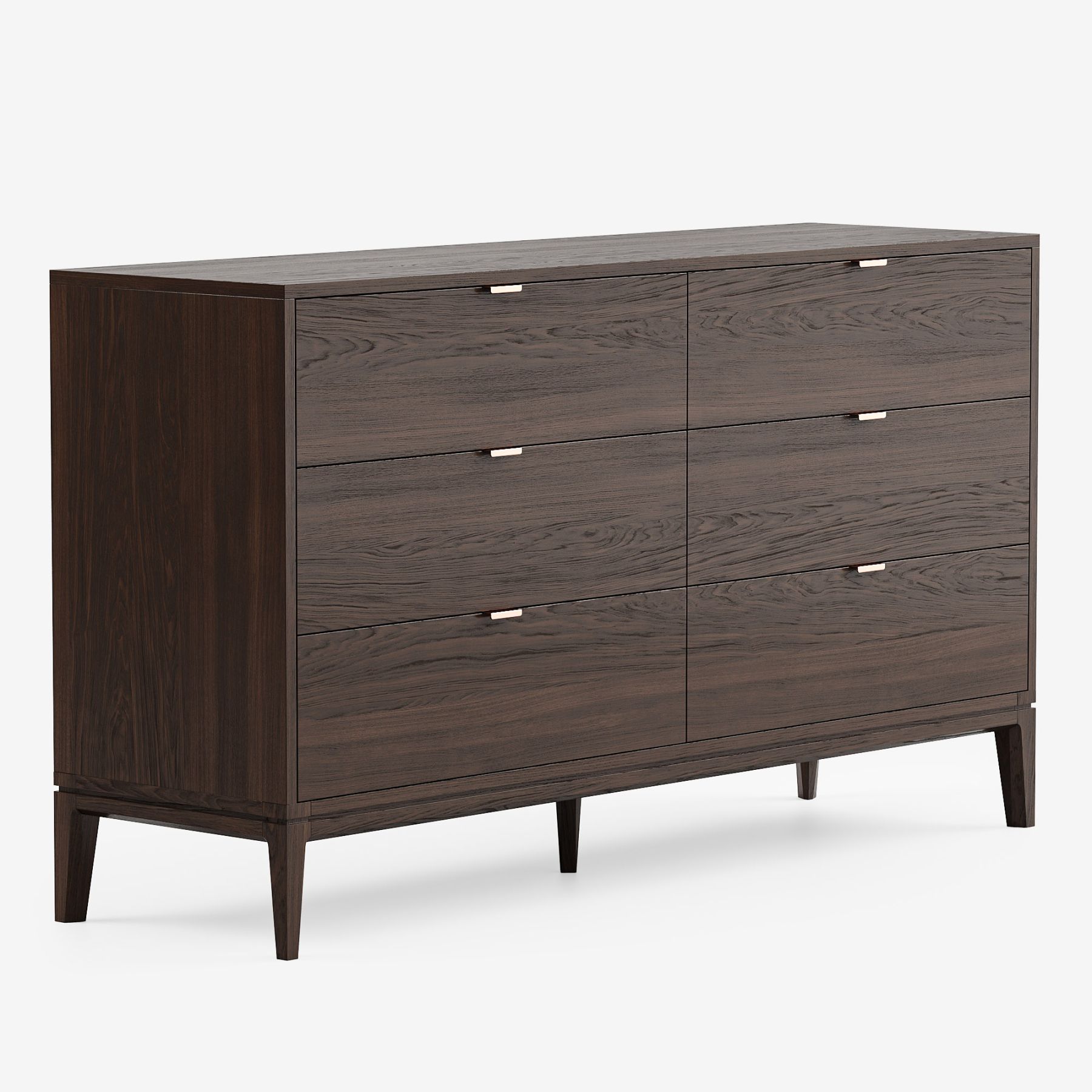 Комод с шестью выдвижными ящиками будет незаменим для хранения вещей в спальне и других помещениях. Прочные и вместительные ящики из ЛДСП, которые выдерживают вес до 25 кг, помогут использовать пространство максимально эффективно, а фасады с объемной гравировкой и изящные ножки из массива дуба непременно украсят ваш интерьер.