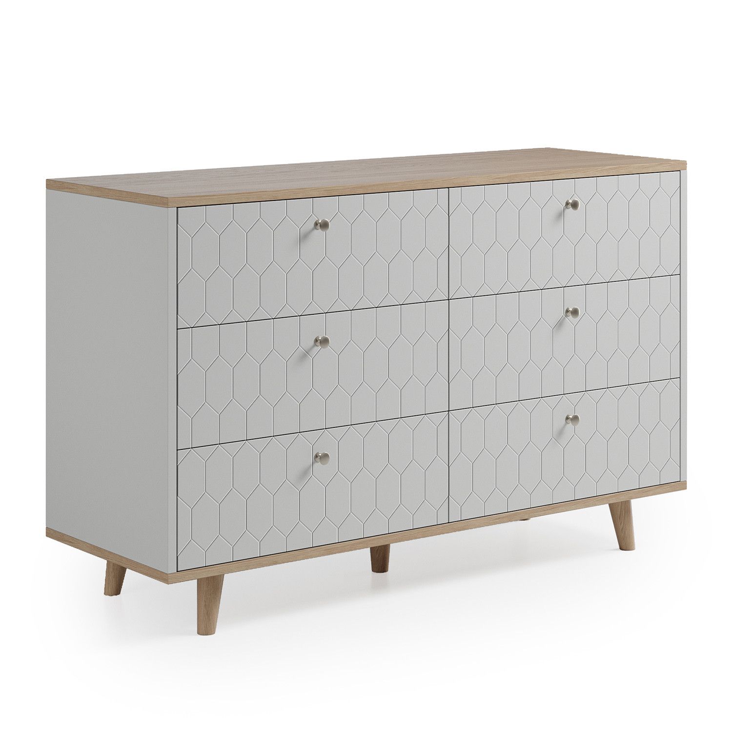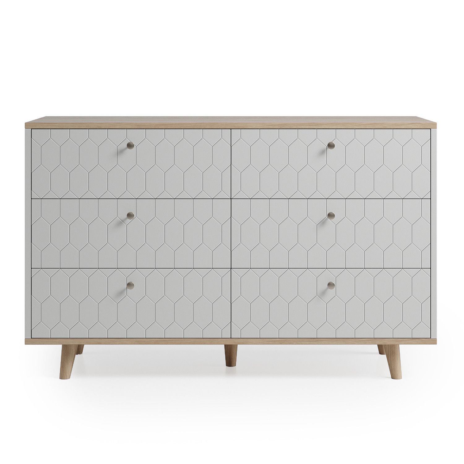 Комод поможет правильно организовать хранение вещей и станет украшением любого интерьера. Комод отличается высокой функциональностью за счет вместительных ящиков из прочного ЛДСП, которые уверенно выдержат нагрузку до 25 кг и способны вместить достаточно объемные вещи. Продуманные габариты ящиков позволяют использовать пространство максимально эффективно и разместить все необходимые вещи. Объемная гравировка на фасадах, благородная текстура дуба на столешнице и основании дополняют сдержанный стиль комода.