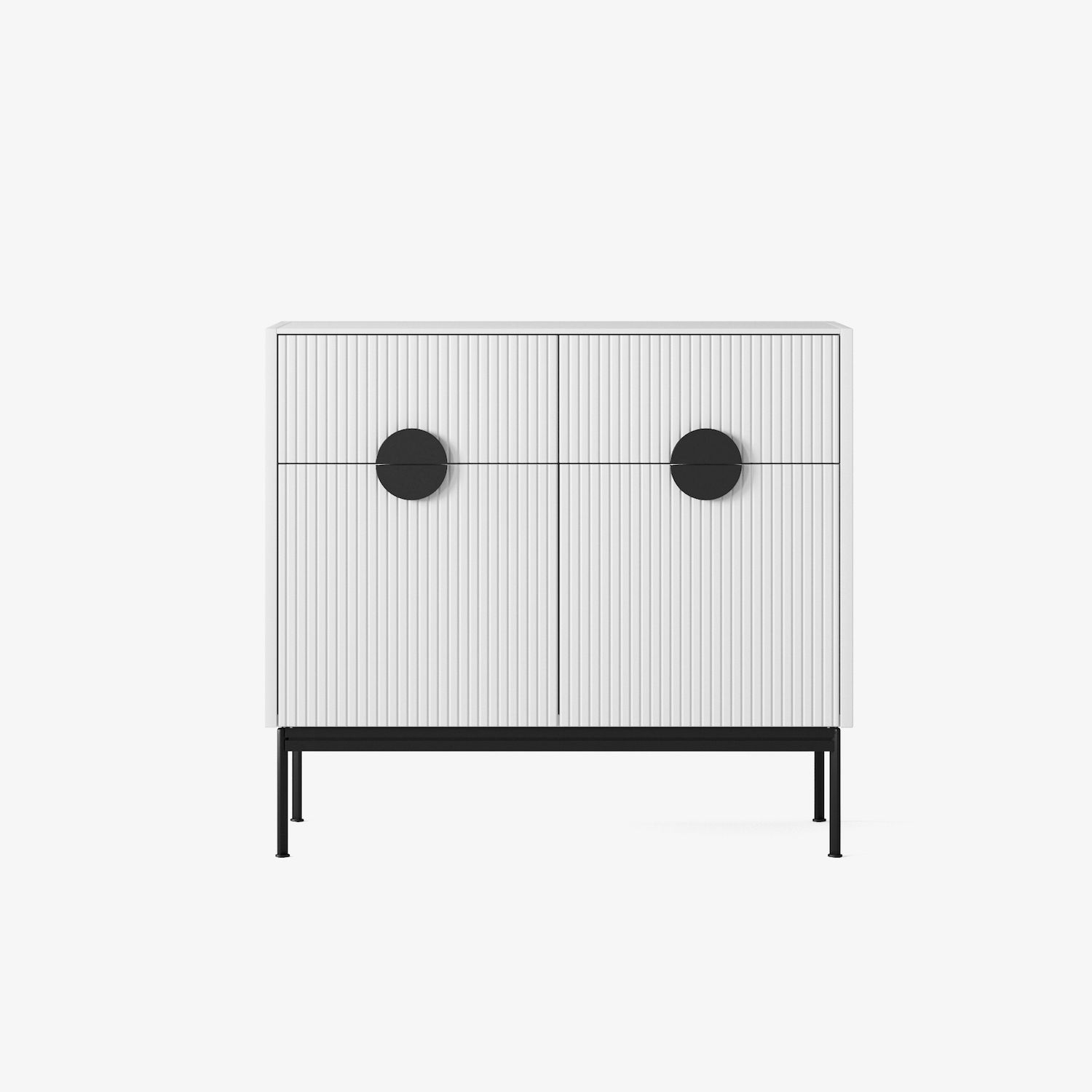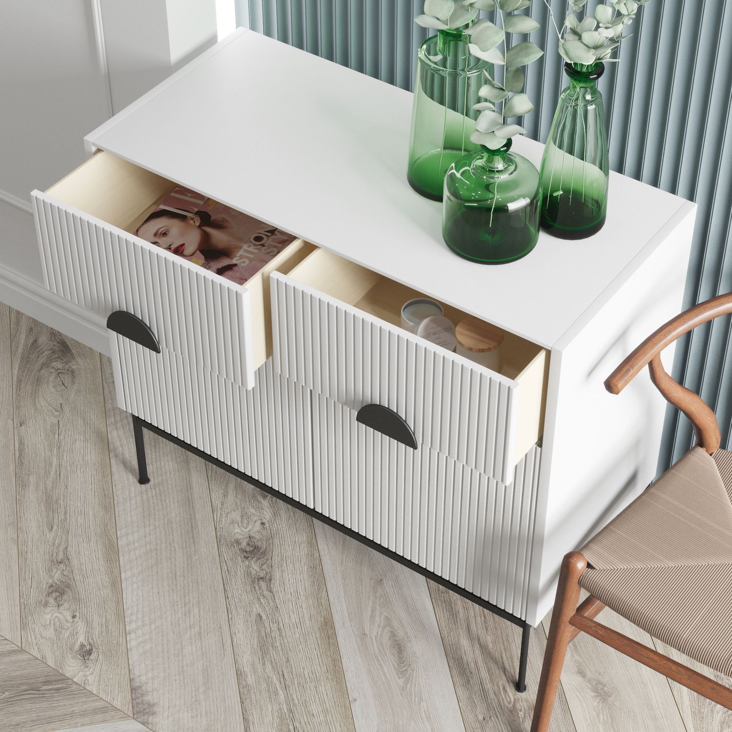 Оснащение комода: 2 выдвижных ящика с доводчиками и 2 распашных фасада. Корпус-белая эмаль Ral 9003