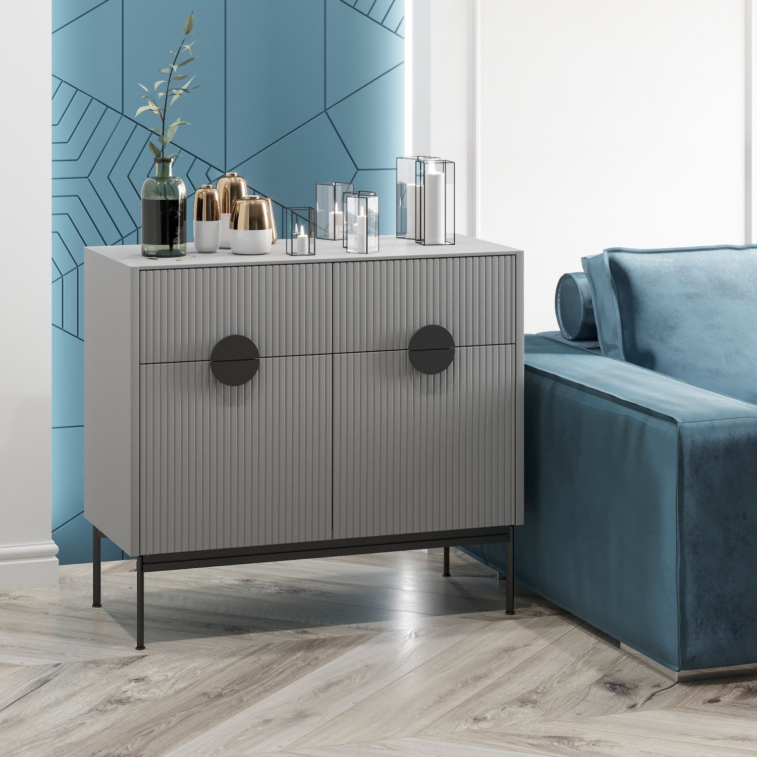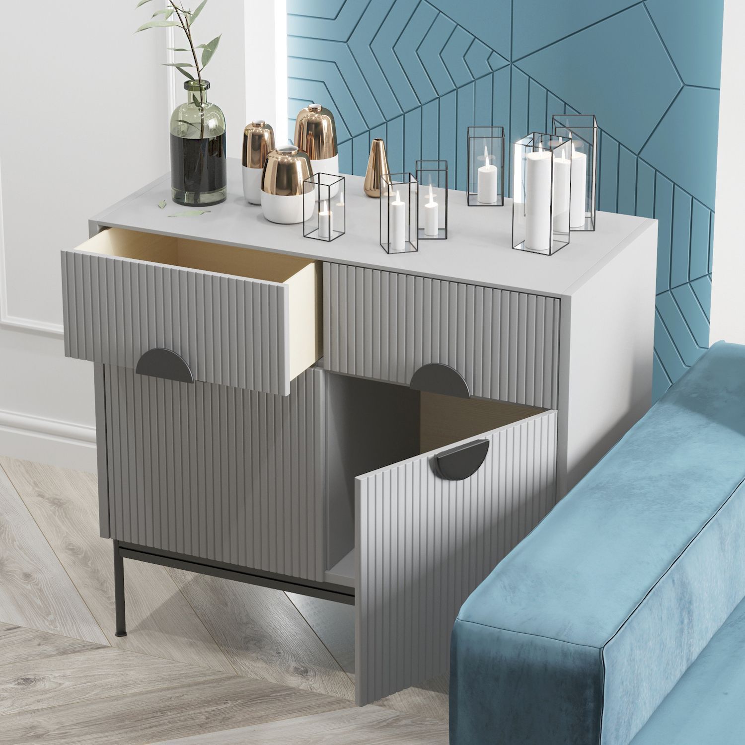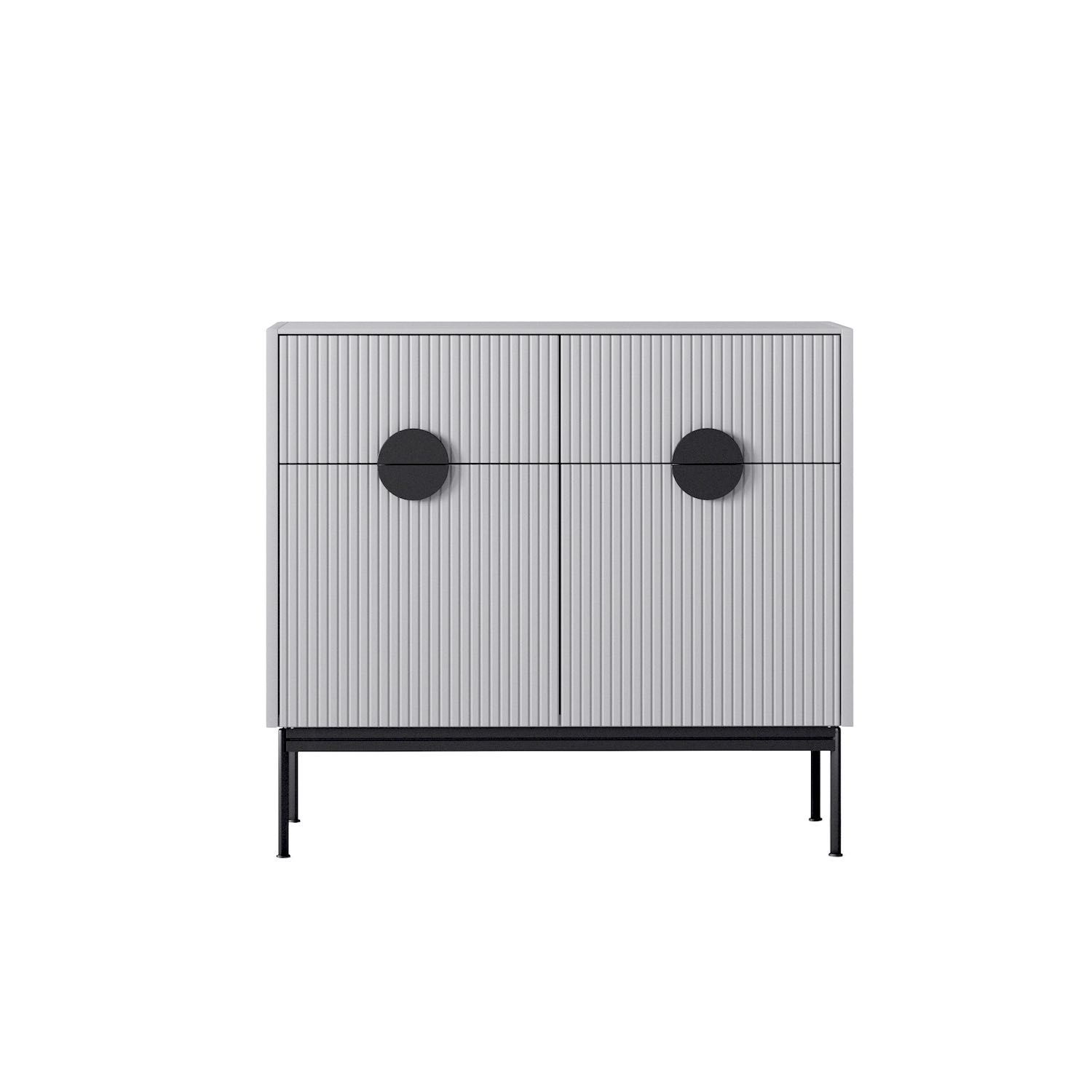 Оснащение комода: 2 выдвижных ящика с доводчиками и 2 распашных фасада. Корпус-светло-серая эмаль Ral 7047