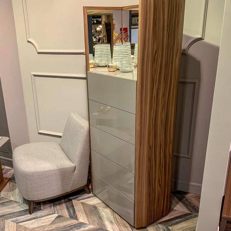 Высокий комод с пятью ящиками из современной коллекции Avila от бренда MOD Interiors. Комод трансформируется — слева и справа есть «крылья» с зеркалами, которые могут раскрываться и открывать доступ к боковым модулям с крючками.
