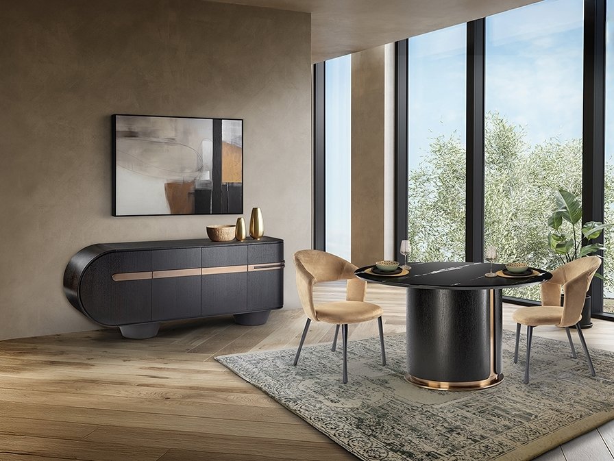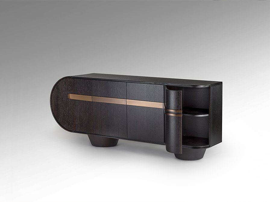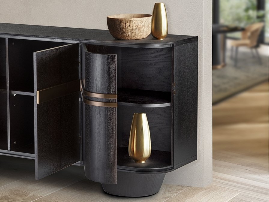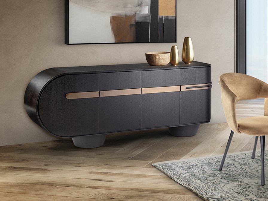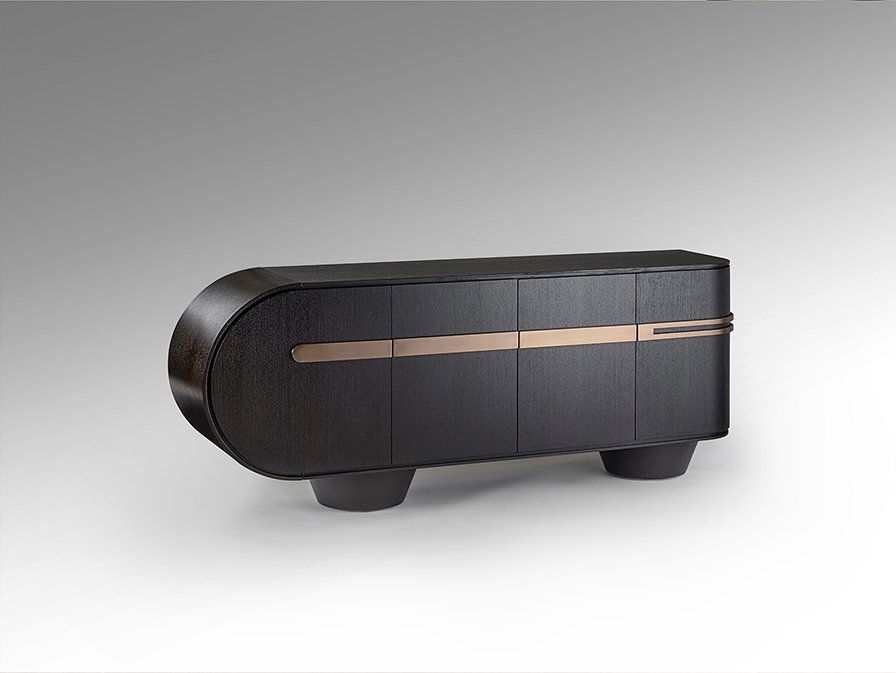 Комод с 4 дверцами, изготовлен из МДФ, шпонированного темным дубом, с фурнитурой и металлическими деталями из нержавеющей стали с покрытием цвета розового золота.