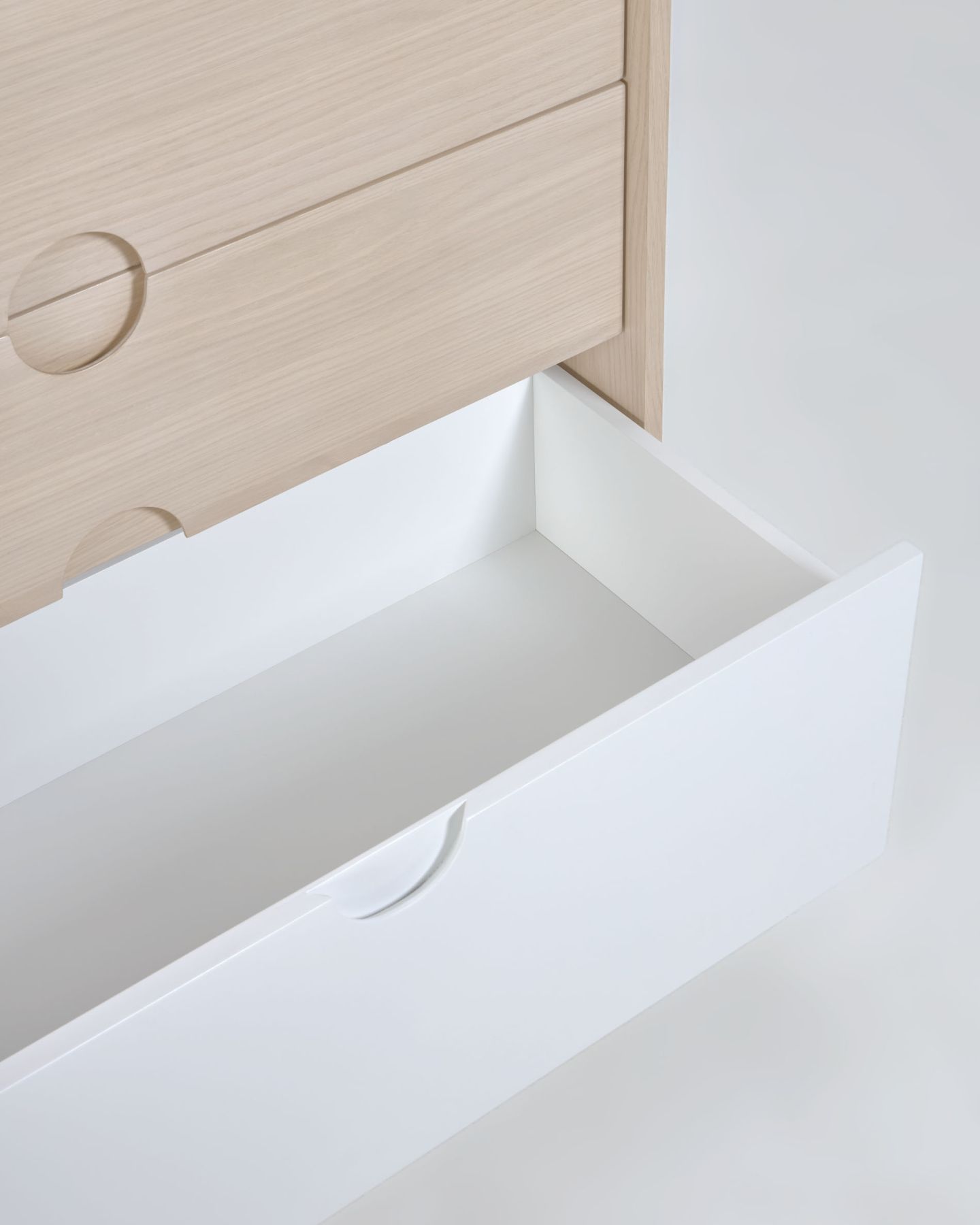 Комод Nunila отлично подойдет для детской комнаты, так как полностью изготовлен из натуральной древесины. Его универсальный и ненавязчивый дизайн будет гармонировать с любым интерьером, а декоративная белая отделка добавит стиля и уникальности детскому пространству. Также комод Nunila будет хорош для любой комнаты, для каждого члена семьи. Оцените это!