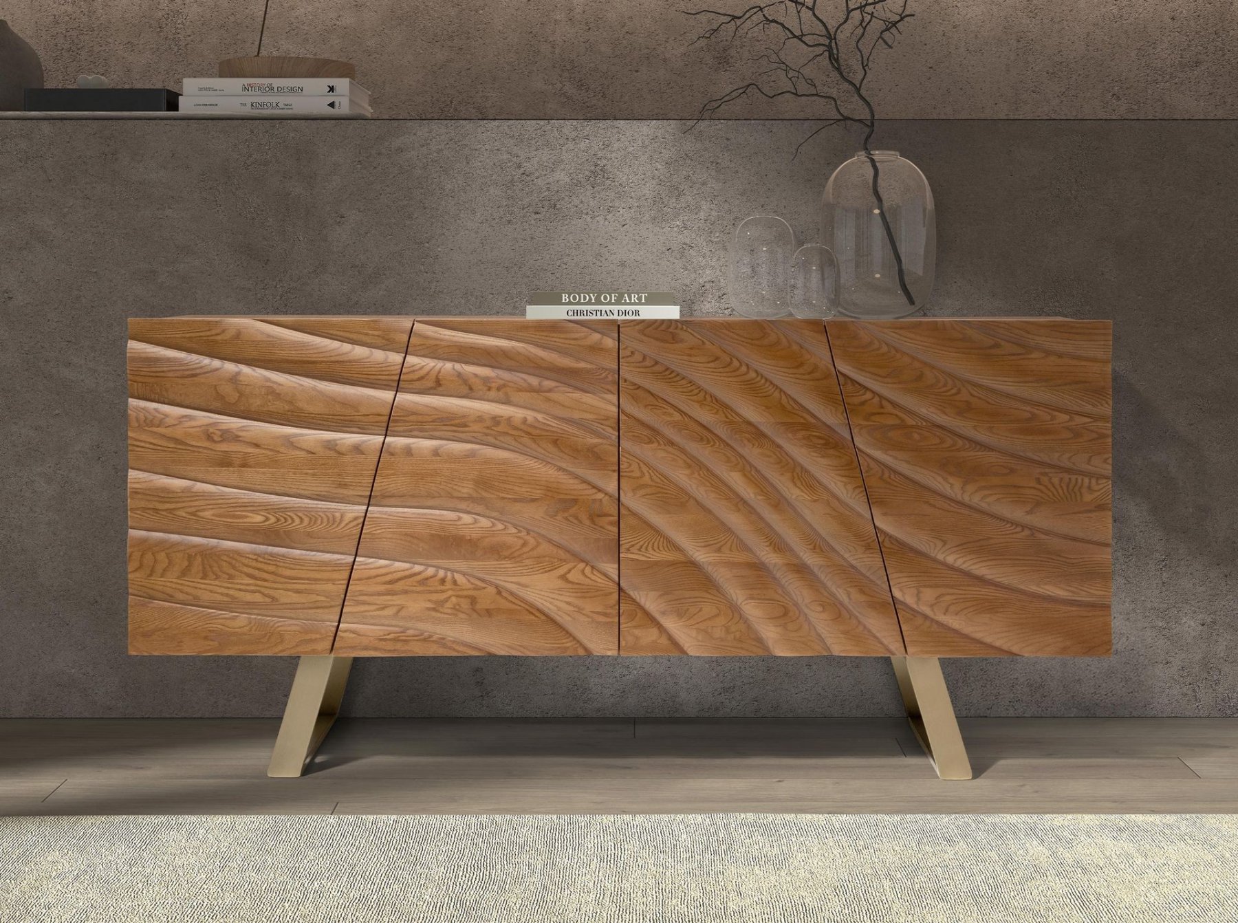 Современный буфет с каркасом из натурального светлого орехового шпона и оригинальными полированными ножками из нержавеющей стали с золотистым покрытием. Он отличается вместительным пространством для хранения благодаря четырем дверцам из светлого орехового дерева, оснащенным механизмом открывания и закрывания с помощью ручек.