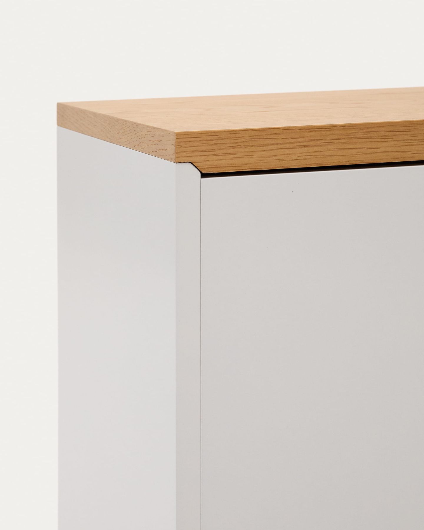 Стеллаж изготовлен и дубового шпона (верхняя панель) и МДФ белого цвета.
