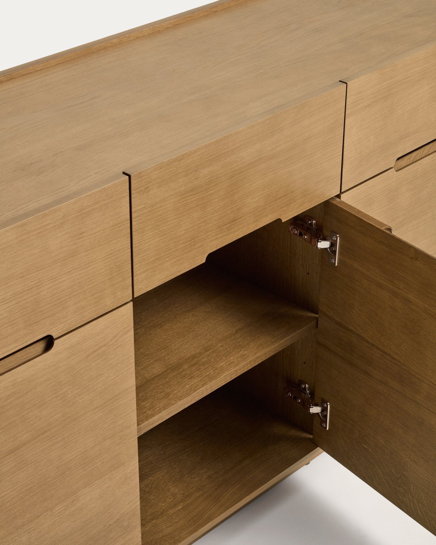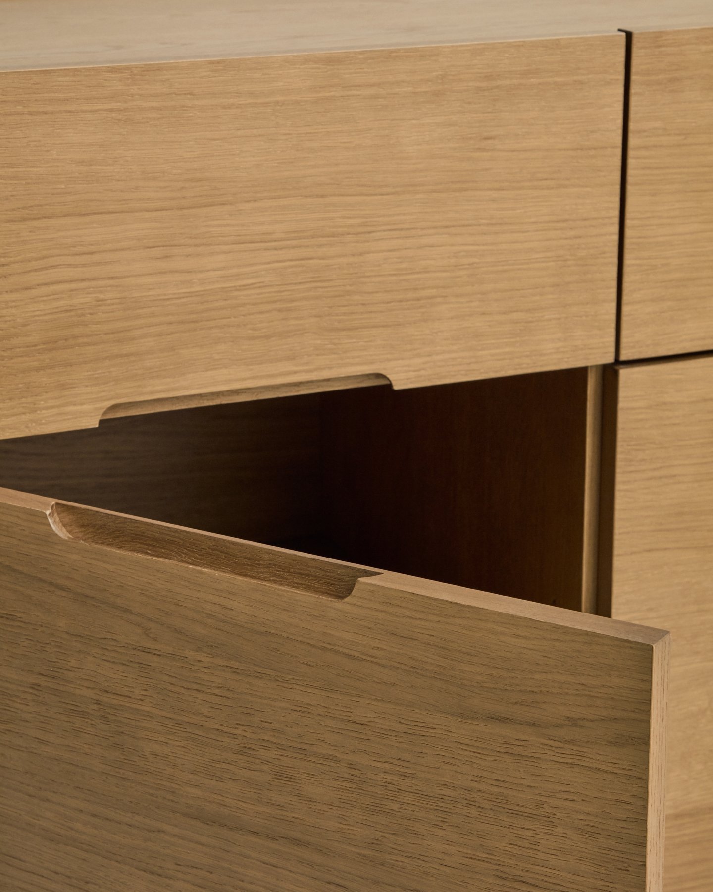 Коллекция Arelida изготовлена из дубового шпона и массива дуба с коричневой отделкой, которая подчеркивает текстуру и рисунок древесины, придавая каждому изделию теплоту и сбалансированный вид. Плавные линии и закругленные края определяют изысканный дизайн, приятный на ощупь. Она оснащена системой плавного закрывания и регулировочными элементами на основании для выравнивания неровностей пола. Локальное производство в Европе и ручная работа способствуют снижению выбросов CO₂ и обеспечивают более экологичное производство.