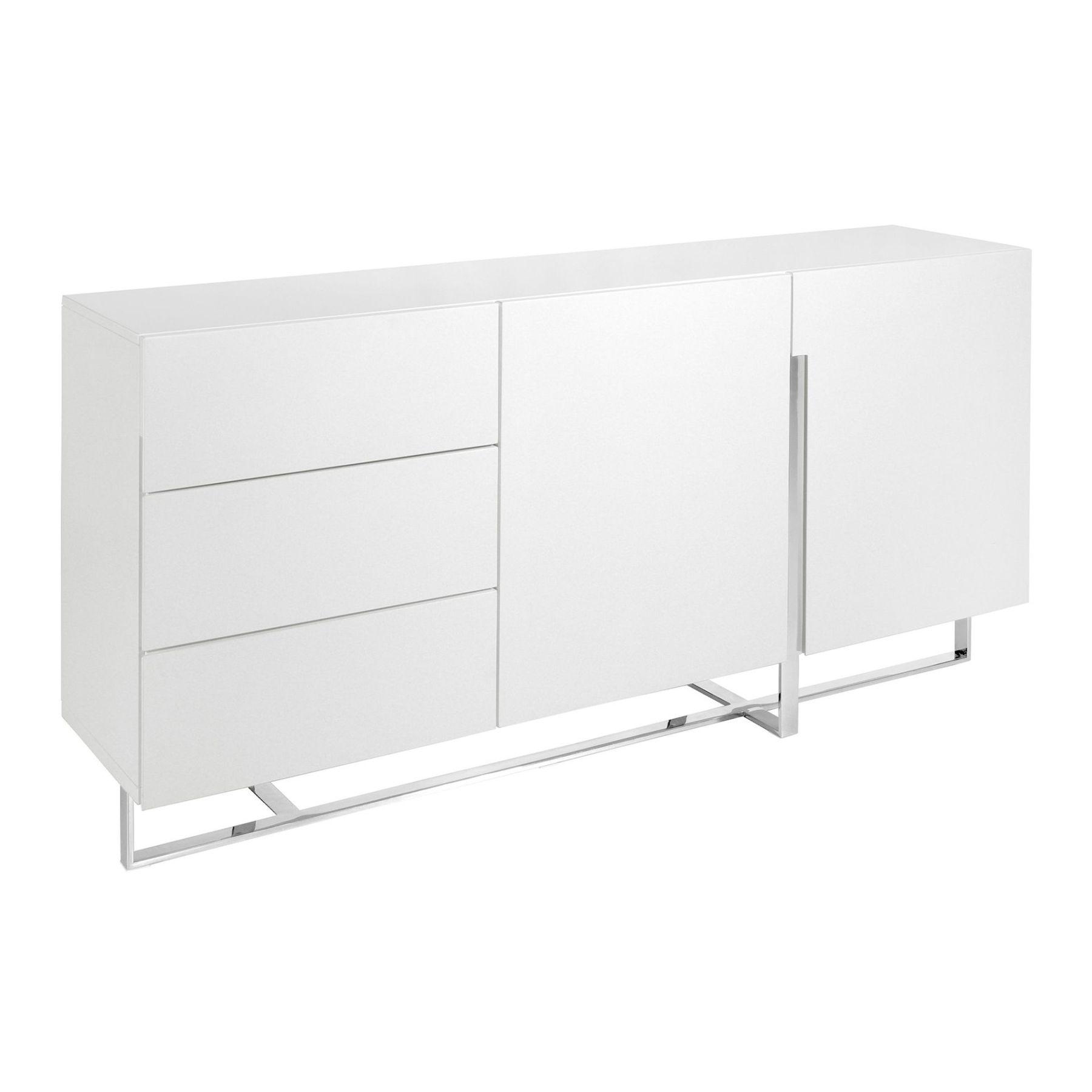 Сервант имеет прямоугольную форму. Каркас визуально поделен на две половины. Слева — три выдвижных ящика одинаковой высоты, а справа — распашные двери, за которыми четыре полки одинакового размера. Ручки отсутствуют, вместо них предусмотрены доводчики.