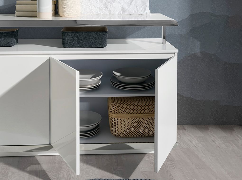 Сервант прямоугольной формы, выполнен из лакированного МДФ. Каркас поделен на два отделения одинаковой площади, которые закрываются двустворчатыми дверями. Они оснащены доводчиками на открывание и закрывание. Внутри отделений предусмотрено по одной горизонтальной полке (площадь делится на две части). Высоту полки можно выбрать самостоятельно (в перегородках предусмотрено несколько пар отверстий для крепежа разной высоты).