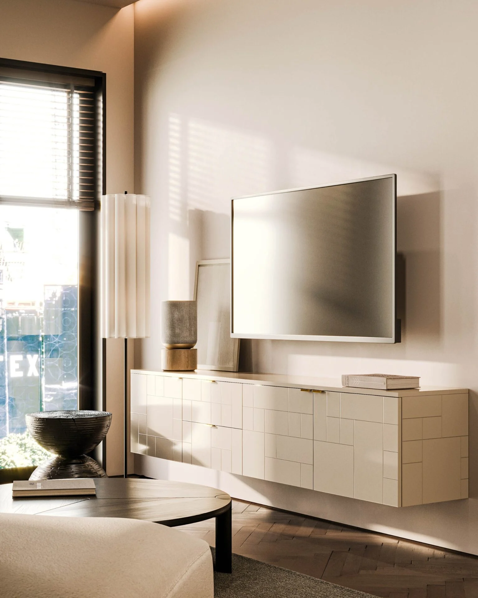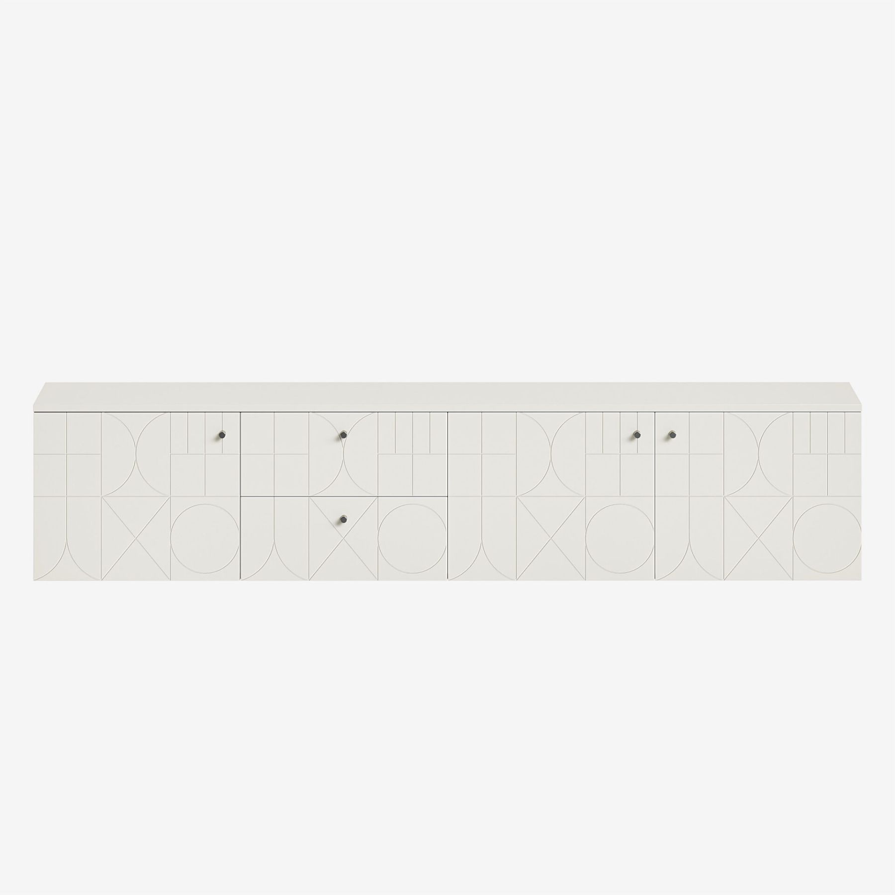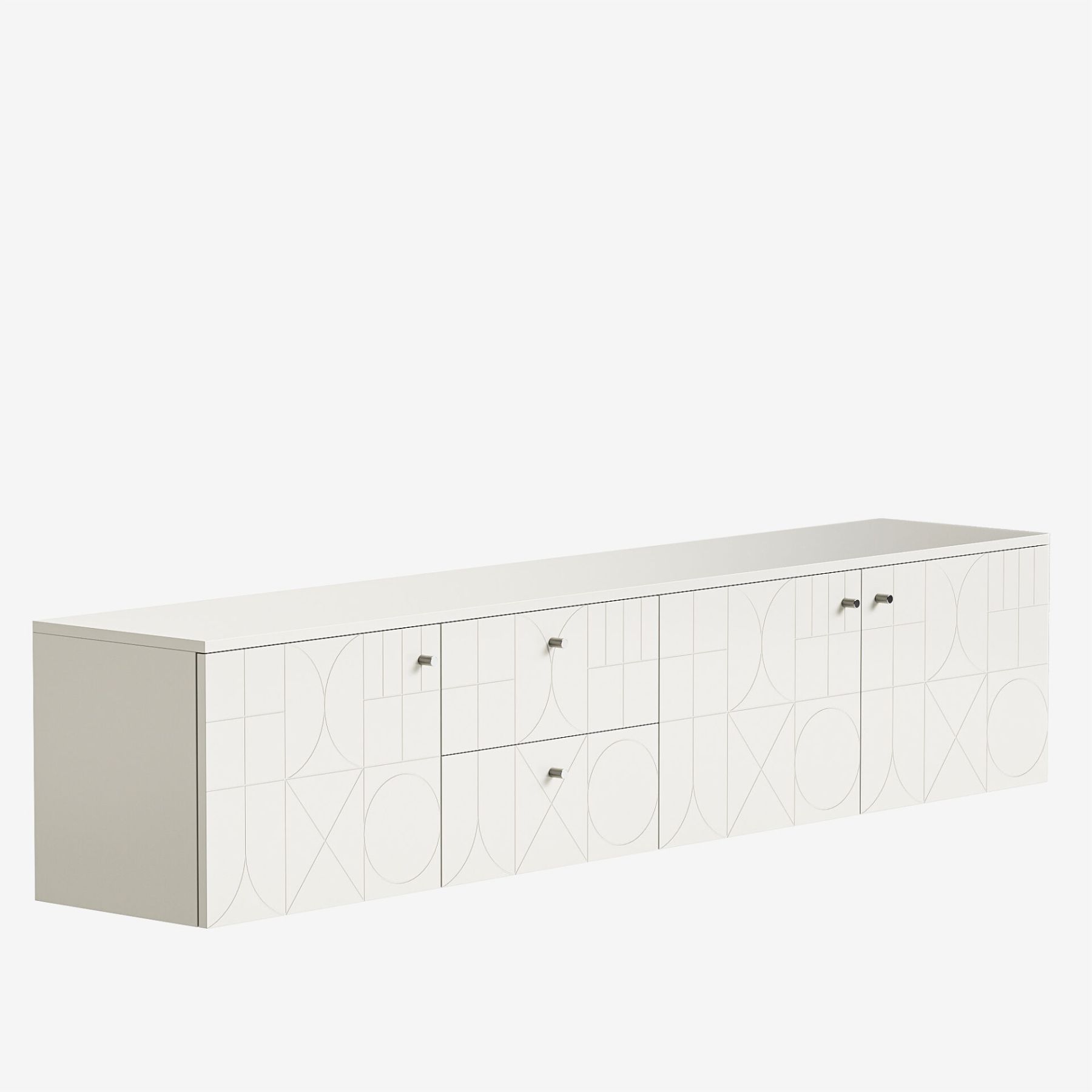 Подвесная тумба с выдвижными ящиками и секциями с полками буквально парит в воздухе благодаря технологичным подвесам. Высота тумбы позволяет оптимально использовать пространство комнаты. Фасады и боковые поверхности можно украсить авторскими гравировками.