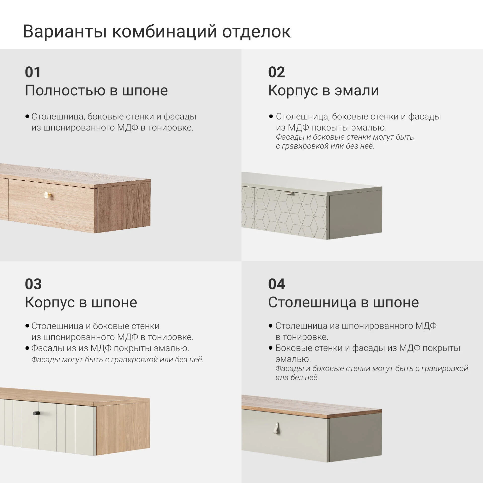 Модели MINIMAL легко использовать вместе, создавая удобную систему хранения из нескольких предметов: консоли, подвесные тумбы и пеналы разной высоты, комоды, открытые подвесные модули. Выбирайте цвета, комбинируйте изделия, создавайте подходящее вам решение. Особенности: Выбор комбинаций отделок позволяет создать нужное визуальное решение (полностью в шпоне, полностью в эмали или микс отделок); 30 стандартных оттенков эмали или индивидуальный цвет по шкале RAL/NCS; 10 оттенков тонировки натурального дуба; Стильные гравировки на фасадах и на боковых поверхностях изделий; Ассортимент ручек, разнообразие форм и отделок, включая функцию “открывание нажатием”; Внутреннее наполнение из прочного ЛДСП с 2-мя цветами на выбор (светло-серый и серый уголь); Качественная немецкая фурнитура с направляющими скрытого монтажа и доводчиками Hettich; Подвесы с регулировками уровня (выдерживают до 150 кг).
