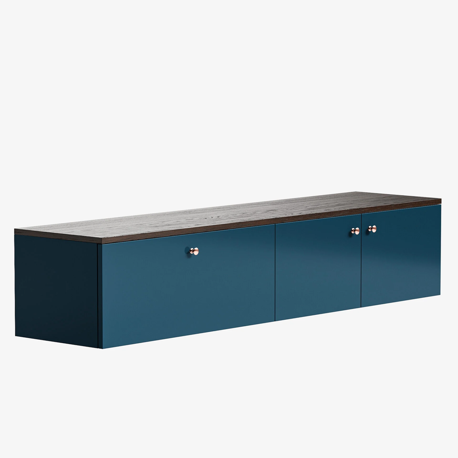 Подвесная тумба с выдвижными ящиками и секциями с полками буквально парит в воздухе благодаря технологичным подвесам. Высота тумбы позволяет оптимально использовать пространство комнаты. Фасады и боковые поверхности можно украсить авторскими гравировками.