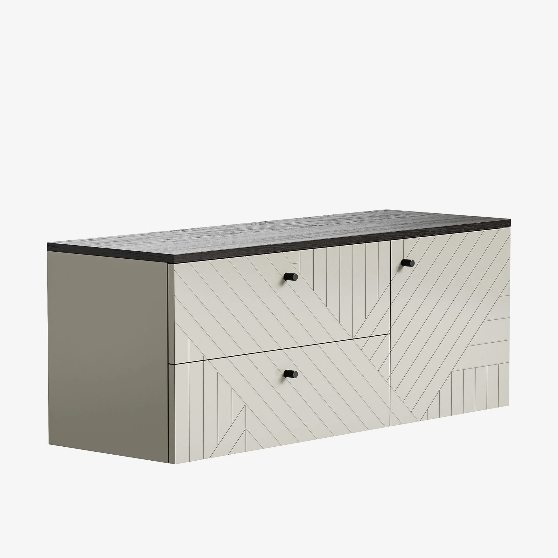 Подвесная тумба с выдвижными ящиками и секциями с полками буквально парит в воздухе благодаря технологичным подвесам. Высота тумбы позволяет оптимально использовать пространство комнаты. Фасады и боковые поверхности можно украсить авторскими гравировками.