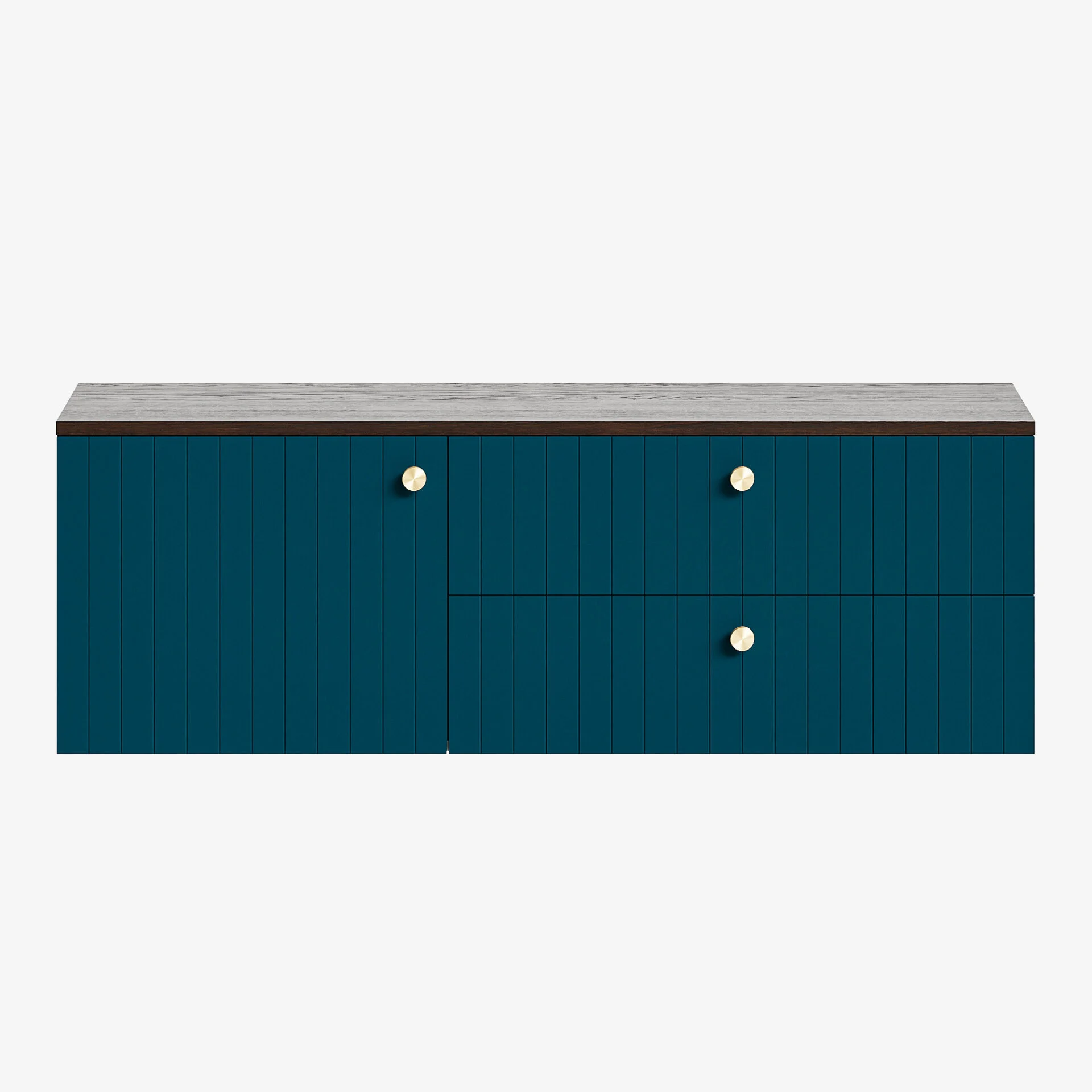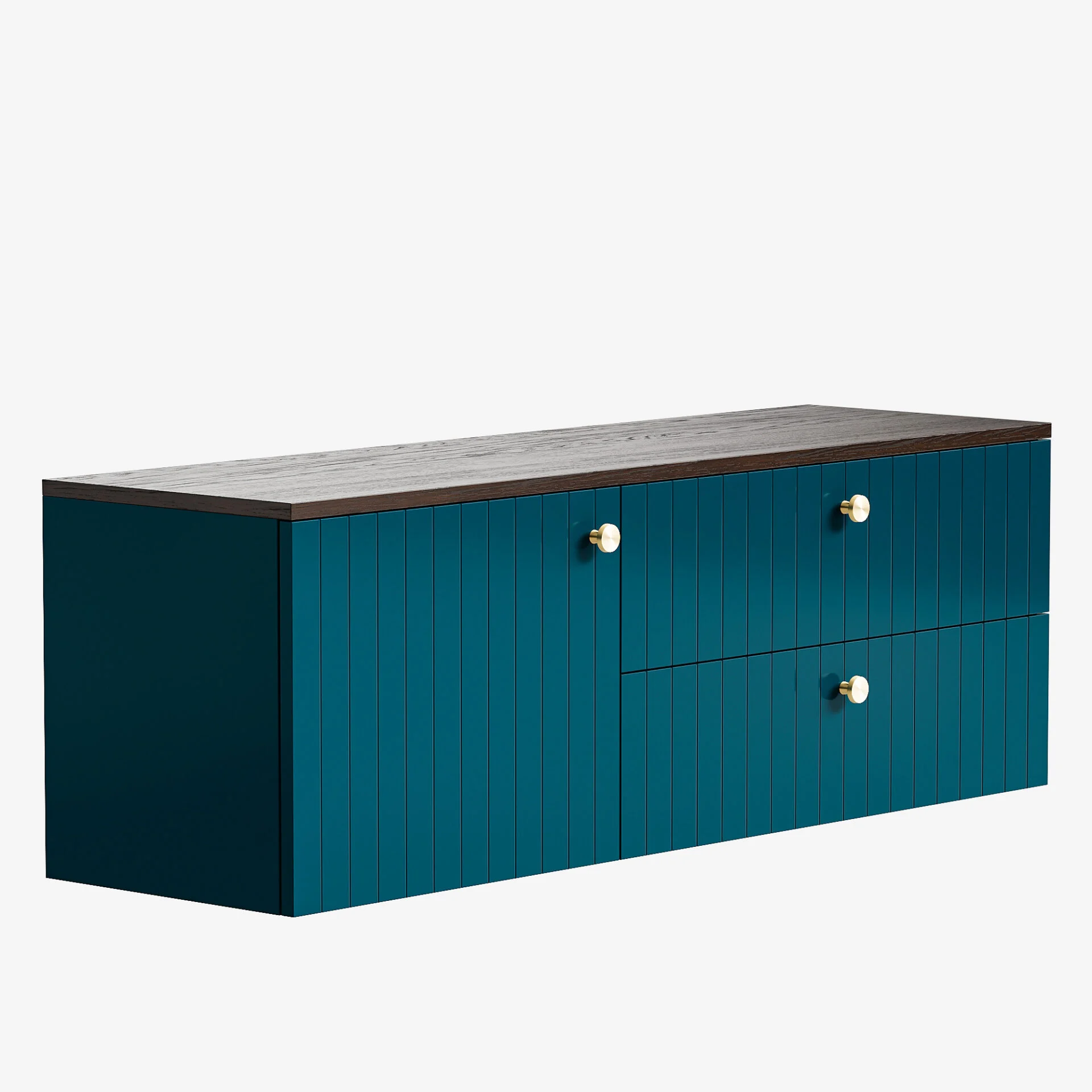 Подвесная тумба с выдвижными ящиками и секциями с полками буквально парит в воздухе благодаря технологичным подвесам. Высота тумбы позволяет оптимально использовать пространство комнаты. Фасады и боковые поверхности можно украсить авторскими гравировками.