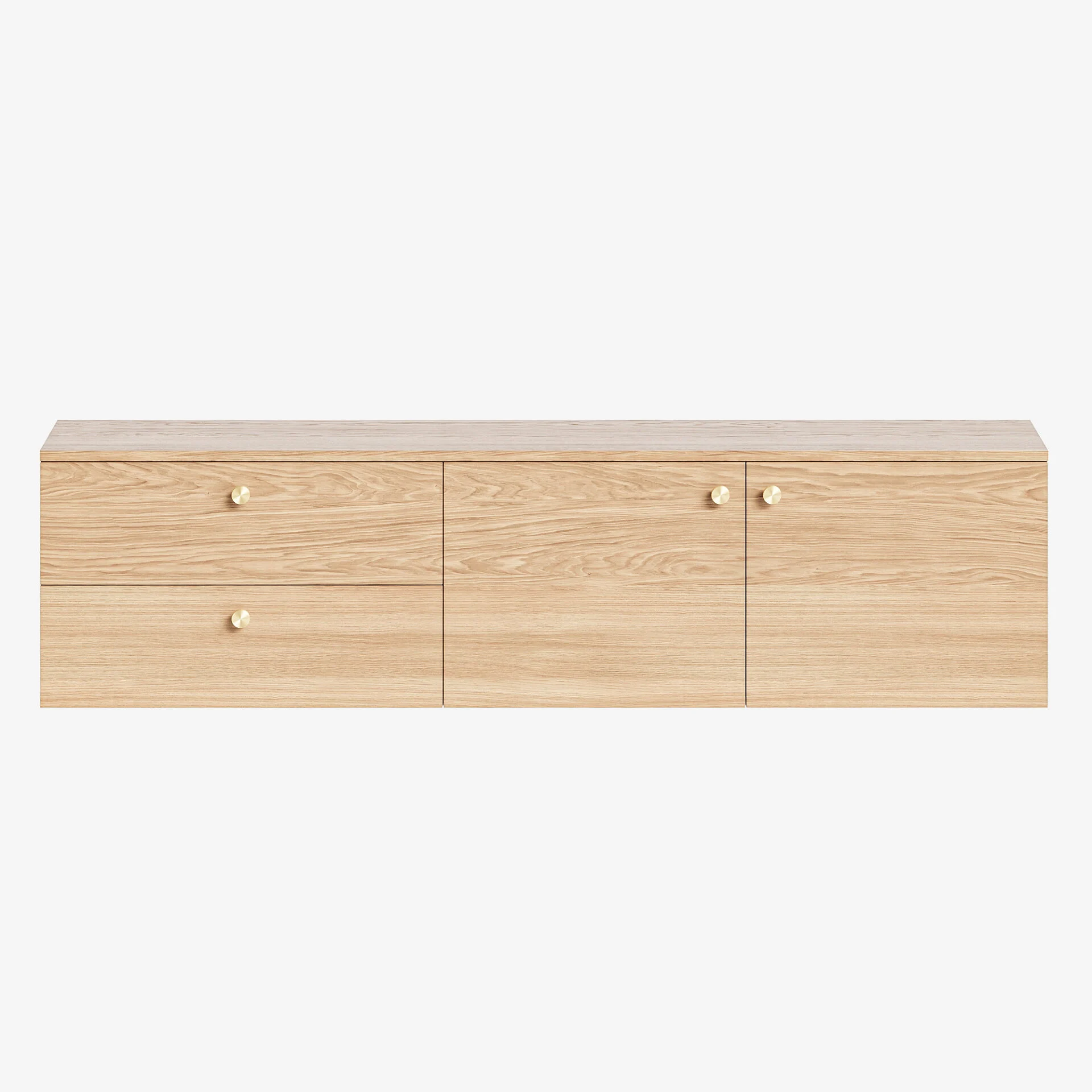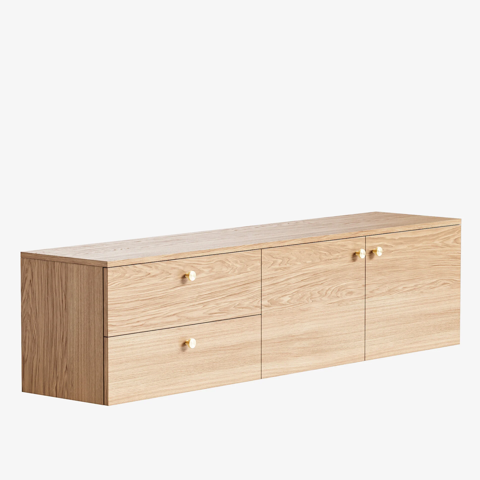 Подвесная тумба с выдвижными ящиками и секциями с полками буквально парит в воздухе благодаря технологичным подвесам. Высота тумбы позволяет оптимально использовать пространство комнаты.