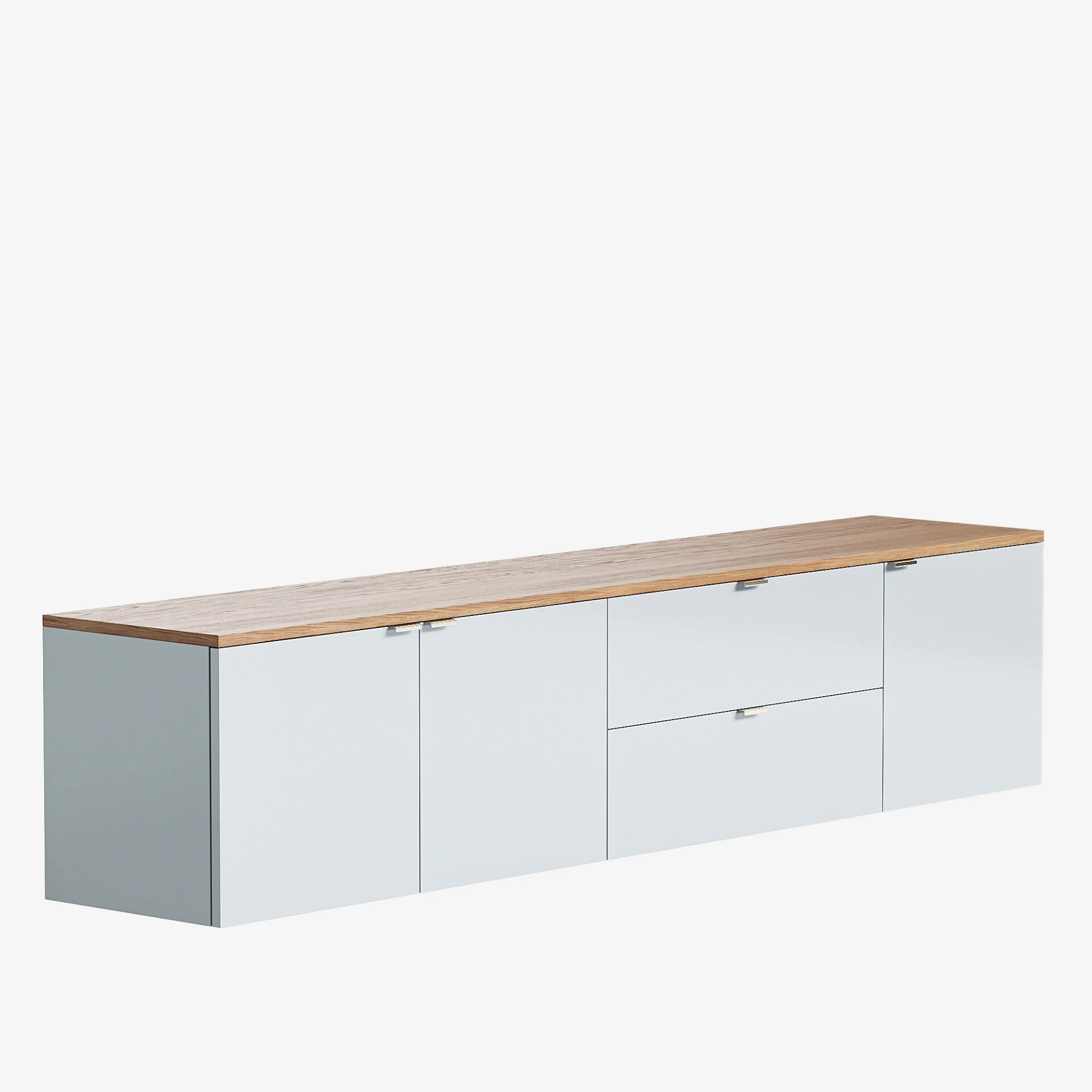 Подвесная тумба с выдвижными ящиками и секциями с полками буквально парит в воздухе благодаря технологичным подвесам. Высота тумбы позволяет оптимально использовать пространство комнаты. Фасады и боковые поверхности можно украсить авторскими гравировками.