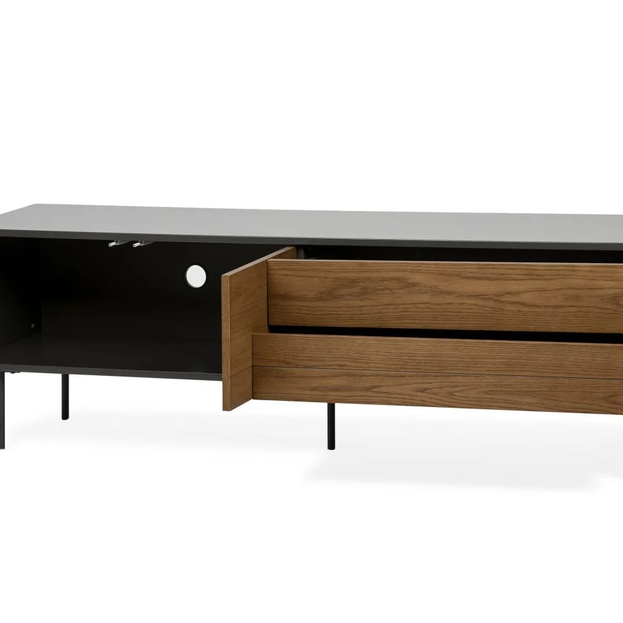 Эта тумба предназначена для размещения телевизора и других мультимедийных устройств. Просторные ящики и открытые полки обеспечивают удобное хранение аксессуаров, таких как пульты, DVD-диски или игровые консоли.