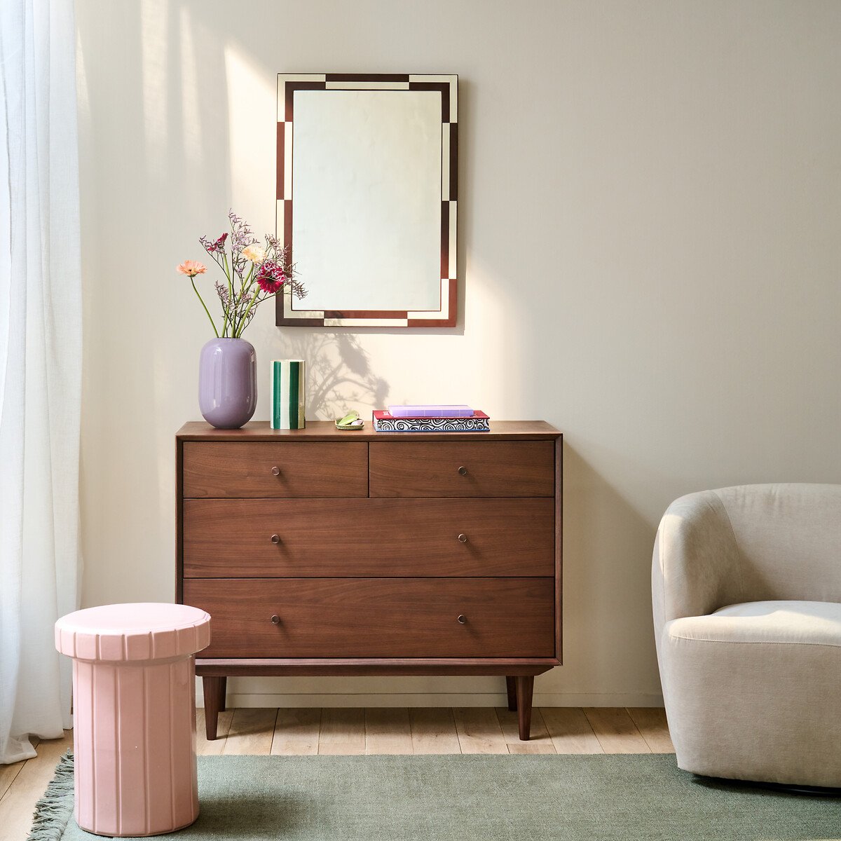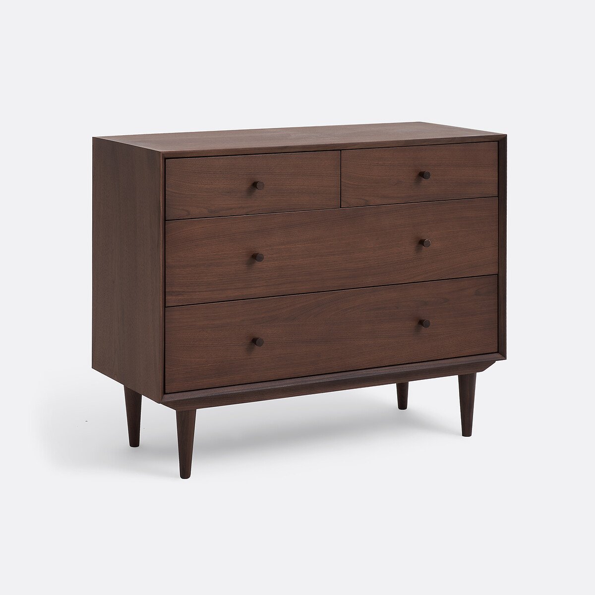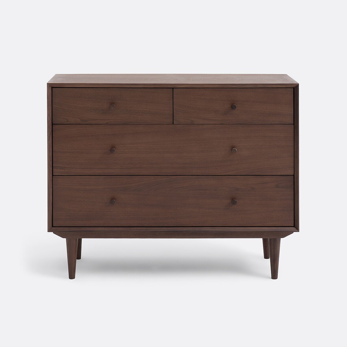 Винтажный комод с 4 ящиками из орехового дерева QUILDA / КИЛЬДА: Впустите в жилище винтажный дух, установив этот комод с 4 ящиками, он так же практичен, как и красив, и будет прекрасно выглядеть в любом интерьере, в любой комнате.Описание • Четыре ящика: 2 больших + 2 малых. • Каркас и ящики из массива ореха и МДФ, шпонированного орехом • Ножки из массива ореха • Отделка полиуретаномРазмерыОбщие размеры • Длина: 100 см • Высота: 80 см • Глубина: 40 см • Вес: 39 кгВнутренние размеры • Большие ящики: Ш94 x В14 x Д32 см • Маленькие ящики: Ш44 x В8 x Д32 смДоставкаСамостоятельная сборка. Доставка осуществляется до квартиры по предварительной договоренности. Внимание! Убедитесь в том, что товар можно доставить на дом с учётом его габаритов (проходит в двери, по лестницам, в лифты). • ДРЕВЕСИНА ИЗ УСТОЙЧИВО УПРАВЛЯЕМЫХ ЛЕСОВ. Наличие знака FSC® означает, что древесина, из которой изготовлено изделие, добыта с соблюдением международных стандартов: в процессе добычи не были нарушены права коренных народов, местных жителей и работников, и заготовка велась методом устойчивого лесопользования.Размеры и вес упаковкиОдна упаковка • Д110 x В47 x Г79 см, 44 кг