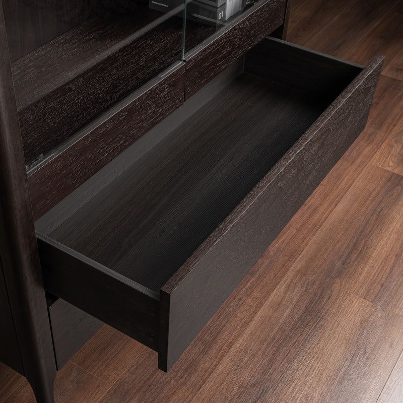 Корпус витрины изготовлен из высококачественного МДФ высокой плотности, Ножки и ручки - из массива дерева.