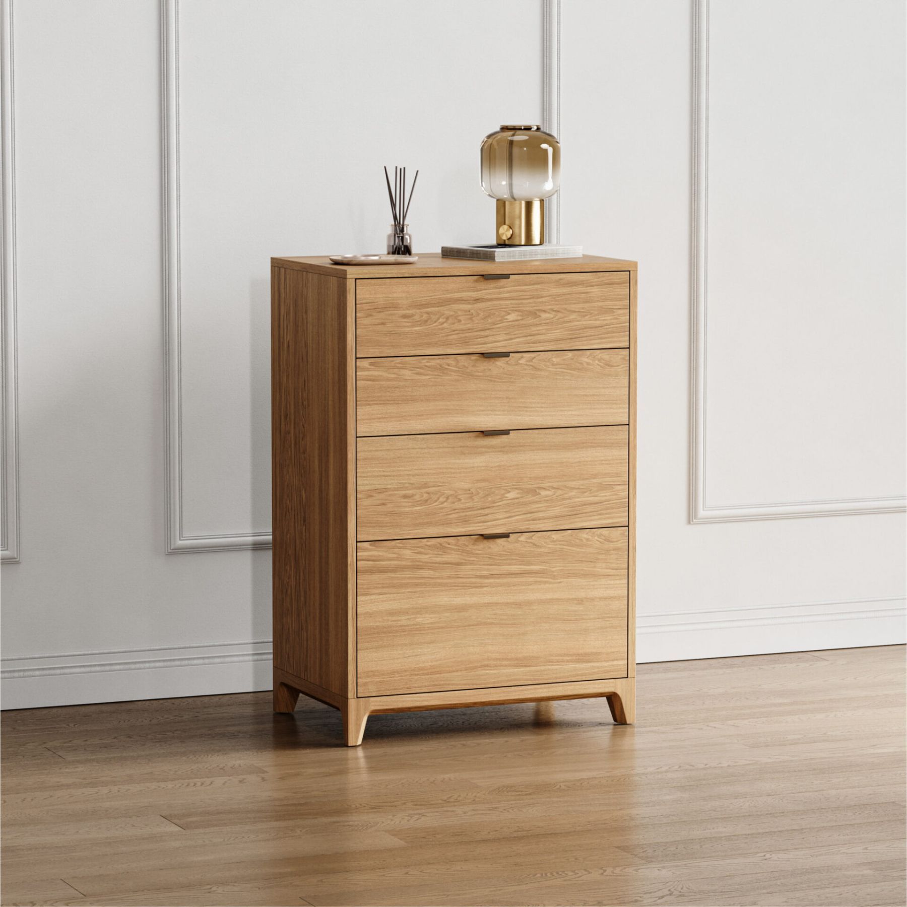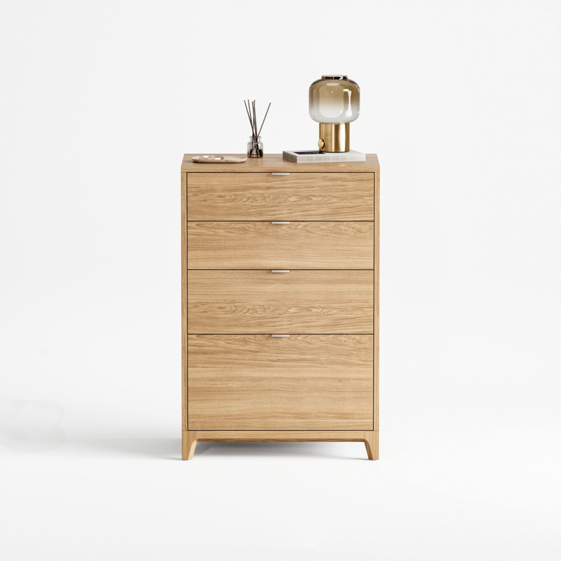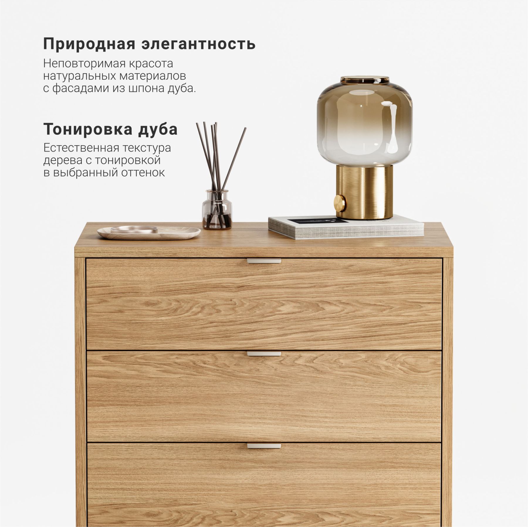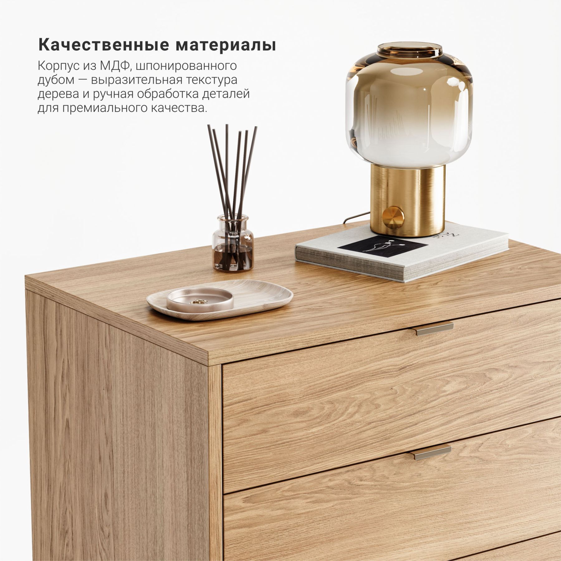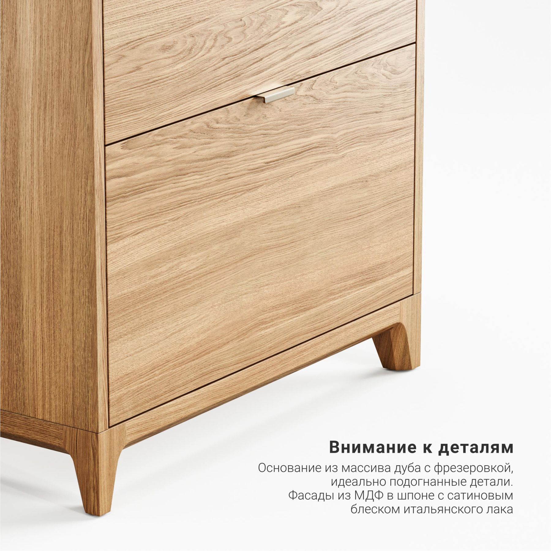 Основание и ножки выполнены из массива дуба, цвет которого вы можете выбрать из нескольких вариантов. Корпус комода может быть покрыт эмалью или натуральным шпоном дуба. Фасады могут быть покрыты эмалью с / без гравировки или натуральным шпоном дуба.