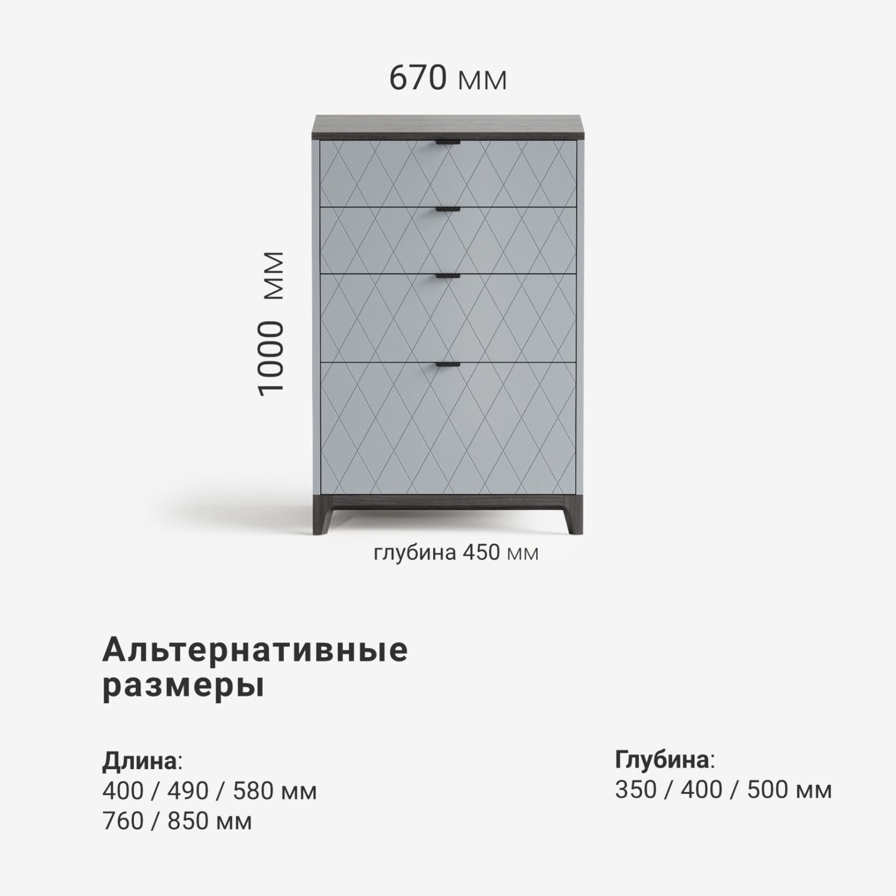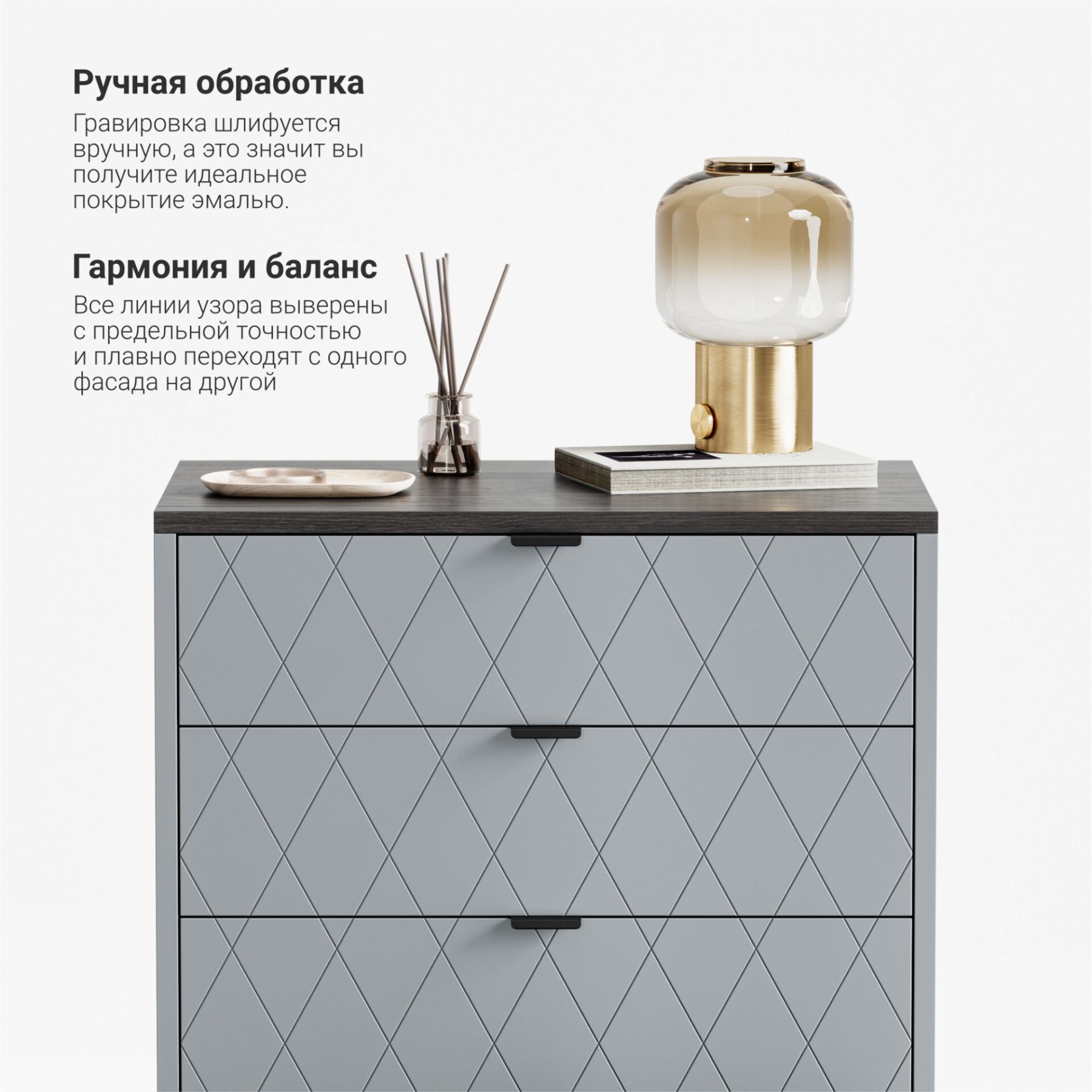 Основание и ножки выполнены из массива дуба, цвет которого вы можете выбрать из нескольких вариантов. Корпус комода может быть покрыт эмалью или натуральным шпоном дуба. Фасады могут быть покрыты эмалью с / без гравировки или натуральным шпоном дуба.