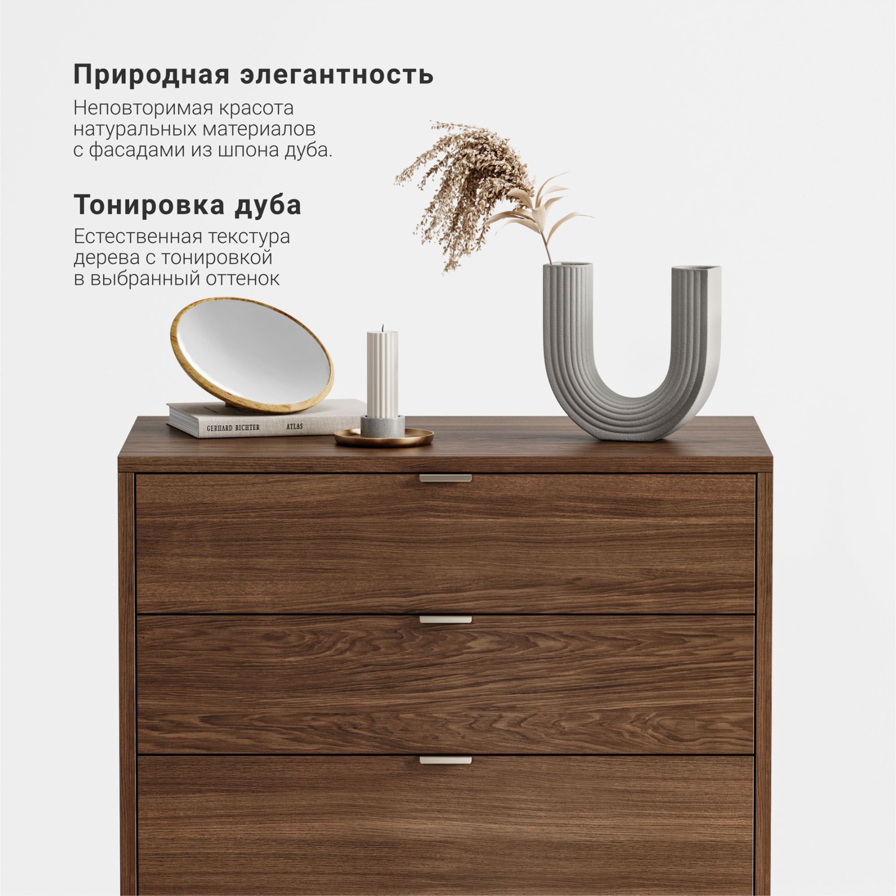 Основание и ножки выполнены из массива дуба, цвет которого вы можете выбрать из нескольких вариантов. Корпус комода может быть покрыт эмалью или натуральным шпоном дуба. Фасады могут быть покрыты эмалью с / без гравировки или натуральным шпоном дуба.