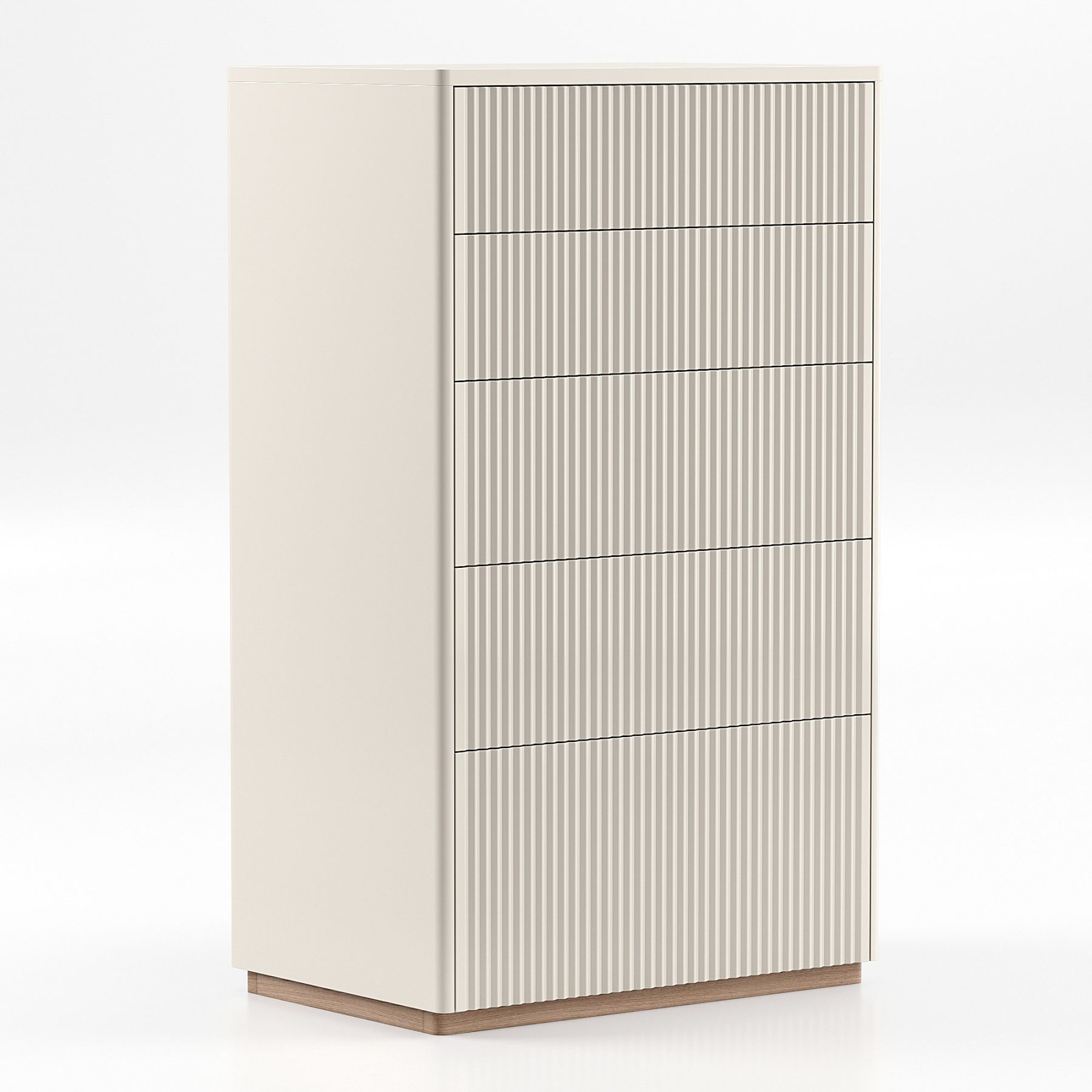 Высокий комод с двумя секциями с полками придется к месту в любом доме. Декоративная глубокая фрезеровка создает удивительную игру теней на фасадах. Строгие вертикальные линии и ощутимая фактура дерева добавляют изделию элегантность. Дверцы моментально реагируют на прикосновения — они открываются от нажатия, на фасадах нет ручек. Используйте его отдельно или вместе с другими изделиями из коллекции.