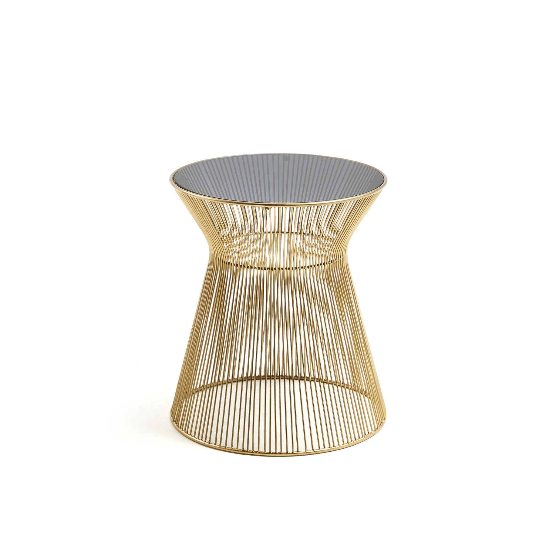 Cтолик журнальный Jolene золото от фабрики La Forma – коническая форма, как отличный вариант для гармоничного сочетания с диваном. Журнальный столик Jolene – стильная и незаурядная модель. Благодаря своей конической форме, изделие хорошо будет смотреться возля мягкой мебели. А яркие элементы, такие как золотая структура и затемненное стекло, очаровывать при каждом взгляде. Столик состоит из цельного каркаса и столешницы. Столешница изготовлена из закаленного стекла толщиной 7 мм. Стекло затемненное, глянцевое, ударопрочное. Каркас выполнен из стали с гальваническим латунным покрытием. Он имеет проволочную структуру, где толщина каждого стержня составляет 3 мм. Стержни приварены к кольцам толщиной 0,7 см. Максимальная нагрузка на столик не должна превышать 5 кг. Размеры: диаметр – 40 см, высота – 44 см. Вес – 6,8 кг. Сборка не требуется.