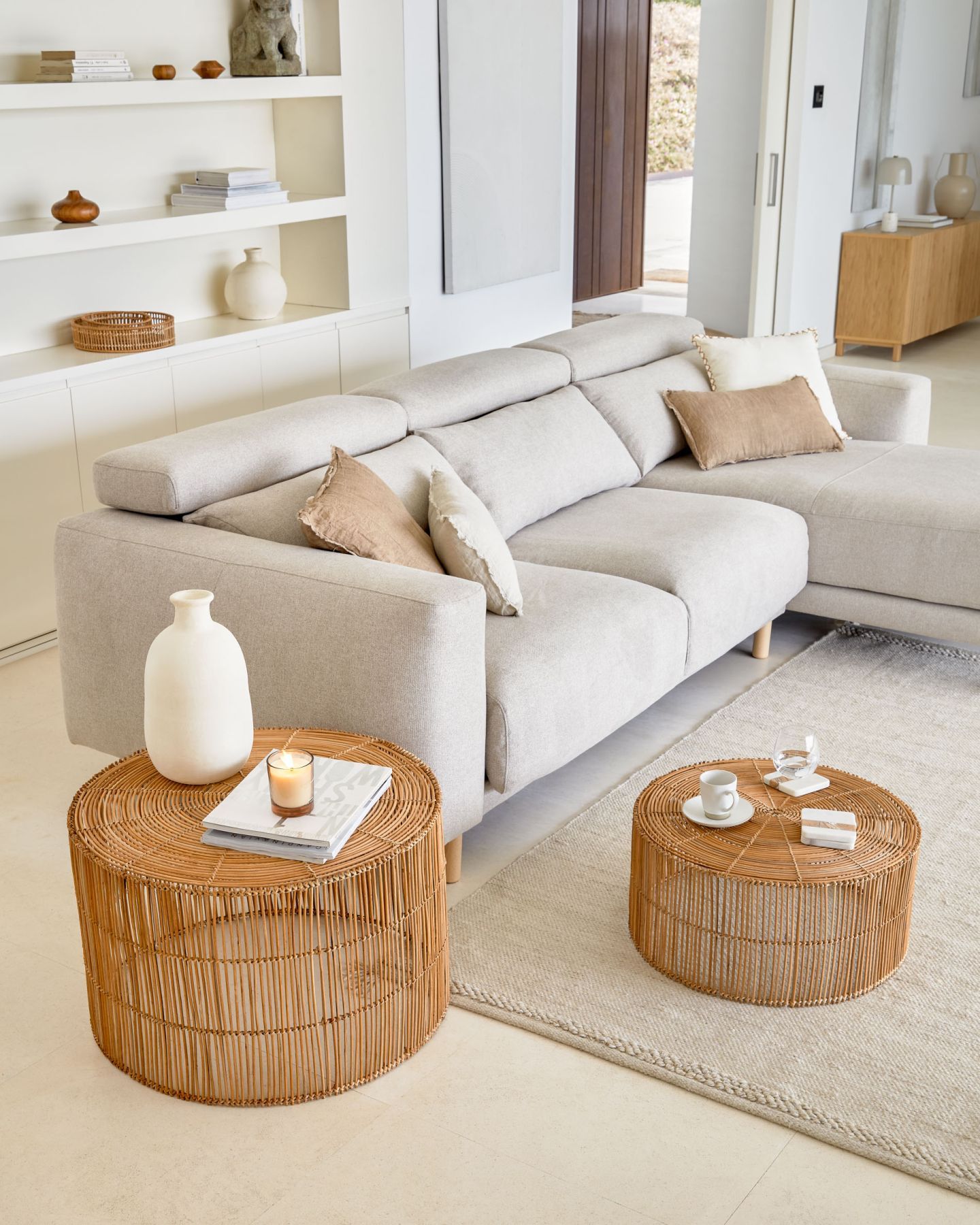 Набор из 2 журнальных столиков из ротанга с натуральной отделкой, диаметром 66 см и 55 см. Внутренний металлический каркас. Изготовлено вручную из натуральных материалов с уникальными тонами и фактурами, которые делают каждое изделие уникальным.