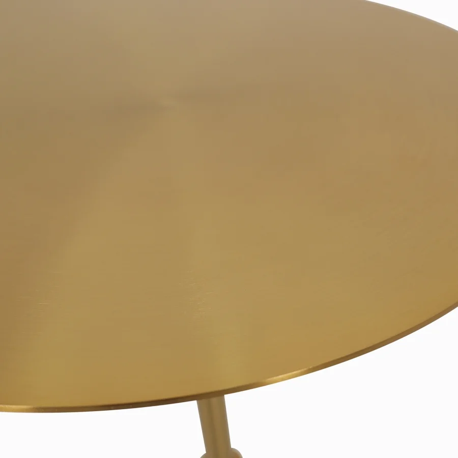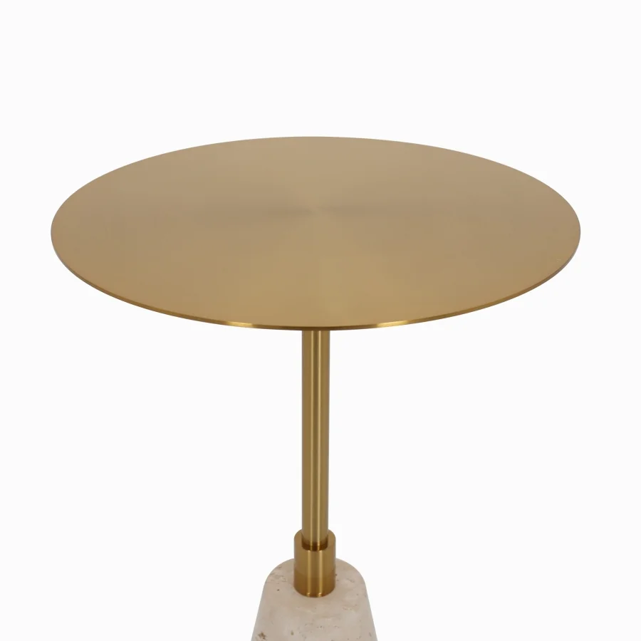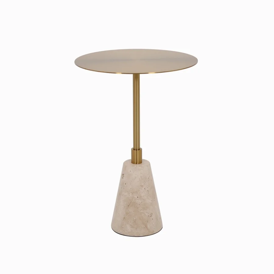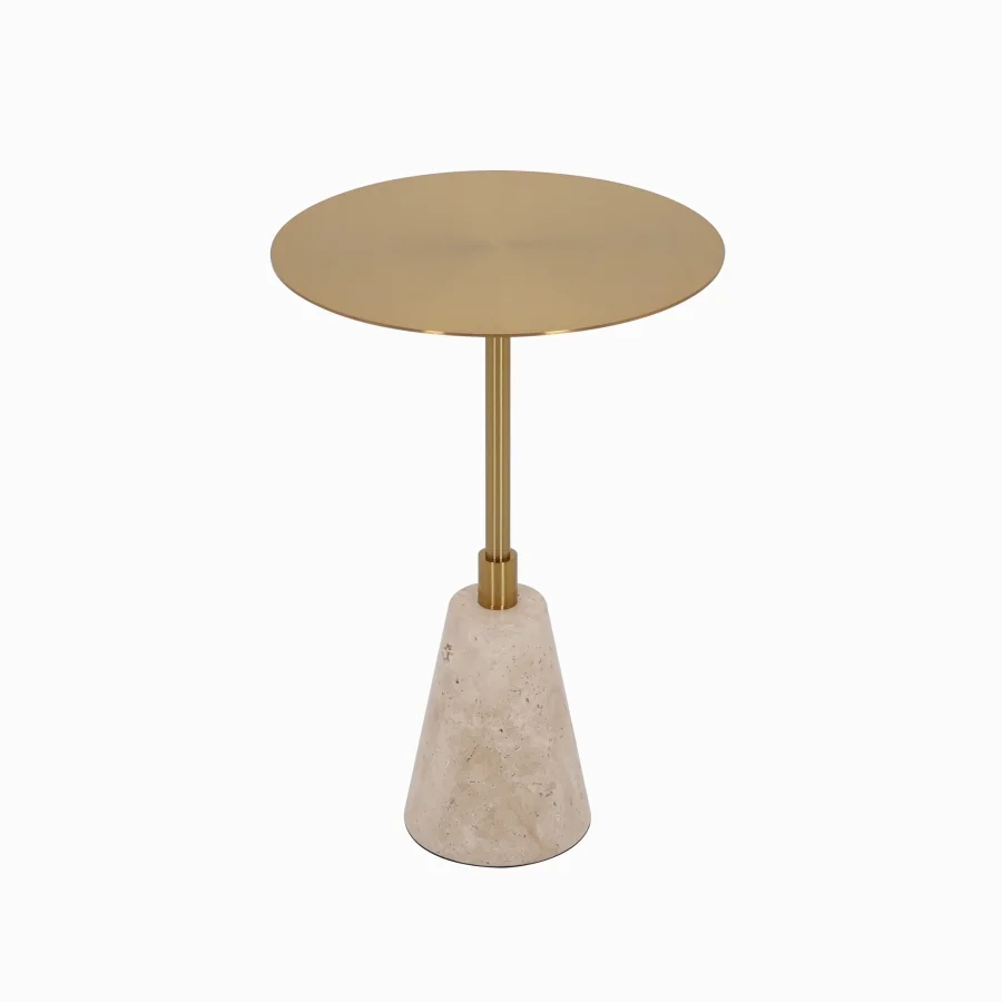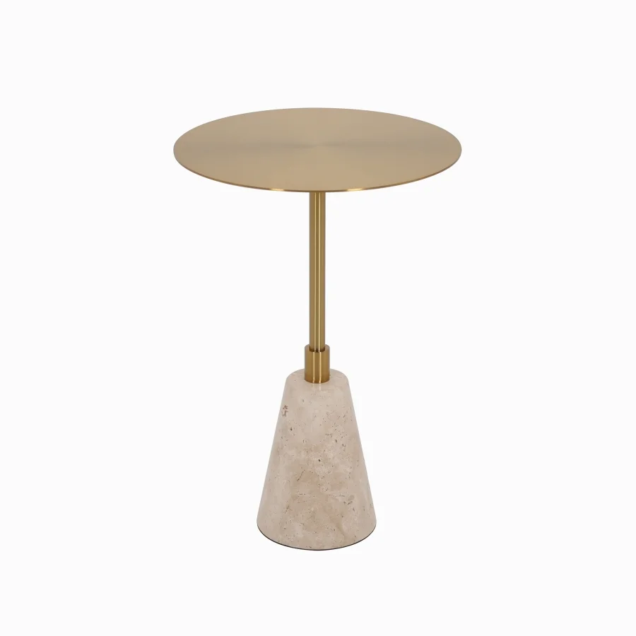 Изготовленный из комбинации металла и мрамора, он сочетает в себе прочность и элегантность. Золотой каркас и бежевый мраморный верх придают столу роскошный вид. Высота 55 см делает его удобным для размещения рядом с диваном или креслами.