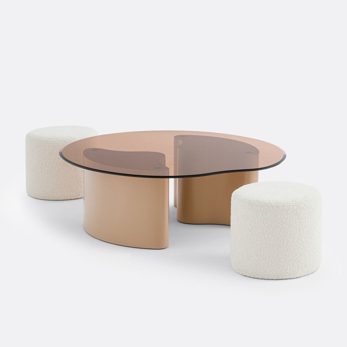 Столешница из тонированного стекла, через которую заметны ножки, идеально продуманные для размещения двух пуфов: компактные и хорошо продуманные, в задвинутом положении они совершенно незаметны. Тонкая работа по балансу от дизайнеров La Redoute Intérieurs.
