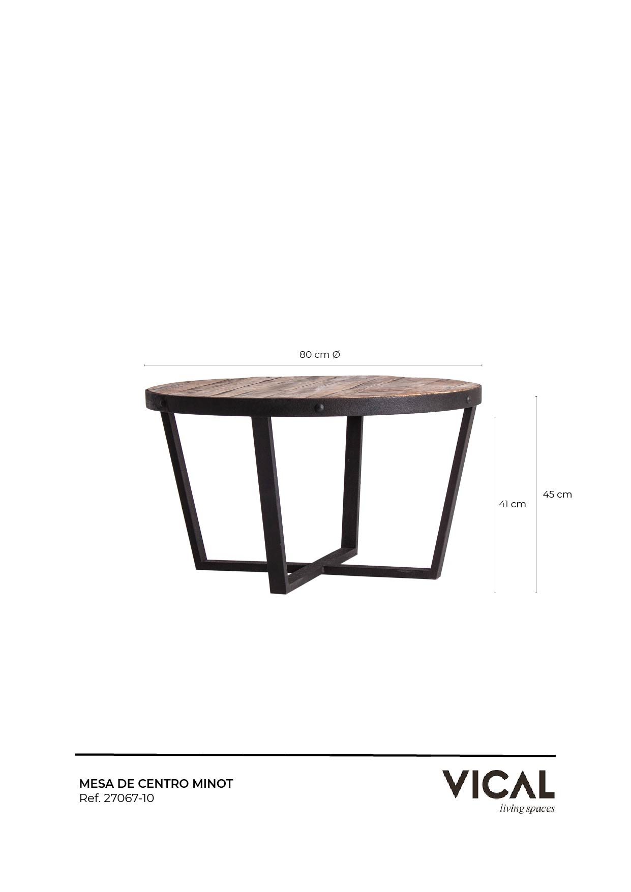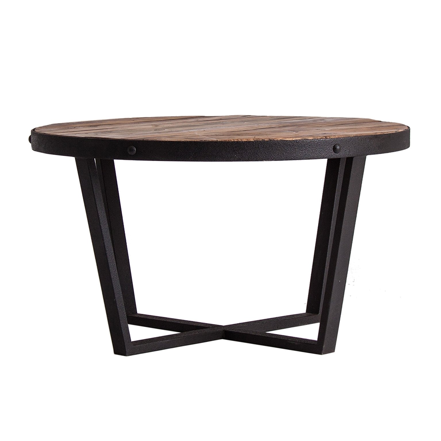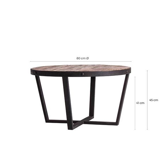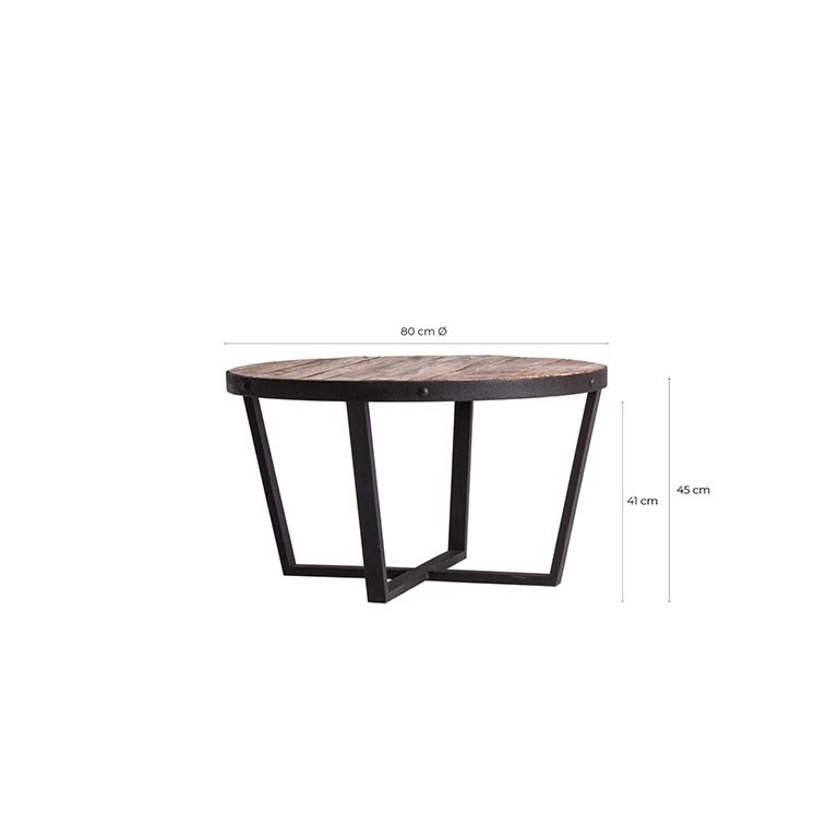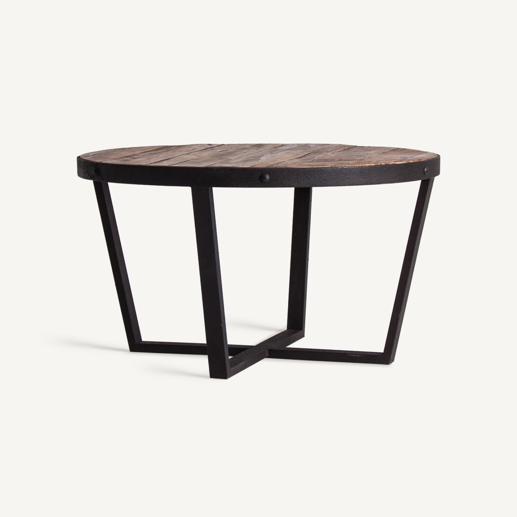 Круглый журнальный столик Minot, натурального состаренного цвета, в индустриальном стиле. Изготовлен из переработанной сосновой древесины.
