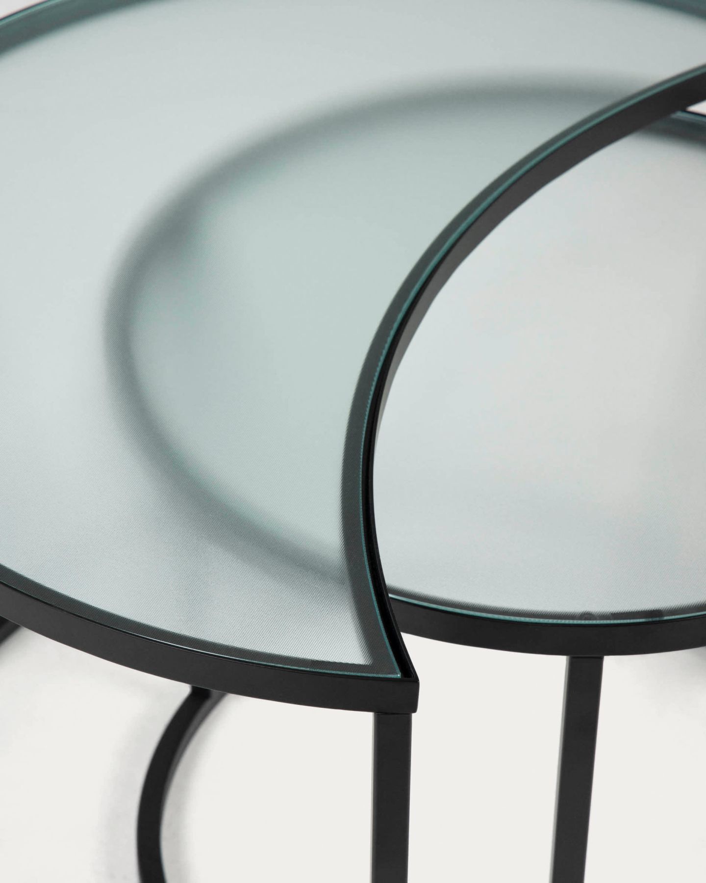 Набор из 2 приставных столиков Bast Ø 65 cm / Ø 47 cm от фабрики La Forma – стильное дополнение к индустриальному интерьеру. Столики Bast выглядят современно и в полной мере отвечают тенденциям городского промышленного дизайна. Небольшие габариты, лаконичная форма, практичная конструкция – плюсы для каждого жителя мегаполиса, которому важно, чтобы вспомогательная мебель не создавала проблем и была полезной. А матовая столешница – дизайнерский штрих, который выводит этот набор из ряда банальных и скучных. Каркасы столов выполнены из стали с матовым порошковым покрытием черного цвета. Благодаря большой площади опоры, они устойчивы на любом напольном покрытии и при этом, не повредят его (на каждом изделии есть упругие наконечники). Столешница высотой 2 см выполнена из текстурированного матового стекла. Оно ударопрочное, не деформируется от воздействия высоких температур. Максимальная нагрузка на каждый столик не должна превышать 10 кг. Размеры: диаметр – 65 и 47 см (большой и малый), высота – 46 и 40 см, глубина поверхности большого стола – 35 см. Суммарный вес двух изделий – 9 кг. Потребуется небольшая самостоятельная сборка.