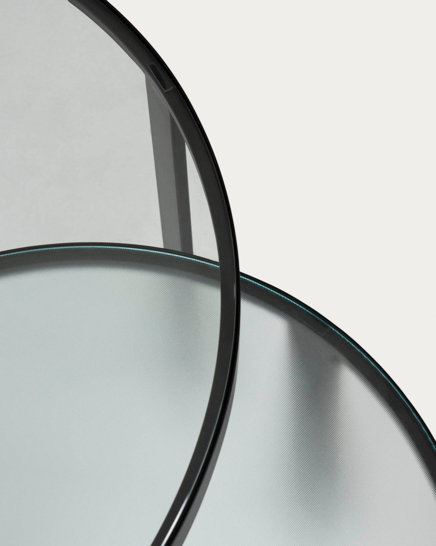 Набор столиков Oni Ø 70 cm / Ø 50 cm от фабрики La Forma – эффектный контраст двух столешниц и прочная металлическая опора. Столики Oni – стильный дизайнерский сет, который не только лаконично впишется в городской интерьер, но и не займет много места благодаря своей гнездовой концепции (малый столик задвигается под большой). Главная особенность этого набора – контрастные столешницы. Такое сочетание выглядит оригинально и позволяет менять сервировку, в зависимости от настроения. Столики круглой формы. Столешницы выполнены из закаленного стекла толщиной 6 мм. Большой стол оснащен прозрачной столешницей, а малый – матовой текстурированной. Опора металлическая, покрыта черной матовой краской. Она цельная, состоит из обруча высотой 3 см, удерживающего стекло, и трех ножек. Ножки прямоугольные, с шириной грани 4 см и глубиной 1 см. На каждой находится пластиковый наконечник, защищающий напольное покрытие от повреждений. Суммарная максимальная нагрузка на столики не должна превышать 15 кг. Размеры: ширина – 70 и 50 см, высота – 43 и 33 см. Суммарный вес – 13,2 кг. Для сборки в комплектацию включены инструкция и крепеж.