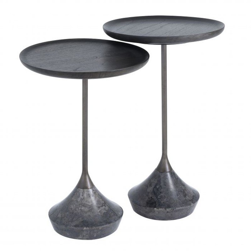 Комплект из двух приставных столиков. Столики изготовлены из стали, мрамора и дерева Минди.