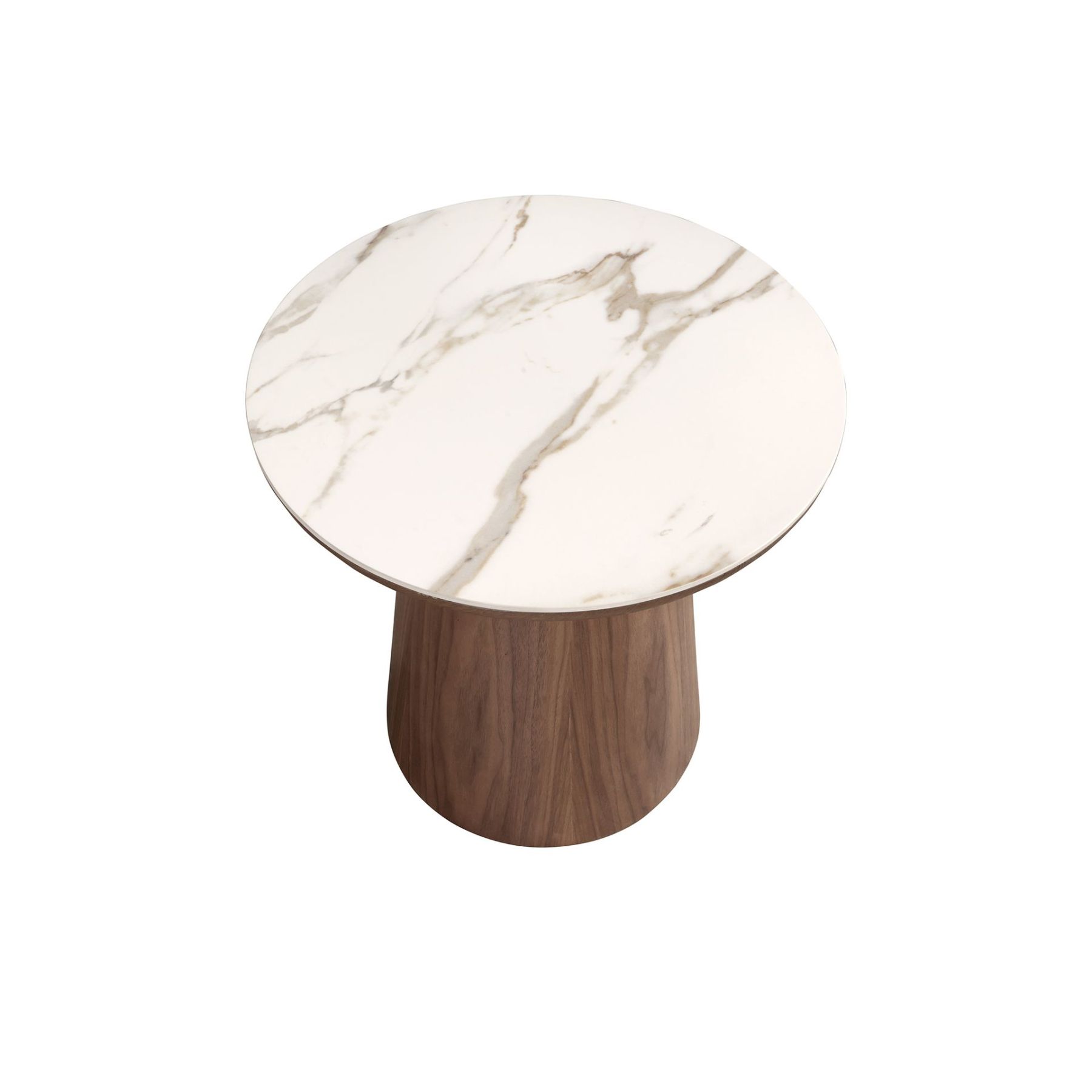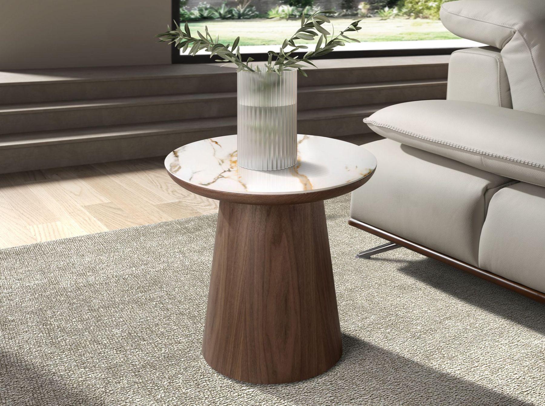 Круглый угловой стол современного дизайна со столешницей из белого фарфорового мрамора с прожилками землистых тонов в глянцевой отделке и оригинальными деревянными ножками, покрытыми натуральным ореховым шпоном. Этот предмет мебели отличается простым, но оригинальным дизайном, который добавит вашему интерьеру неповторимый и индивидуальный штрих.