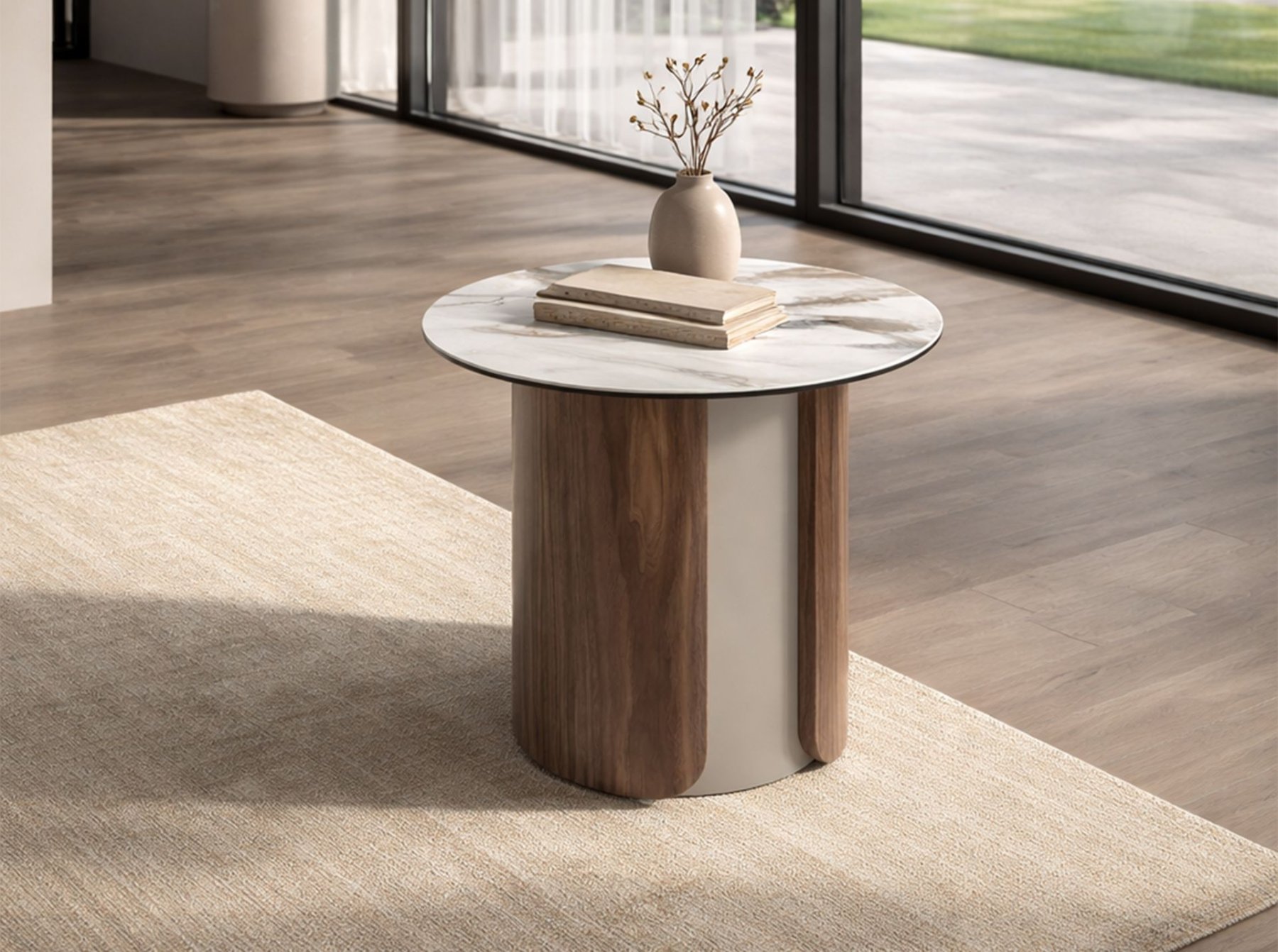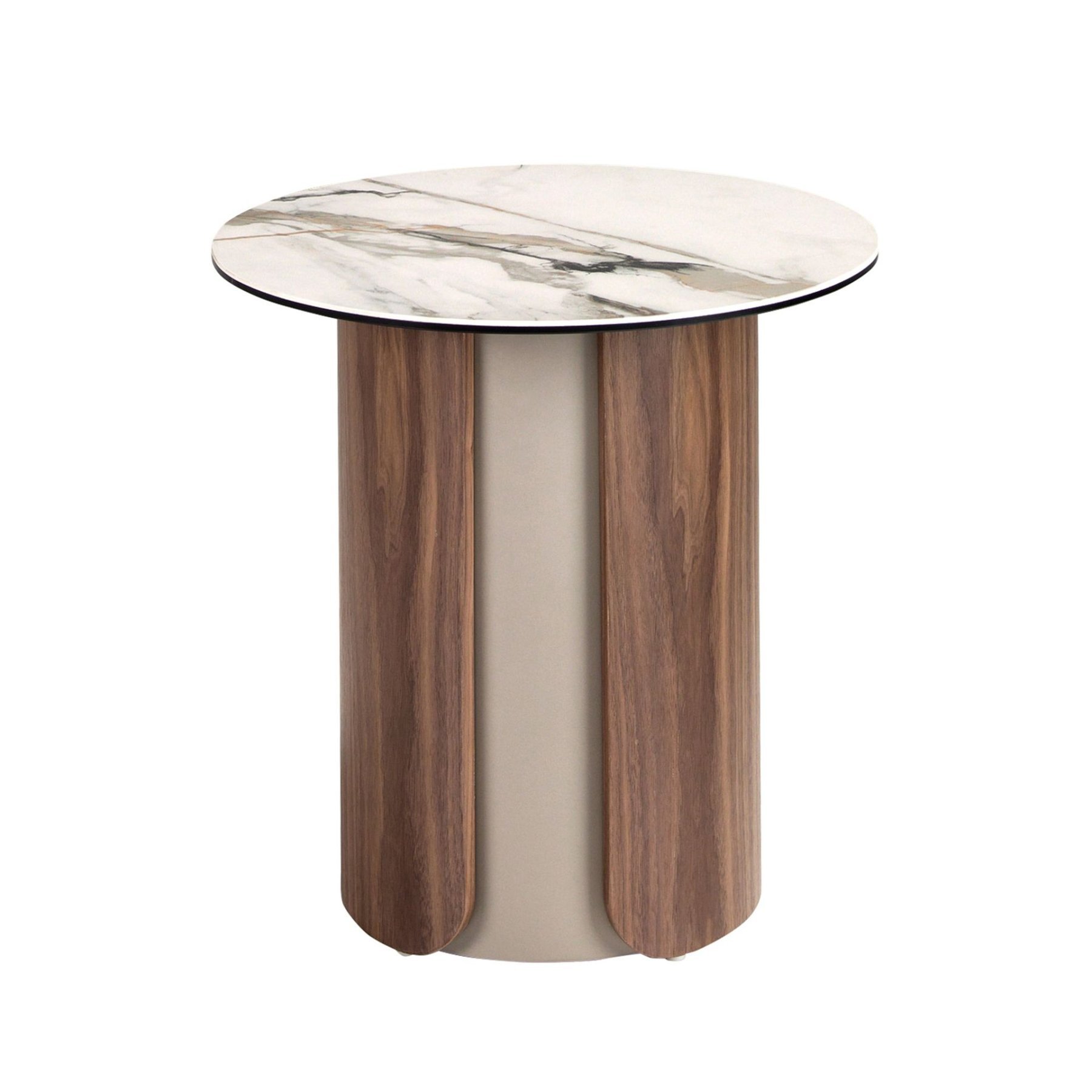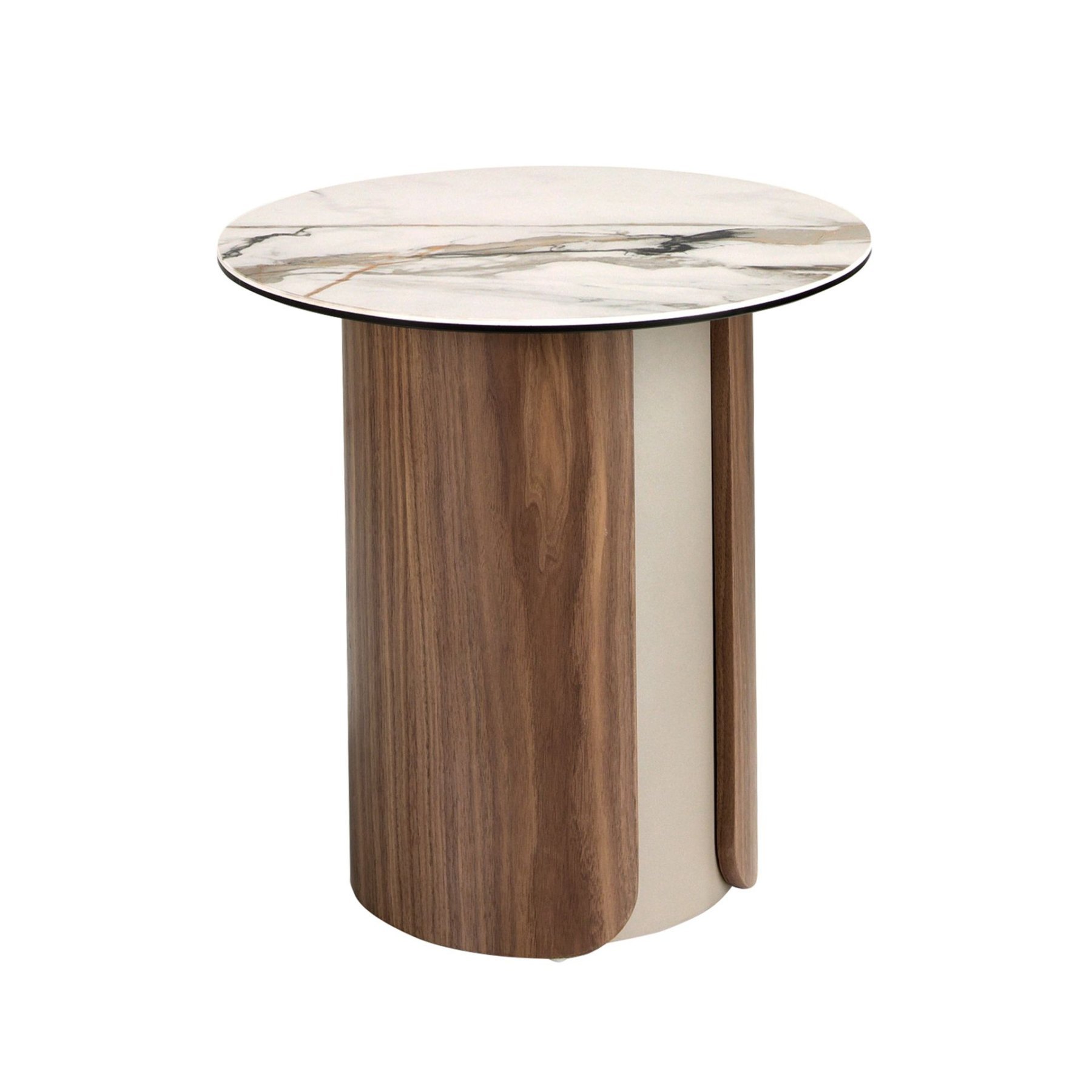 Круглый угловой стол в современном стиле с белой столешницей из фарфорового мрамора с серыми и коричневыми прожилками на матовой поверхности. Оригинальные ножки из нержавеющей стали с металлическим эффектом песочного цвета и натурального орехового шпона толщиной 0,5 мм. Простой, но оригинальный дизайн, который добавит вашему интерьеру неповторимый и индивидуальный шарм.