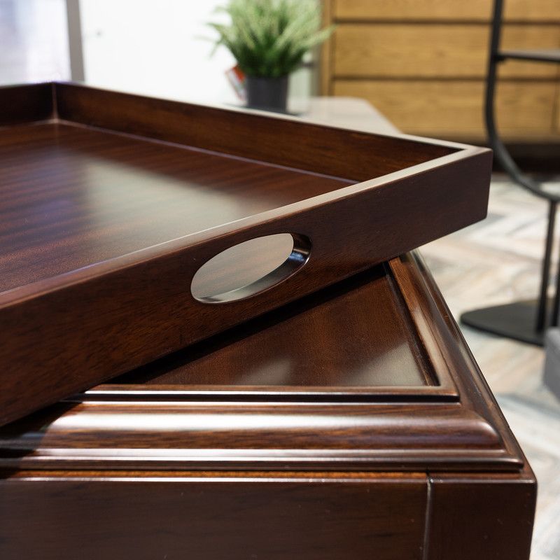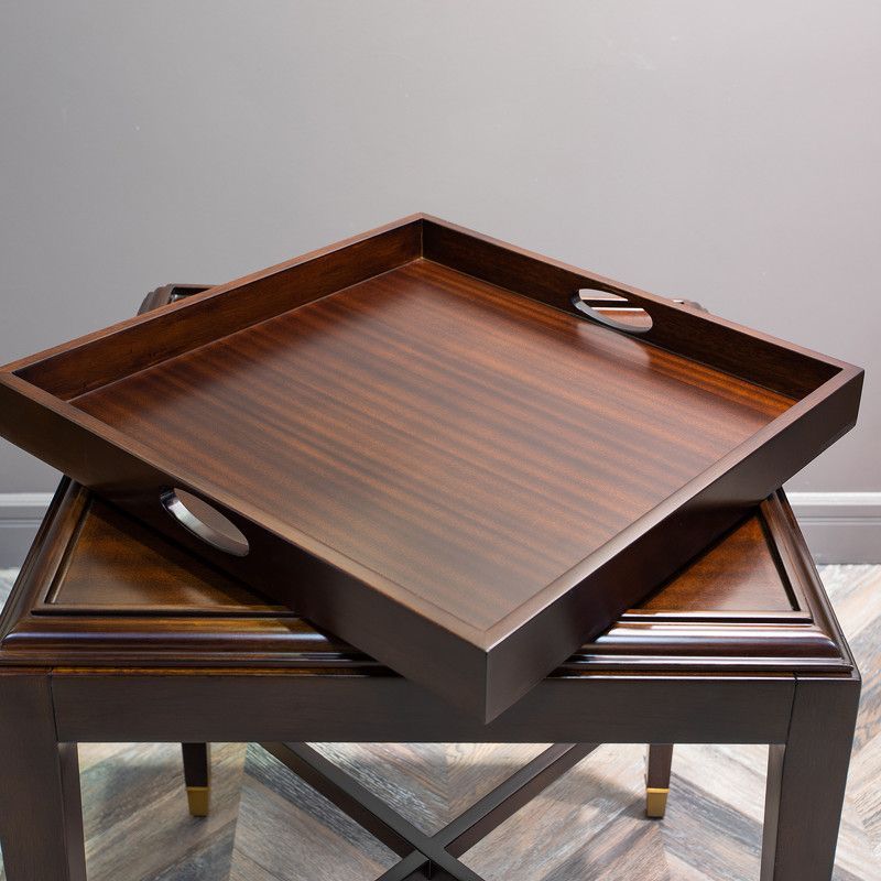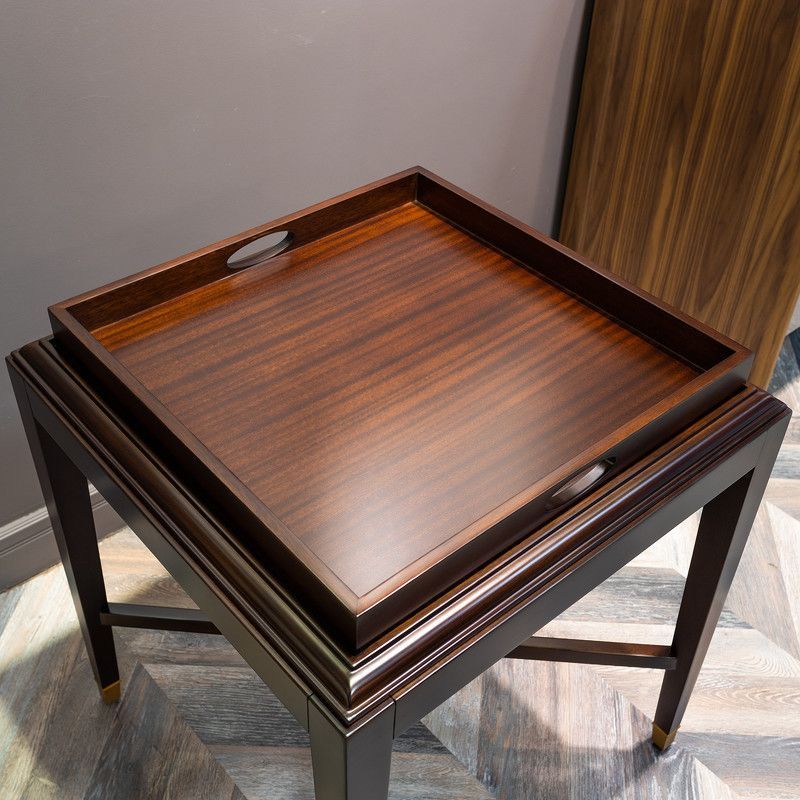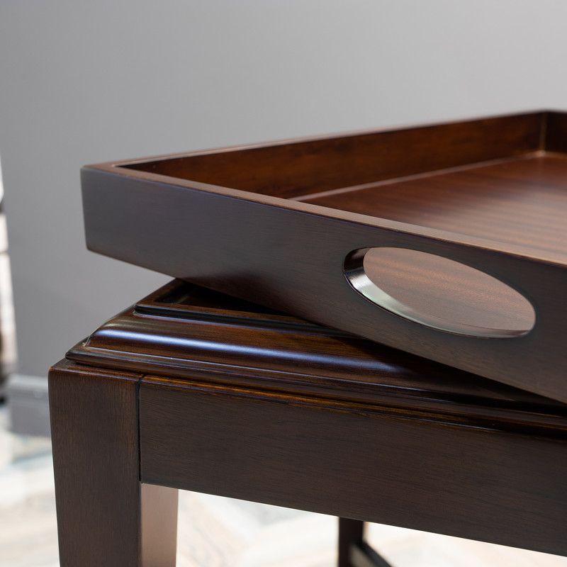 Каркас — массив дерева и высококачественная МДФ высокой плотности, отделка — натуральный шпон махагона. Столешница дополнена подносом с ручками.