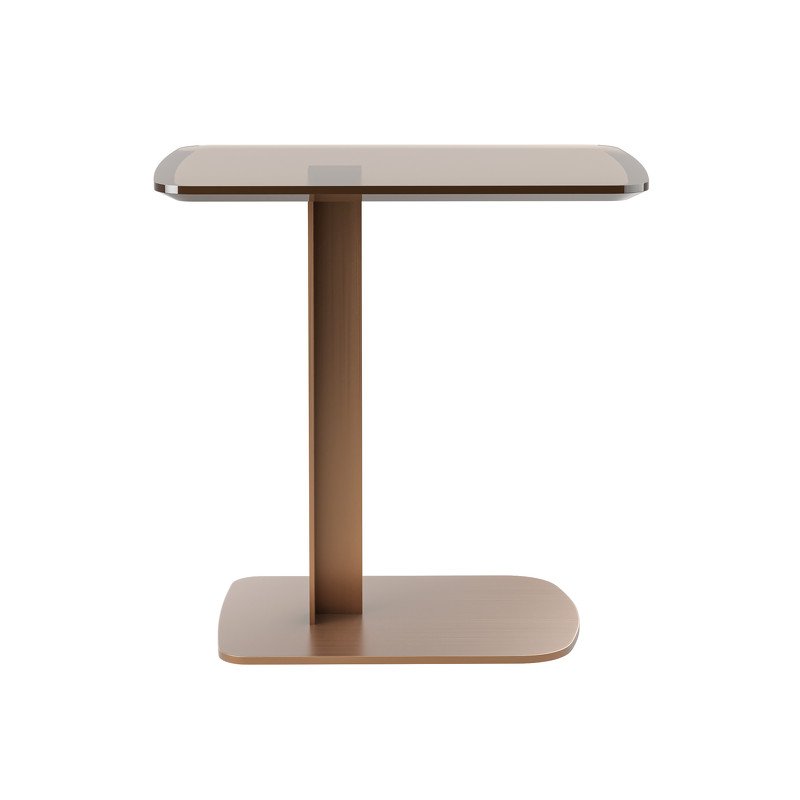 Структура столика выполнена из нержавеющей стали в цвете латунь, столешница - закаленное тонированное прозрачное стекло в коричневых тонах, что позволяет безопасно использовать и легко чистить столик.