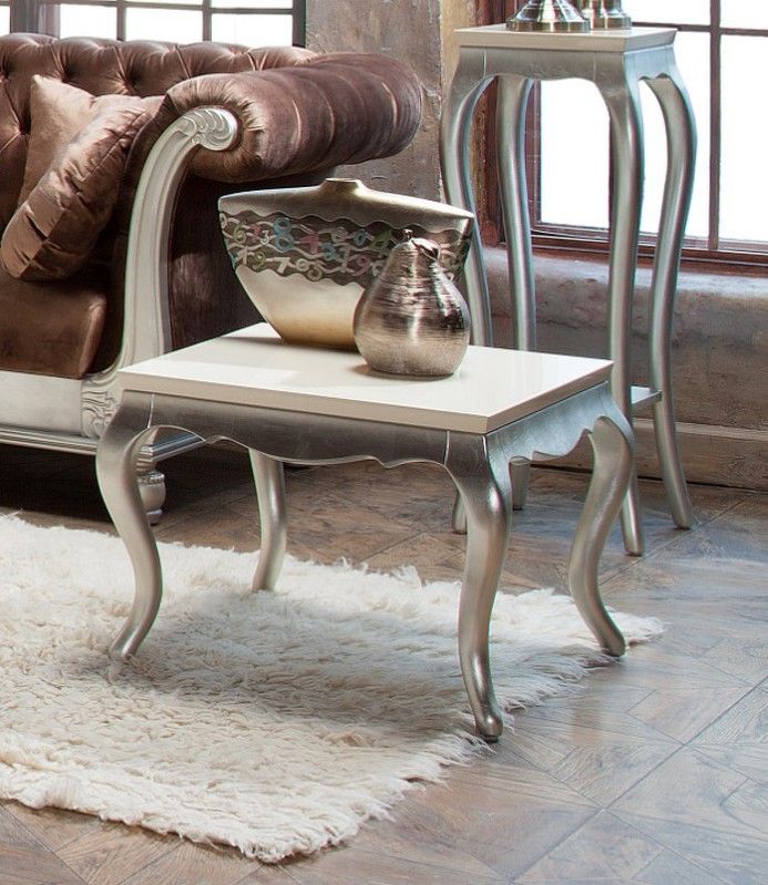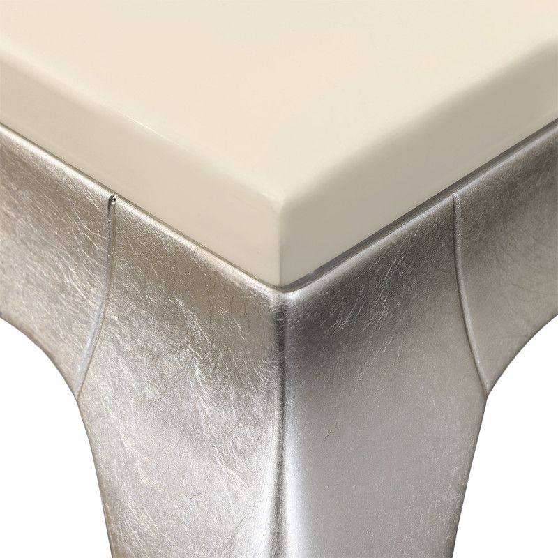 Отделка столешницы - перламутровый кремовый лак. Высокие гнутые ножки в отделке сусальное серебро, покрытое лаком шампань - ручное нанесение.
