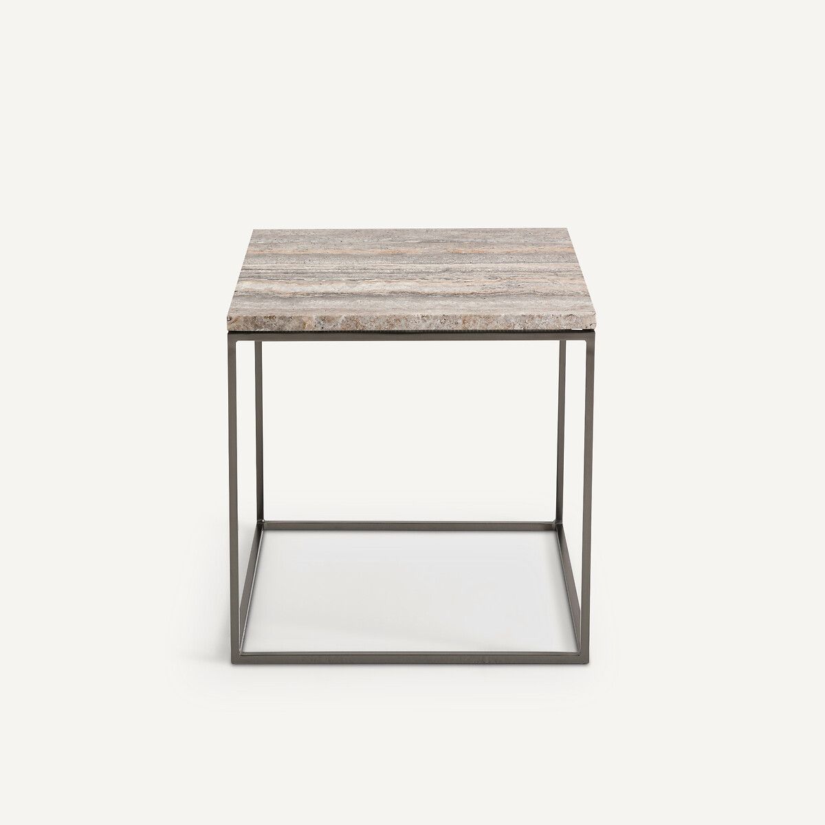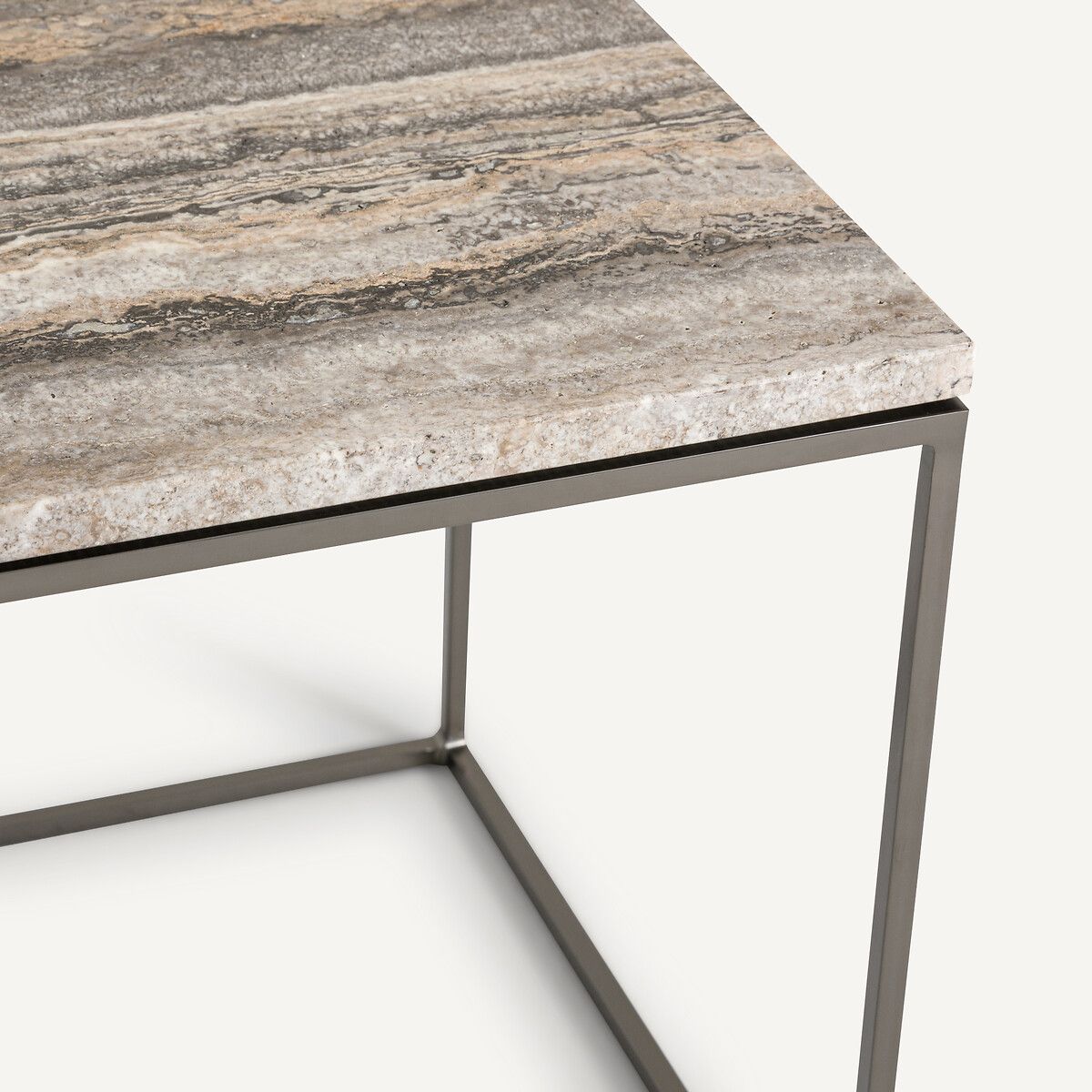 Элегантное и простое сочетание столешницы из серого травертина и каркаса из металла с черным покрытием под никель.