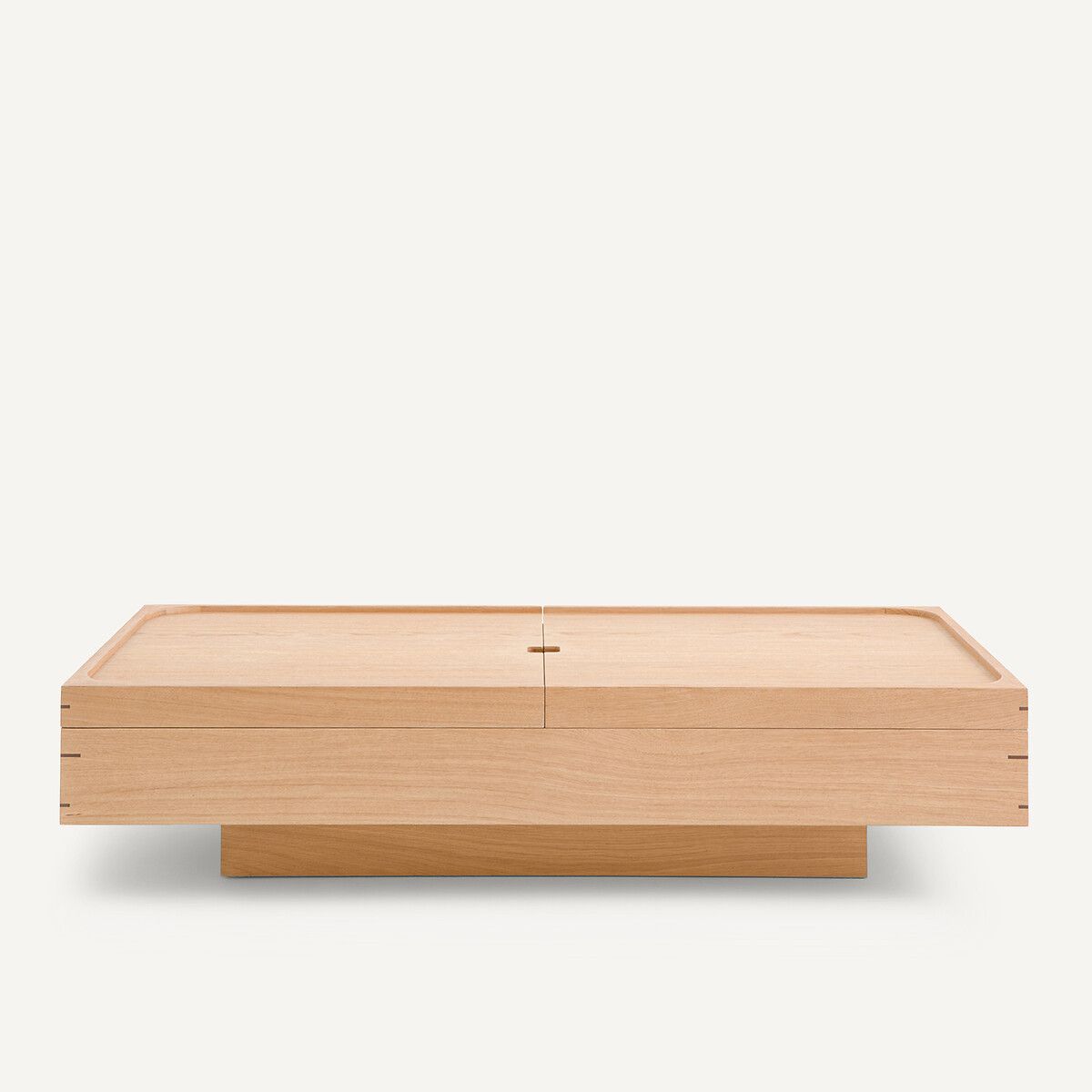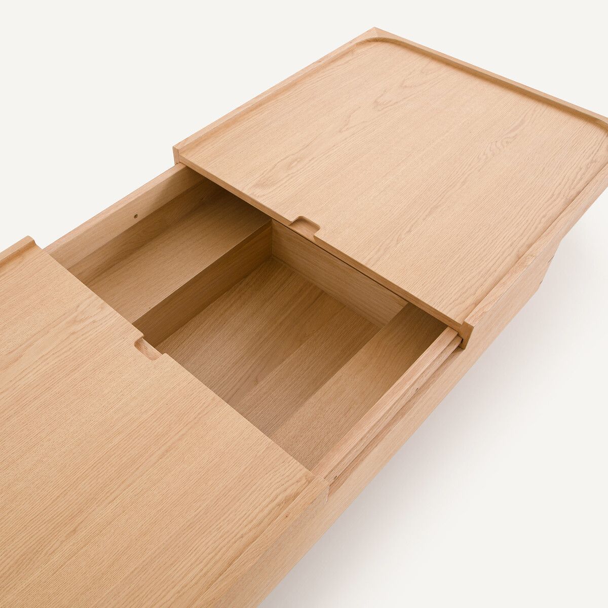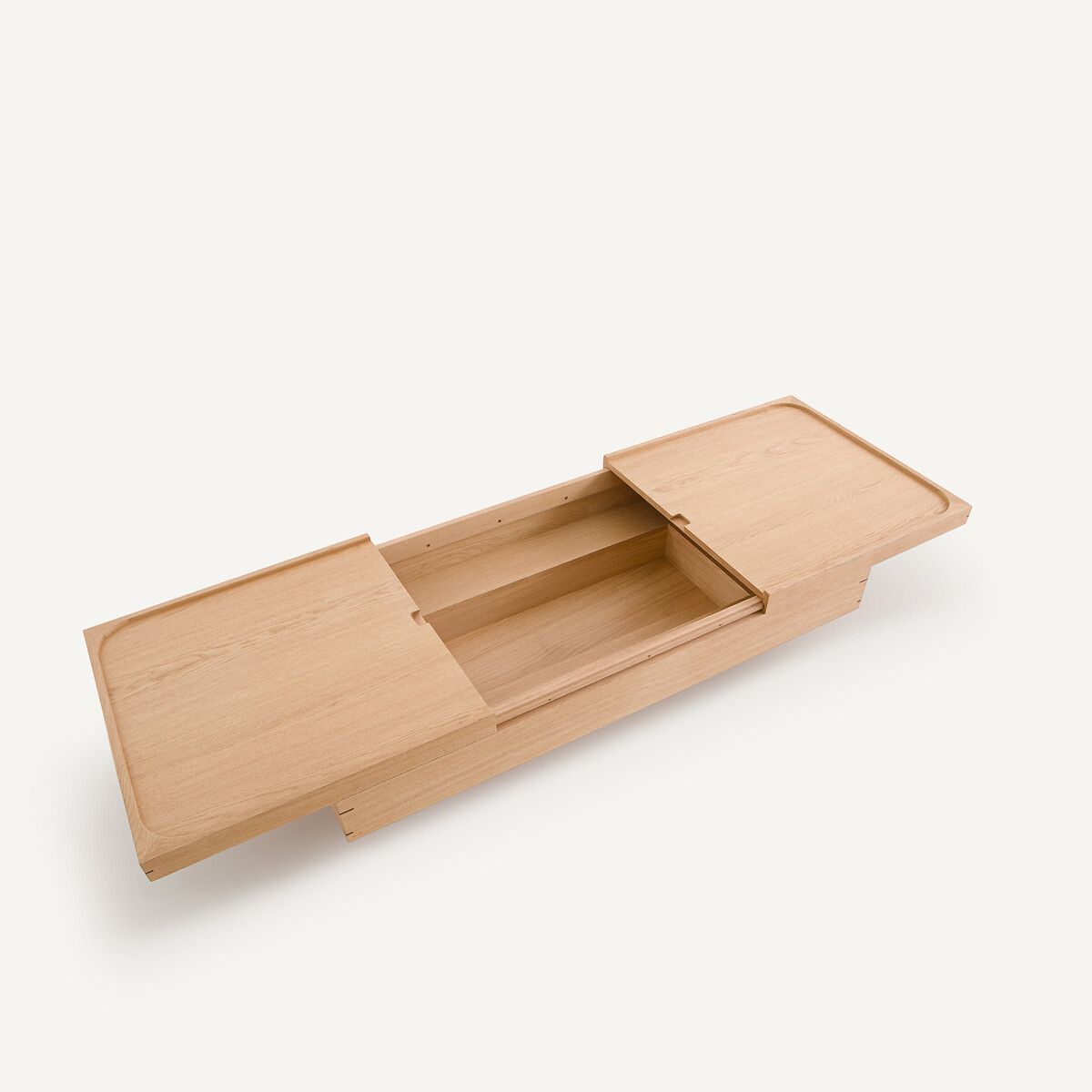 Раздвижная столешница и центральная ножка из МДФ, шпонированной дубом, покрытие ПУ-лаком.