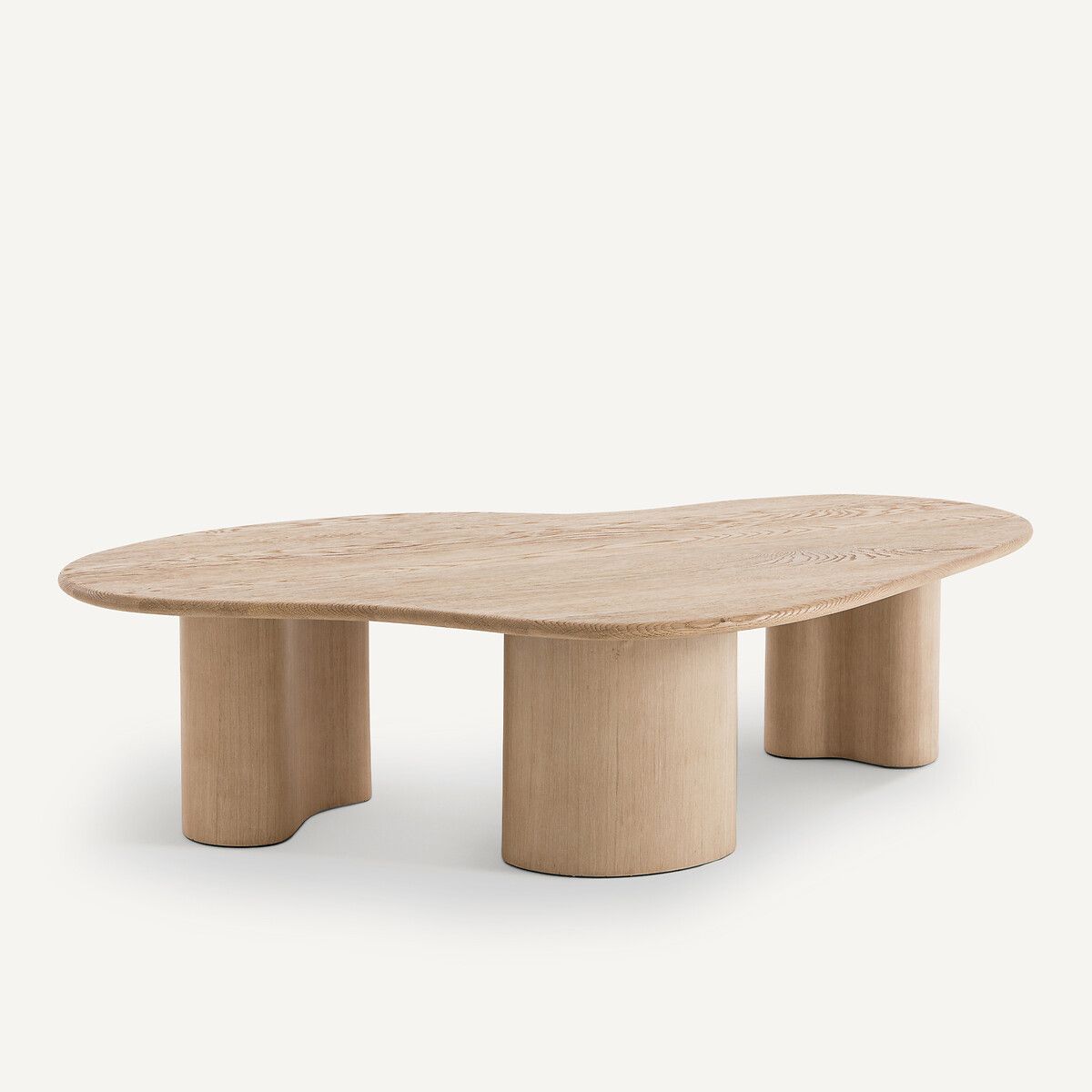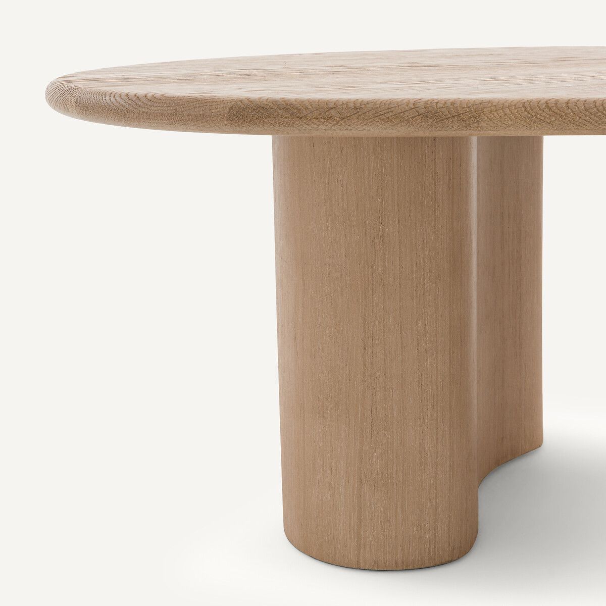 Волнистая столешница из массива дуба песочного цвета, рельефная на ощупь. Круглые и изогнутые ножки, все три разной формы. Совместно с диванным столиком Phlu они создадут элегантный дуэт.