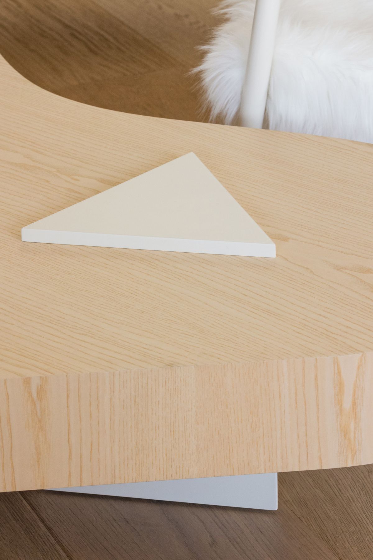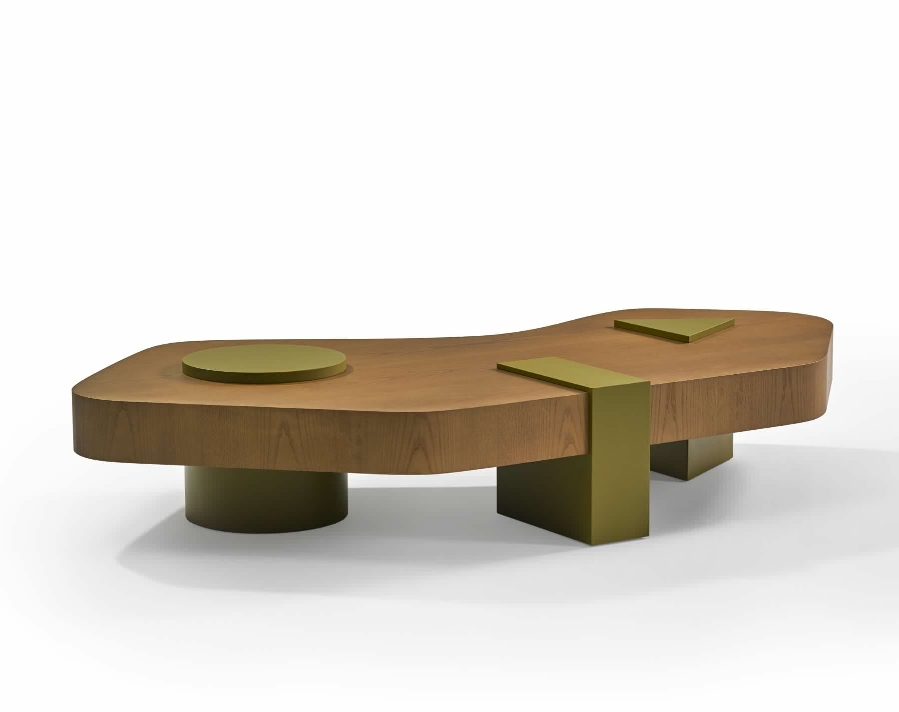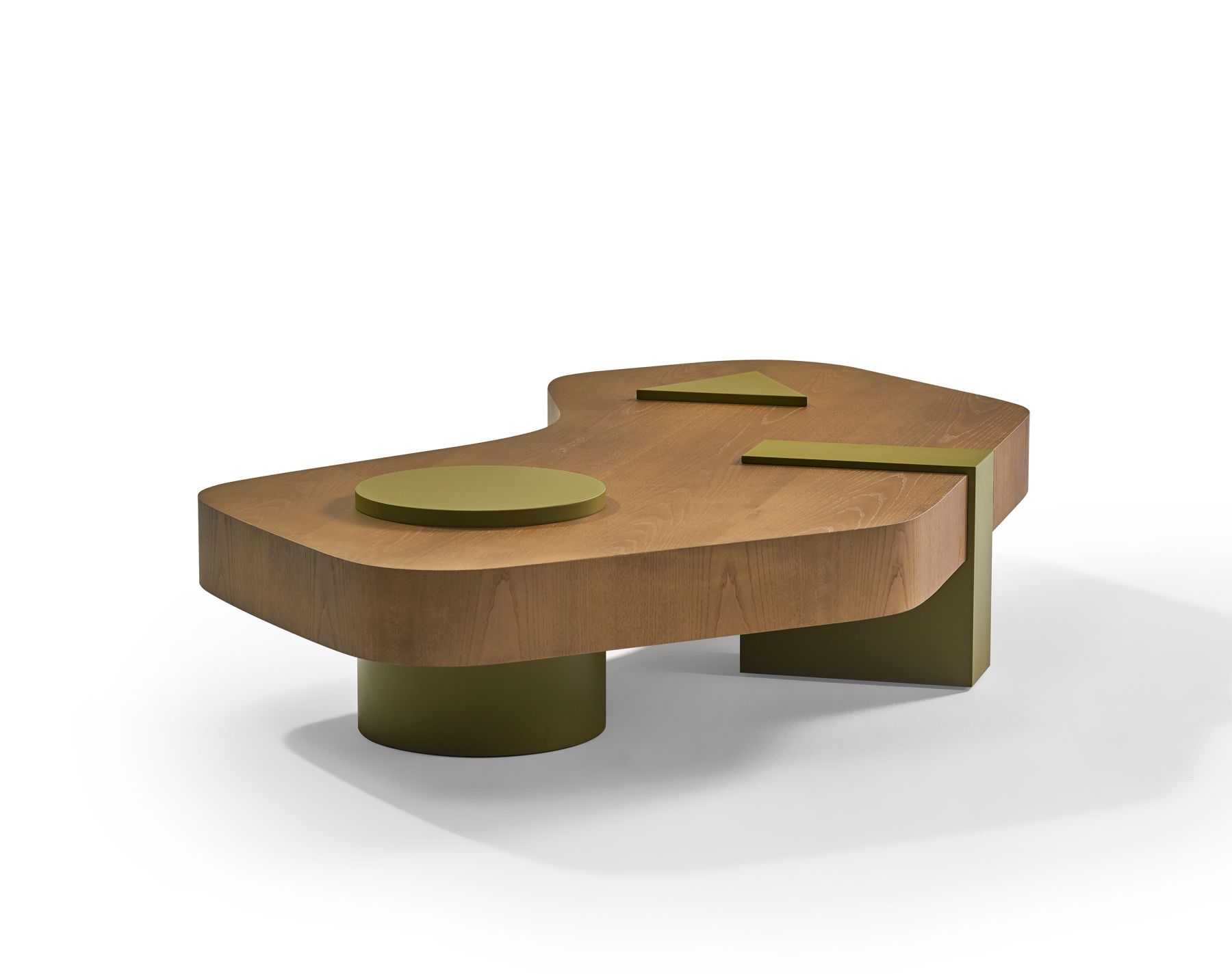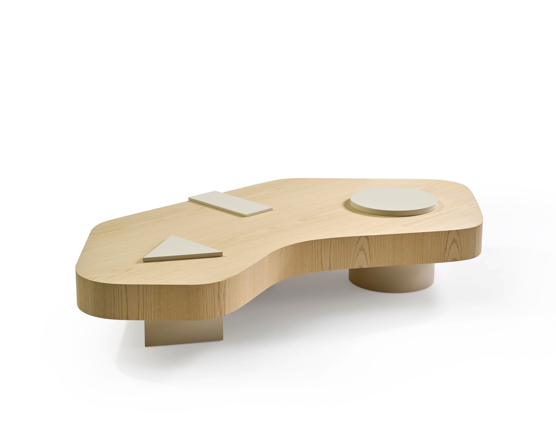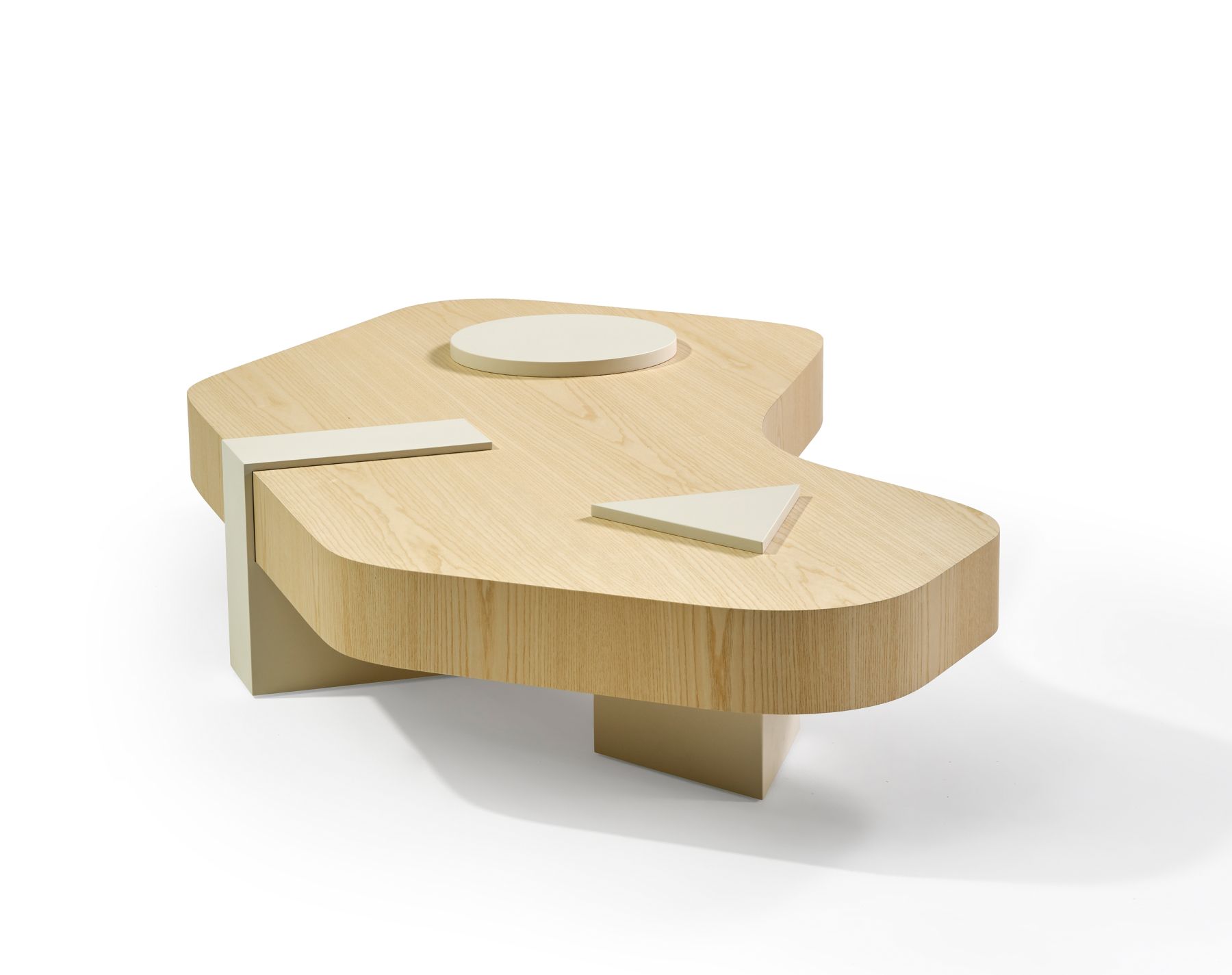 Bold - это стол смелых форм и размеров XL, разработанный студией Studiopepe. Верхняя часть характеризуется увеличенным профилем и неправильными очертаниями, в то время как из нее вытекают три основные геометрические формы (прямоугольник, круг и треугольник), создавая динамичную визуальную игру, поскольку каждая из них проявляется на разном уровне. Эти элементарные формы на самом деле являются ножками, которые появляются на поверхности, через которую они проходят.