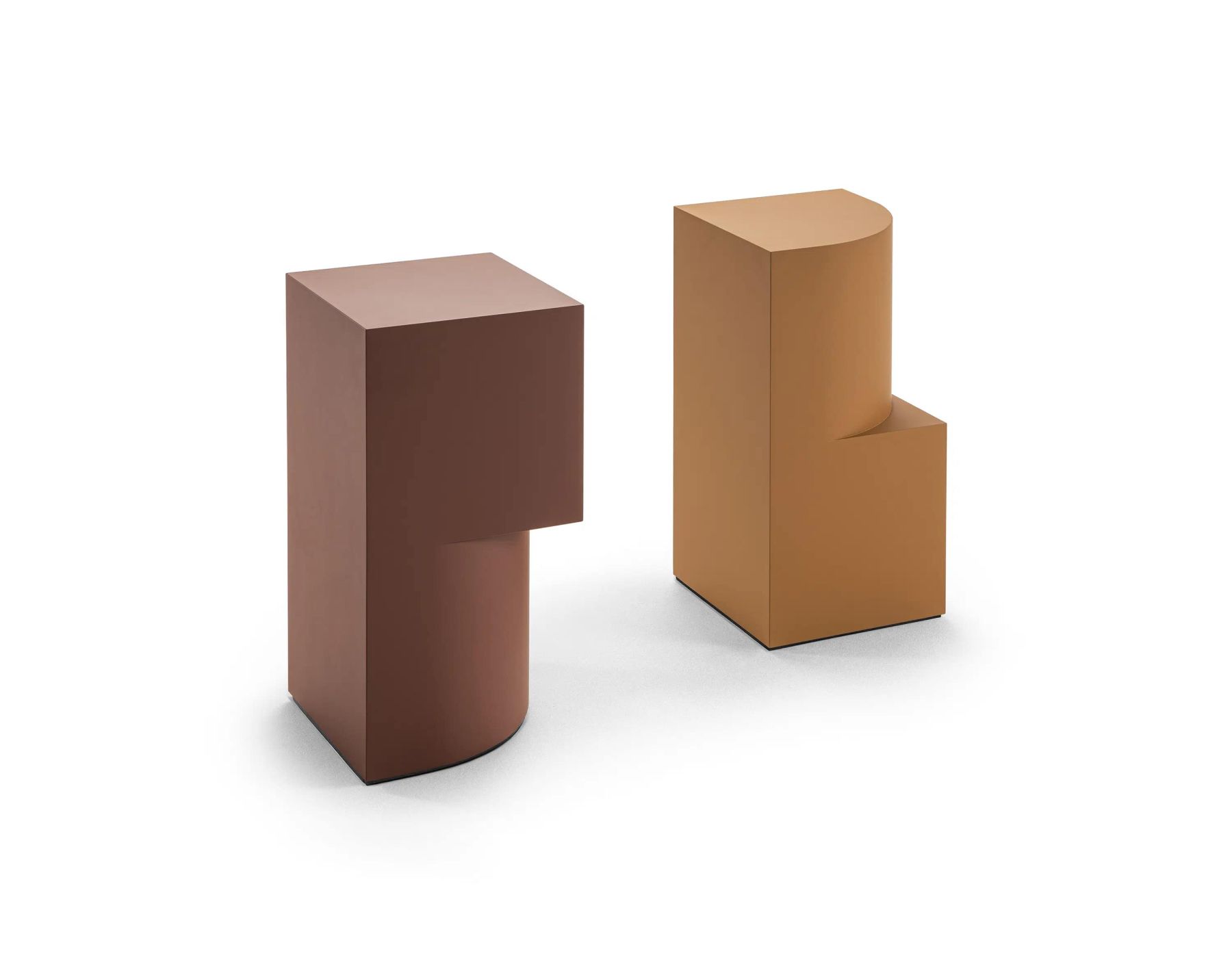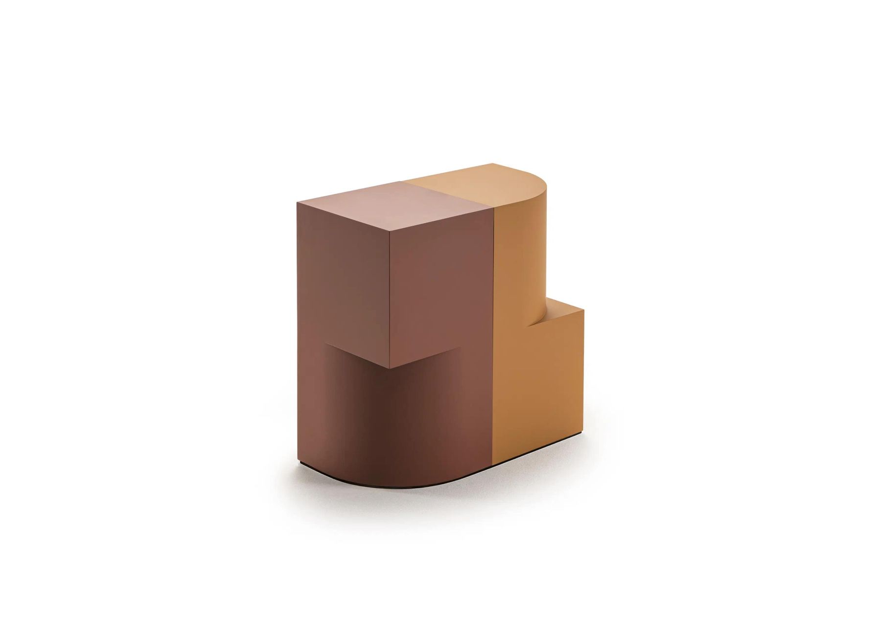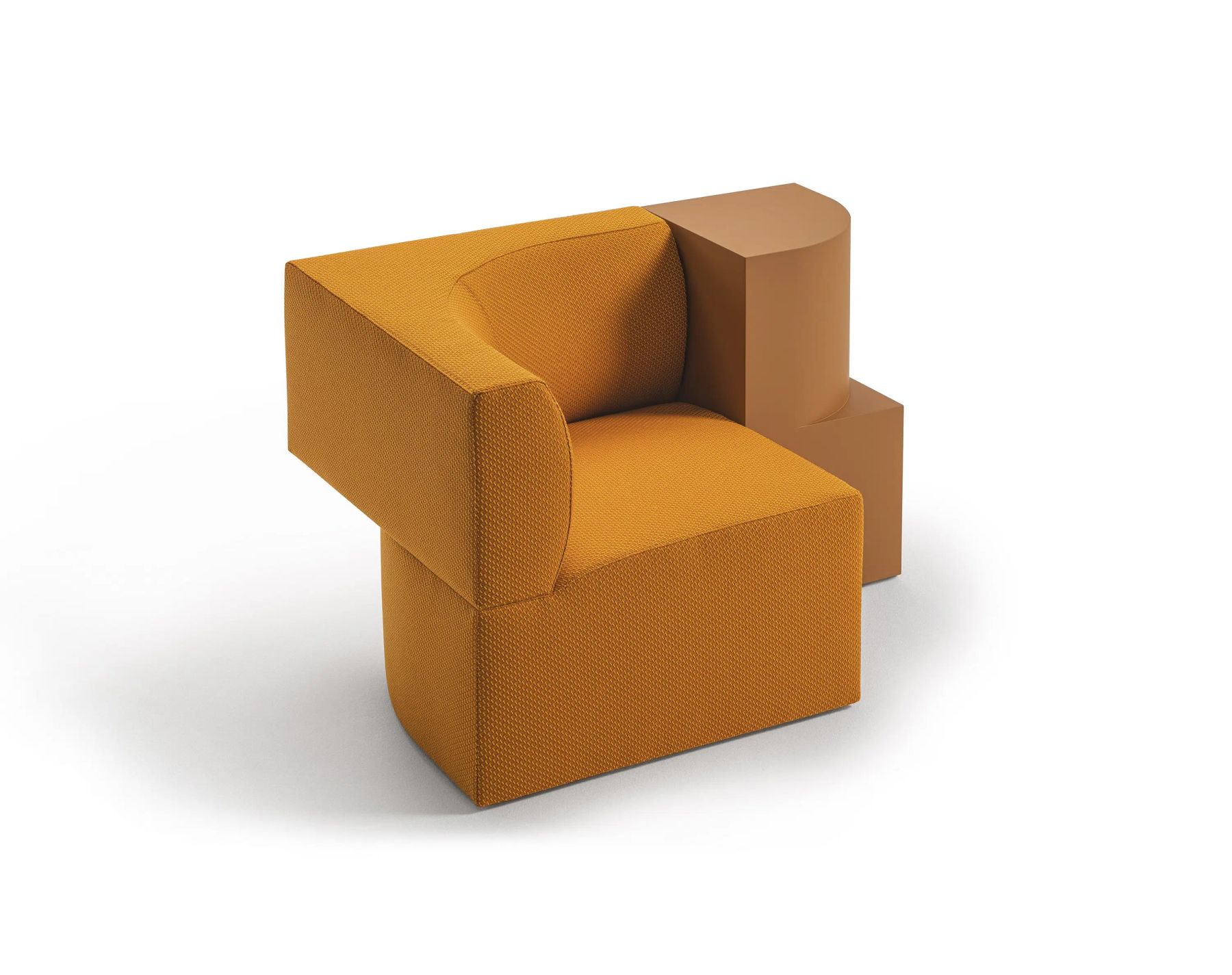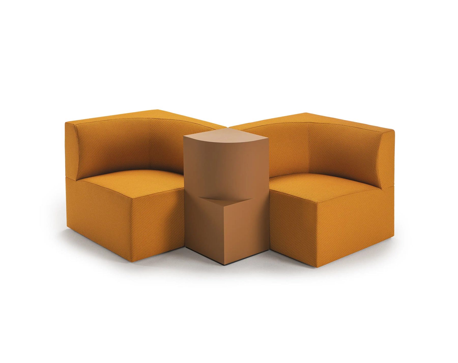 Каждый модуль, кажется, вылеплен непосредственно из камня в каменоломне: квадратный блок, прочный и компактный, разделен изогнутым срезом на две части, которые затем накладываются друг на друга, образуя спинку и сиденье. К нему прилагается тотемный столик. Практически монолитный дизайн стола сочетает в себе угловатые и округлые формы.