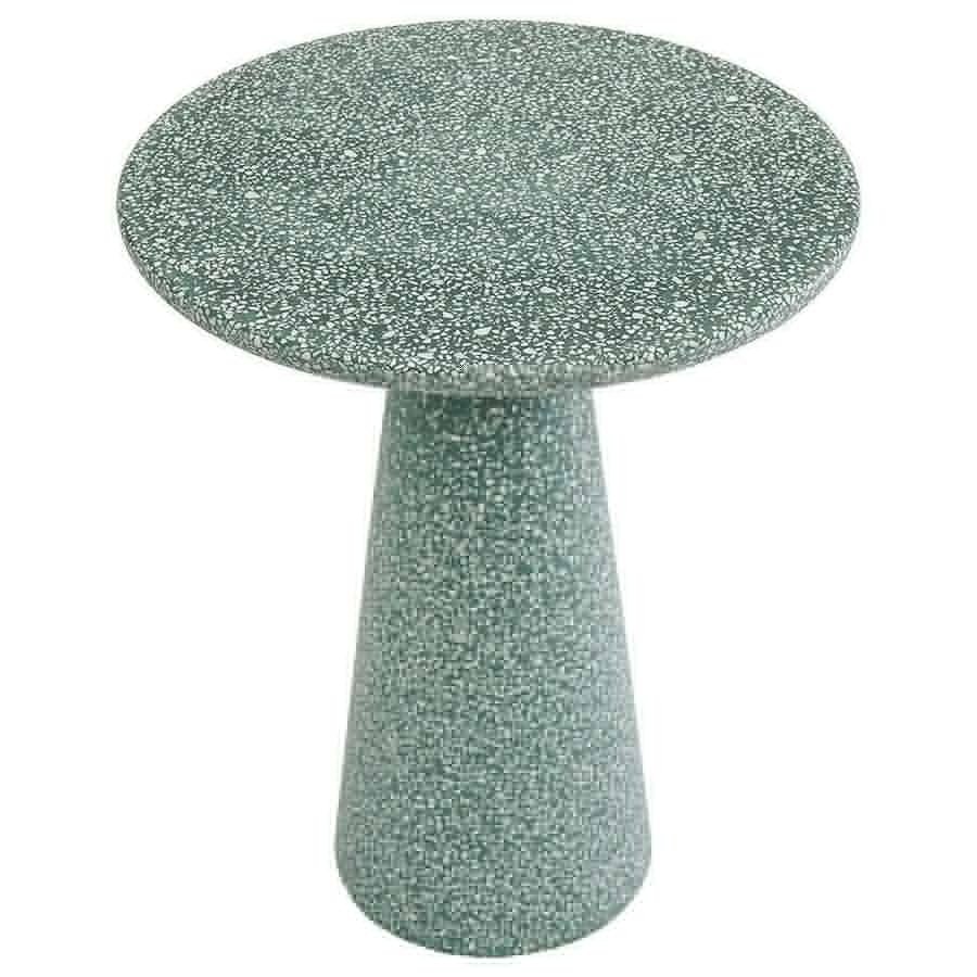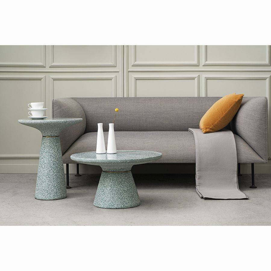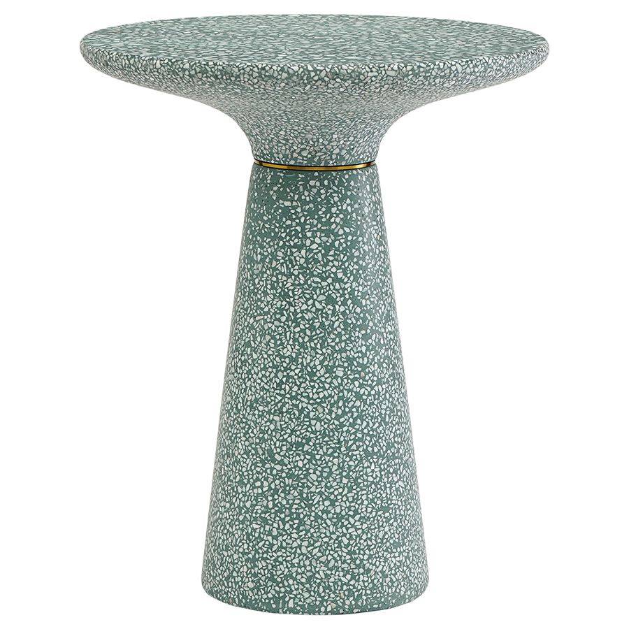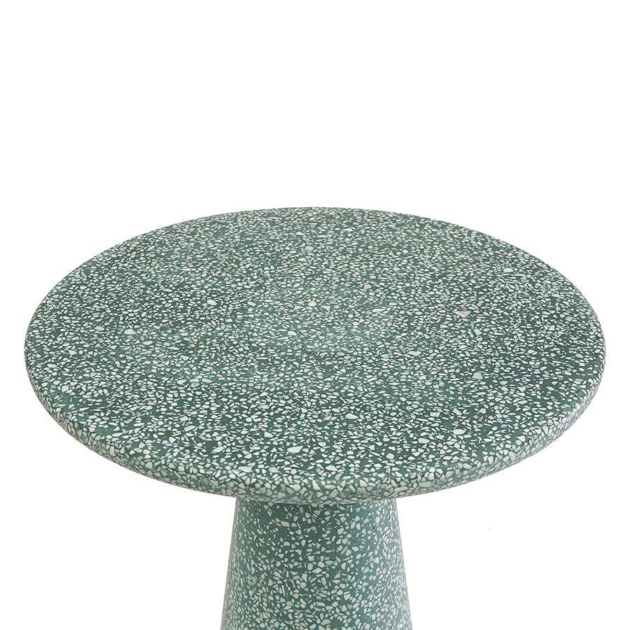 Столешница и основание столика выполнены из материала терраццо, характеризующегося высокой прочностью и устойчивостью к износу. В его состав входят мелкие кусочки натурального камня, скрепленные цементным раствором с добавлением пластификаторов. Поверхность терраццо гладкая, приятная на ощупь, прекрасно смотрится и не требует сложного ухода. Столешница диаметром 45 см позволяет размещать все необходимое — чашки кофе, десерты и прочее. При этом модель имеет компактные размеры, что способствует экономии полезного пространства.