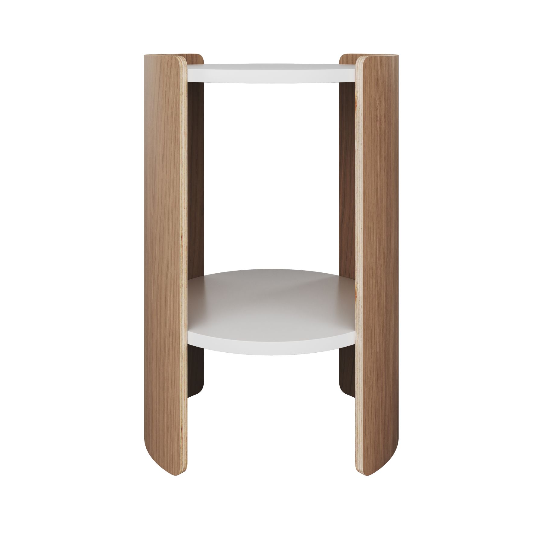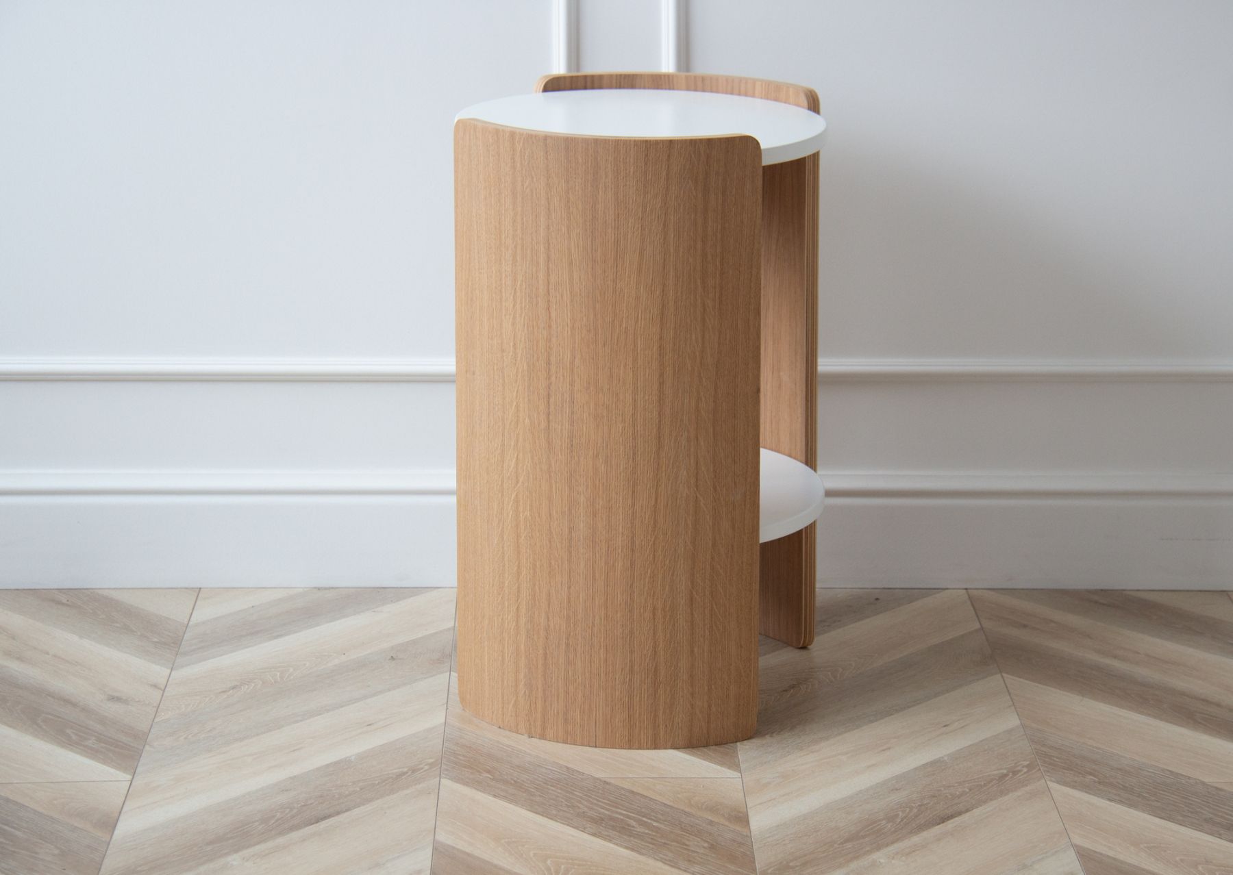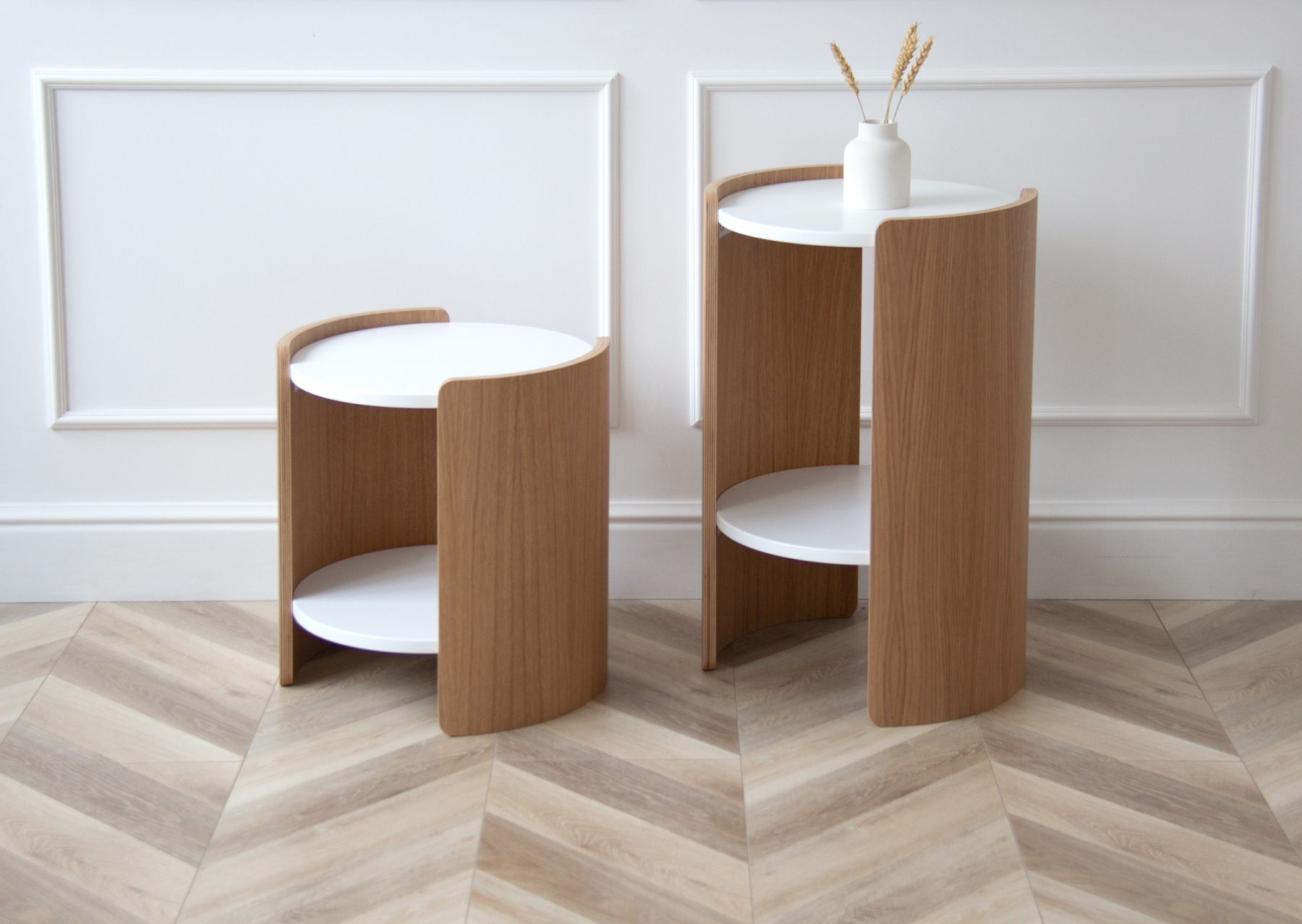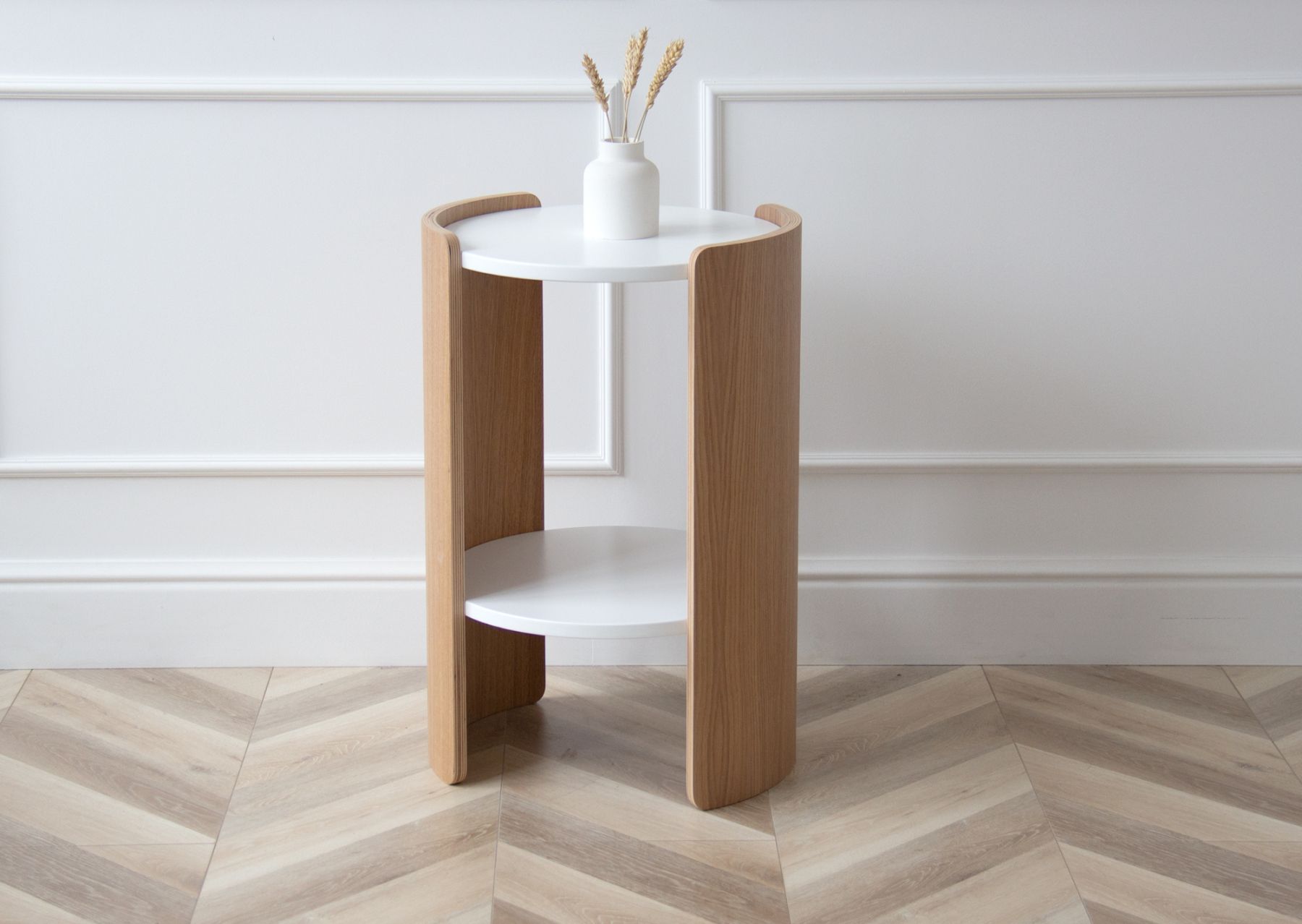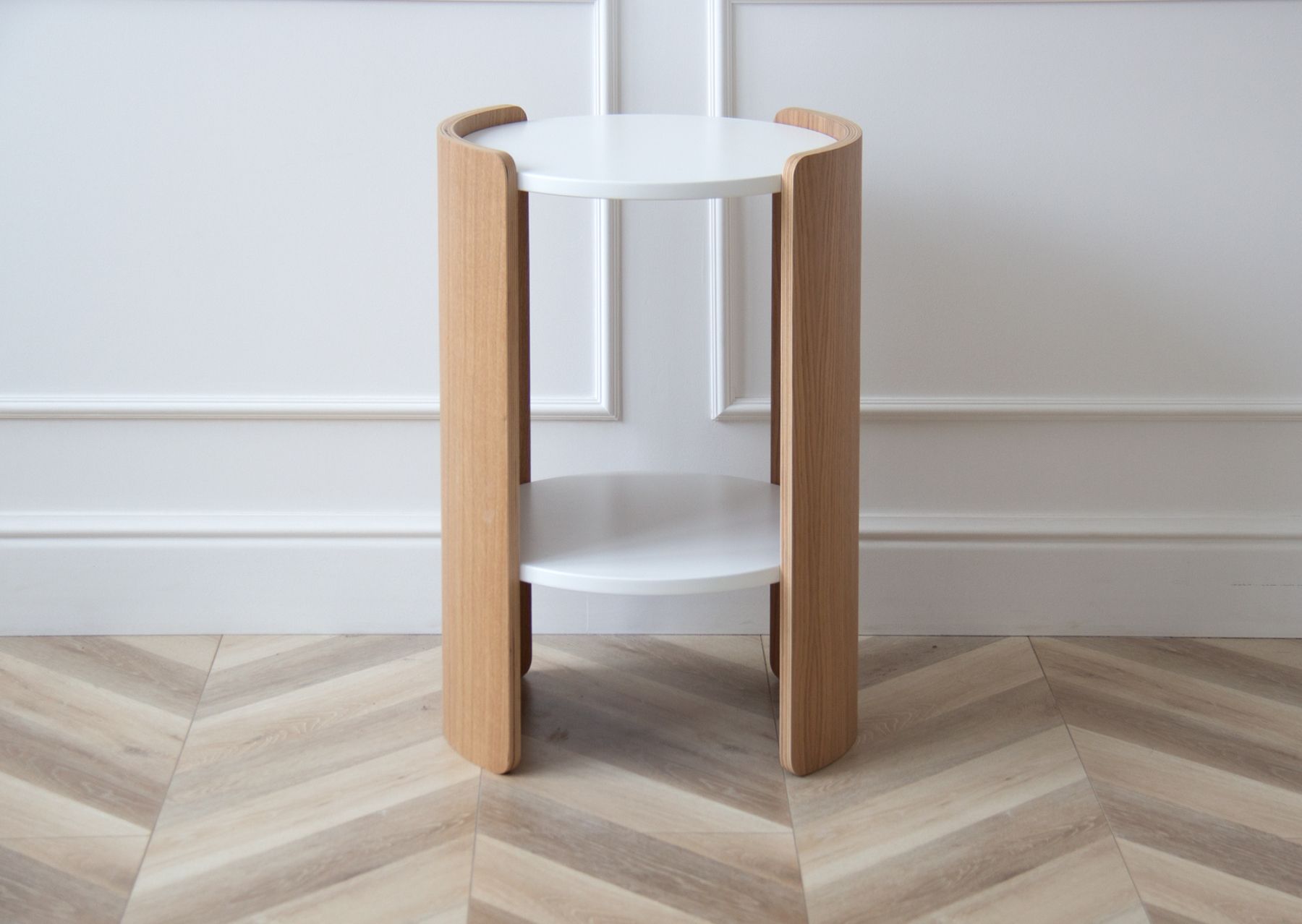 При производстве используется шпон дуба, покрытие белый полупрозрачный лак, столешница под эмалью