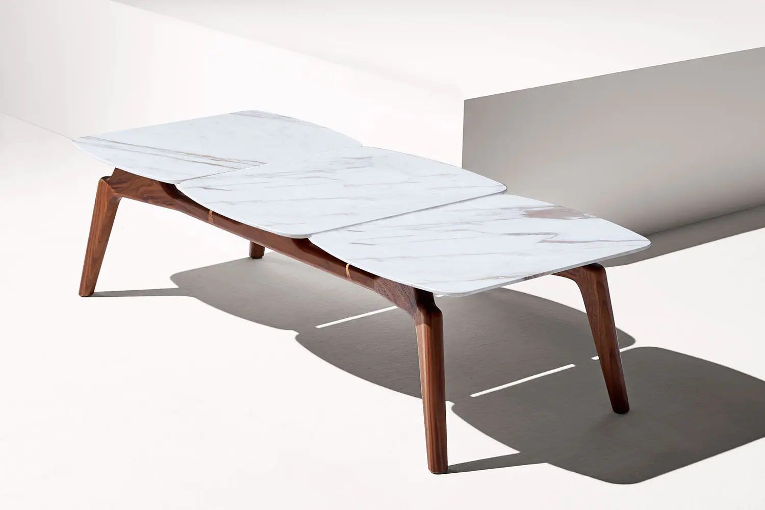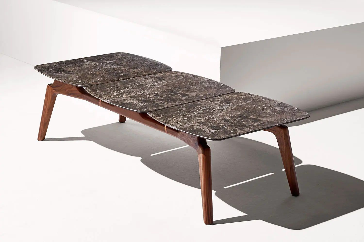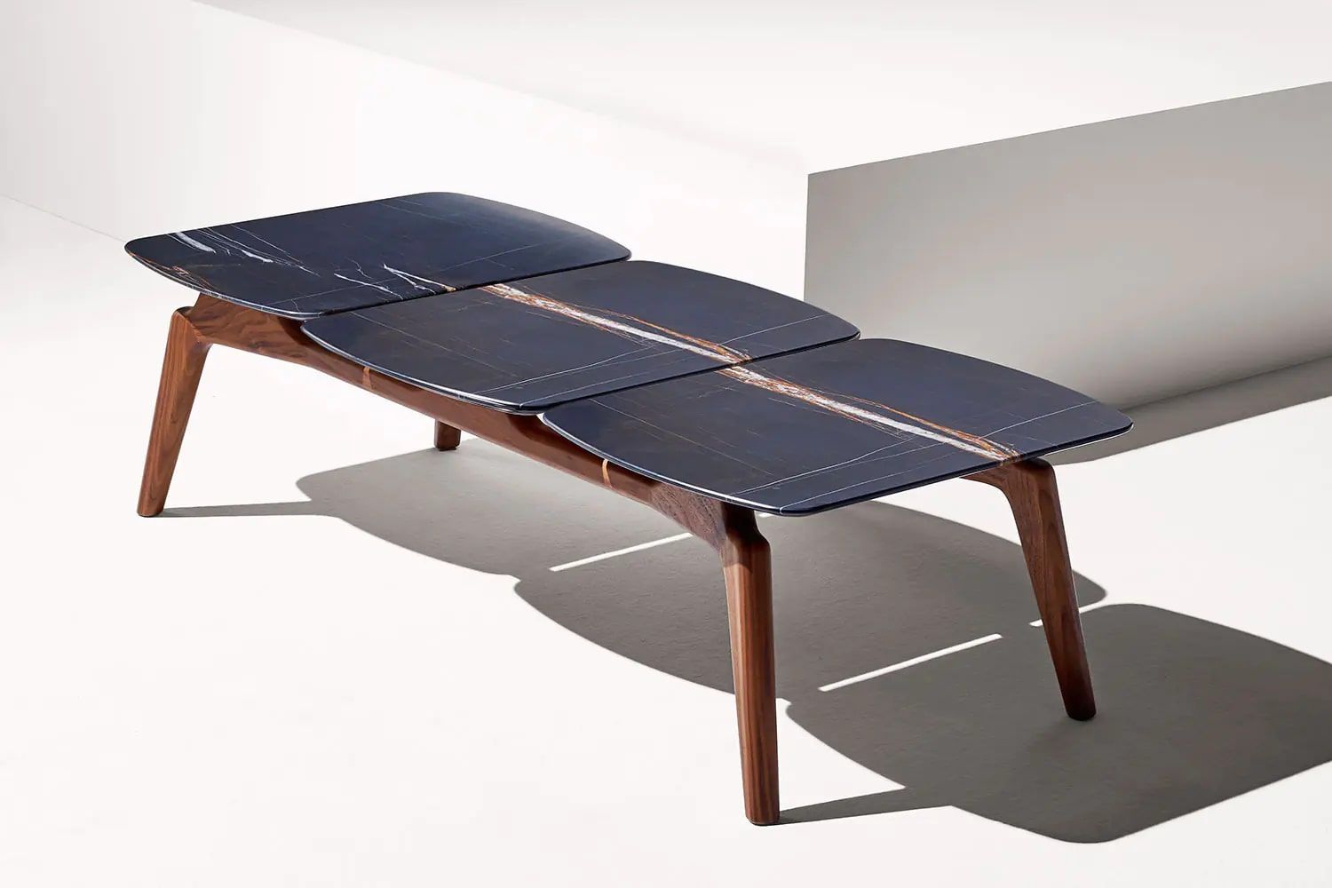Его привлекательный дизайн позволяет конфигурировать столы разных размеров, сочетая орех с золотом Calacatta, мрамором Sahara Noir или Emperador.