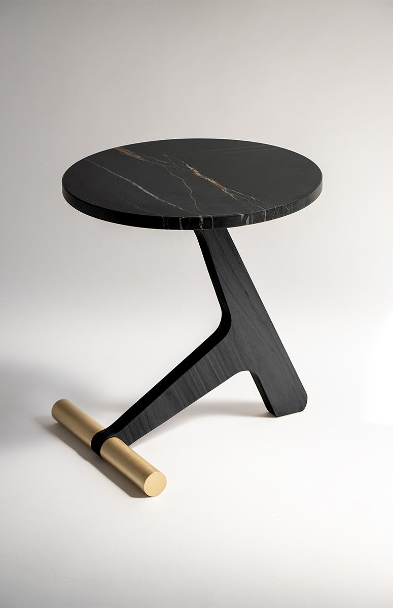 Произведение, производящее сильное визуальное впечатление, где стол опирается на металлическое основание и цельный деревянный корпус, достигая полного равновесия объекта.