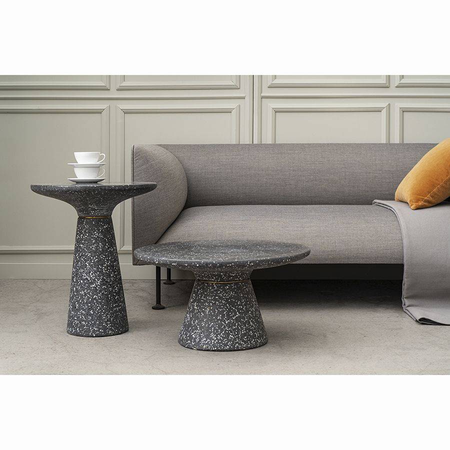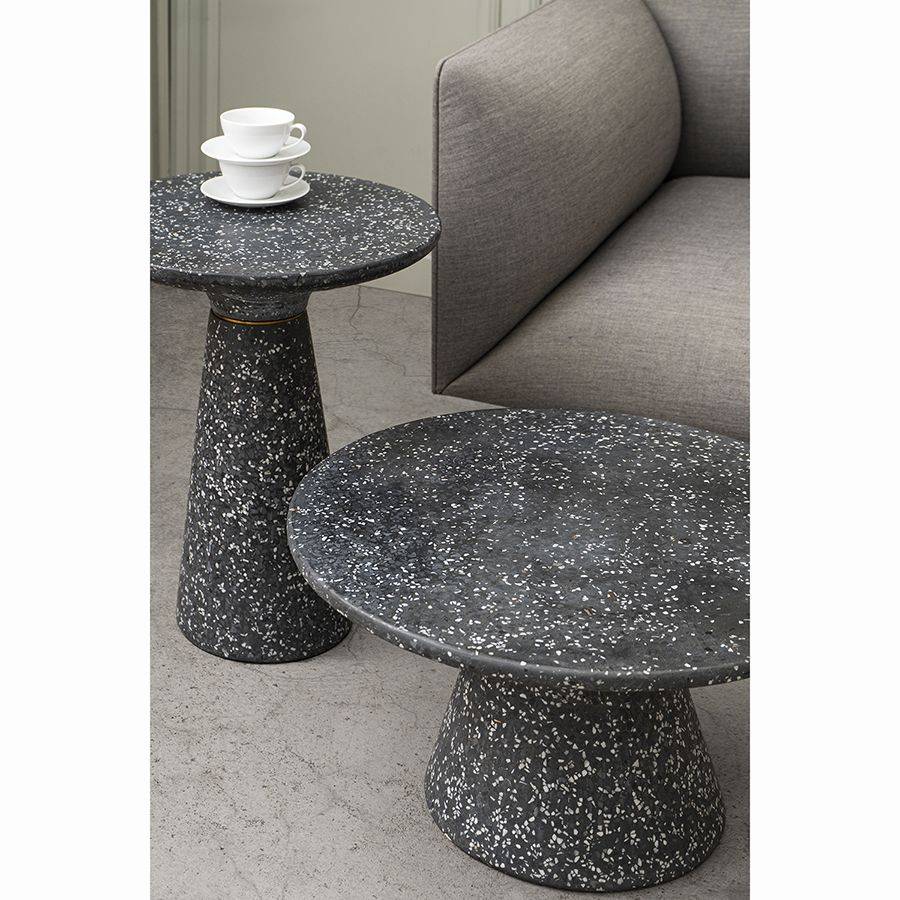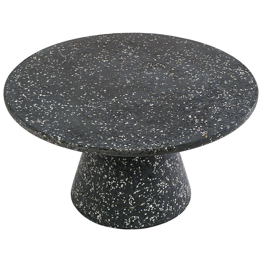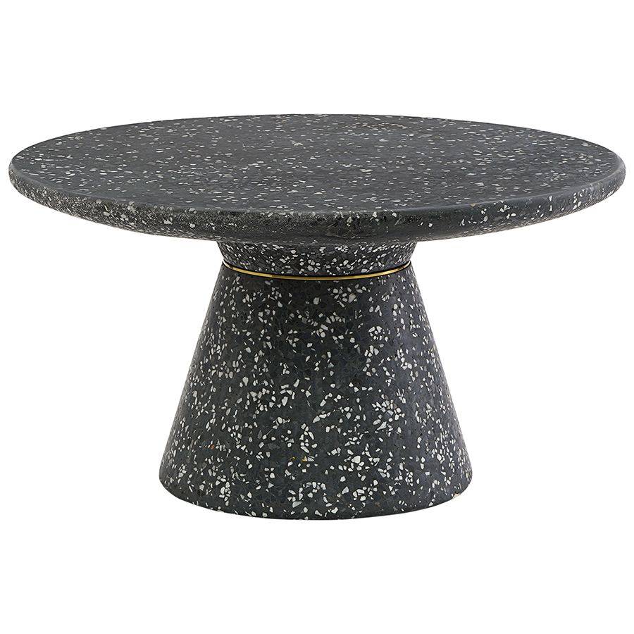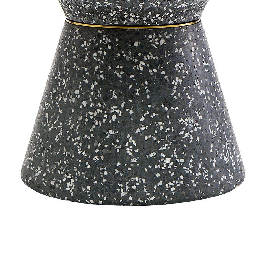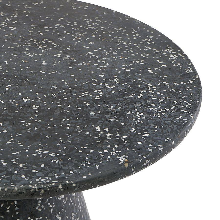 Столешница и основание столика выполнены из материала терраццо, характеризующегося высокой прочностью и устойчивостью к износу. В его состав входят мелкие кусочки натурального камня, скрепленные цементным раствором с добавлением пластификаторов. Поверхность терраццо гладкая, приятная на ощупь, прекрасно смотрится и не требует сложного ухода. Столешница диаметром 60 см позволяет размещать все необходимое — от чашек кофе до любимых книг и декора. При этом модель имеет компактные размеры, что способствует экономии полезного пространства.