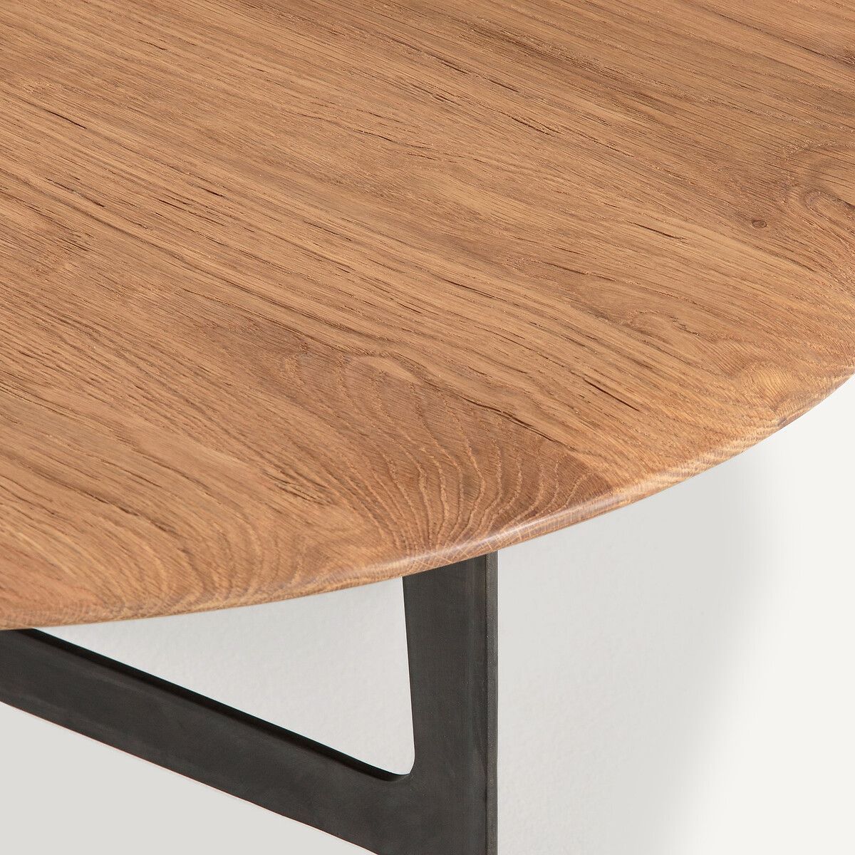 Поверхность столешницы из дубового массива очищена при помощи пескоструйной обработки. Металлические ножки искусственно состарены для придания изделию характера.